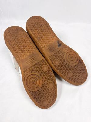 Signature pair of sneakers by Maison Margiela denoted as “replica”, as they are modeled after the German Army Trainers (GAT) and the silhouette roots extend back to the 1970s. This stunning pair of the most adored OG variation of Maison Margiela GAT Replicas feature two different tones of beautiful white on the upper with a rubber sole. Features the iconic Maison Margiela number labeling on the tongue in suede. In pristine condition with no flaws, still has a new touch (very slight heel drag). Comes with the original box, shoe covers, along with the receipt