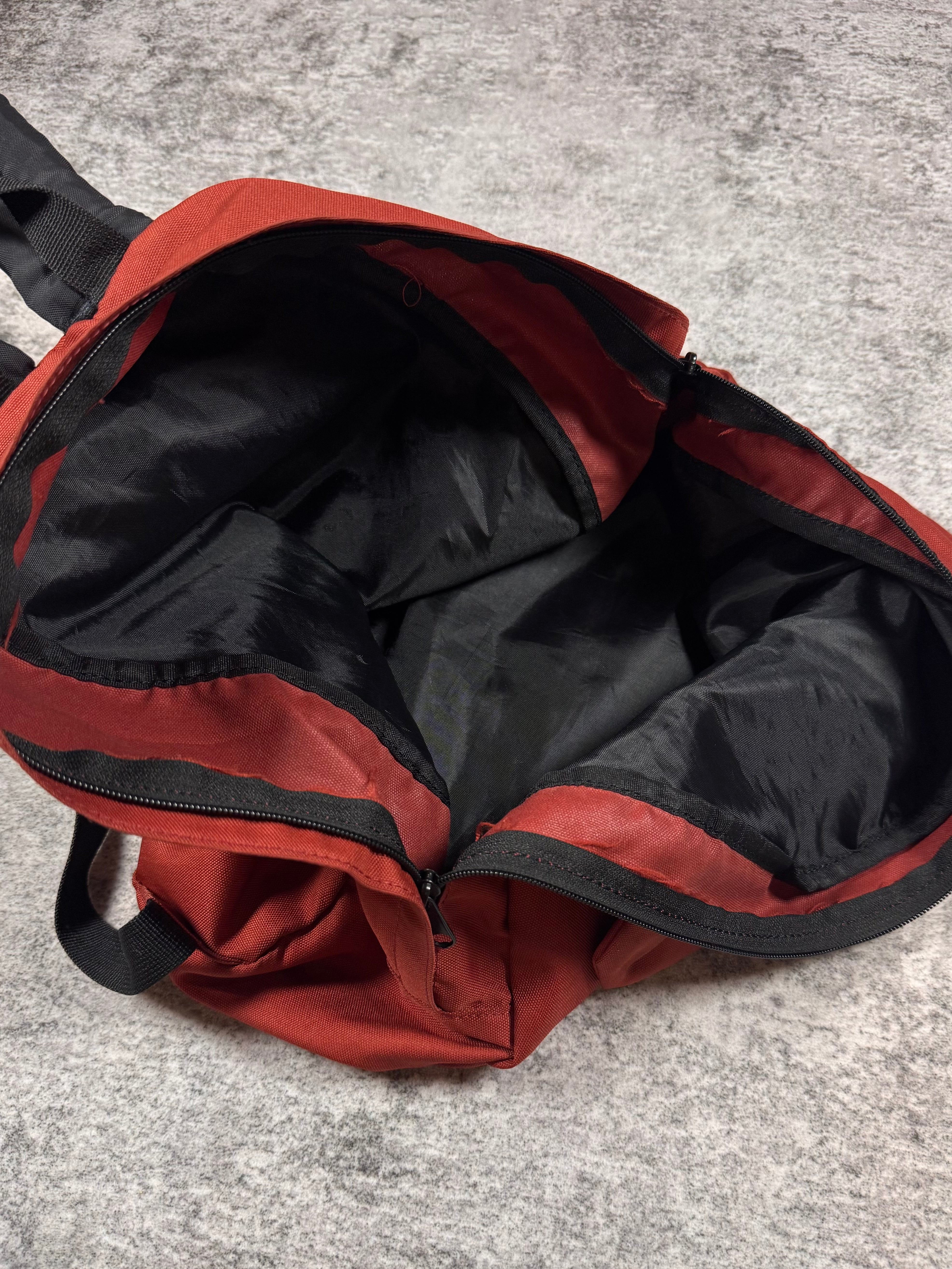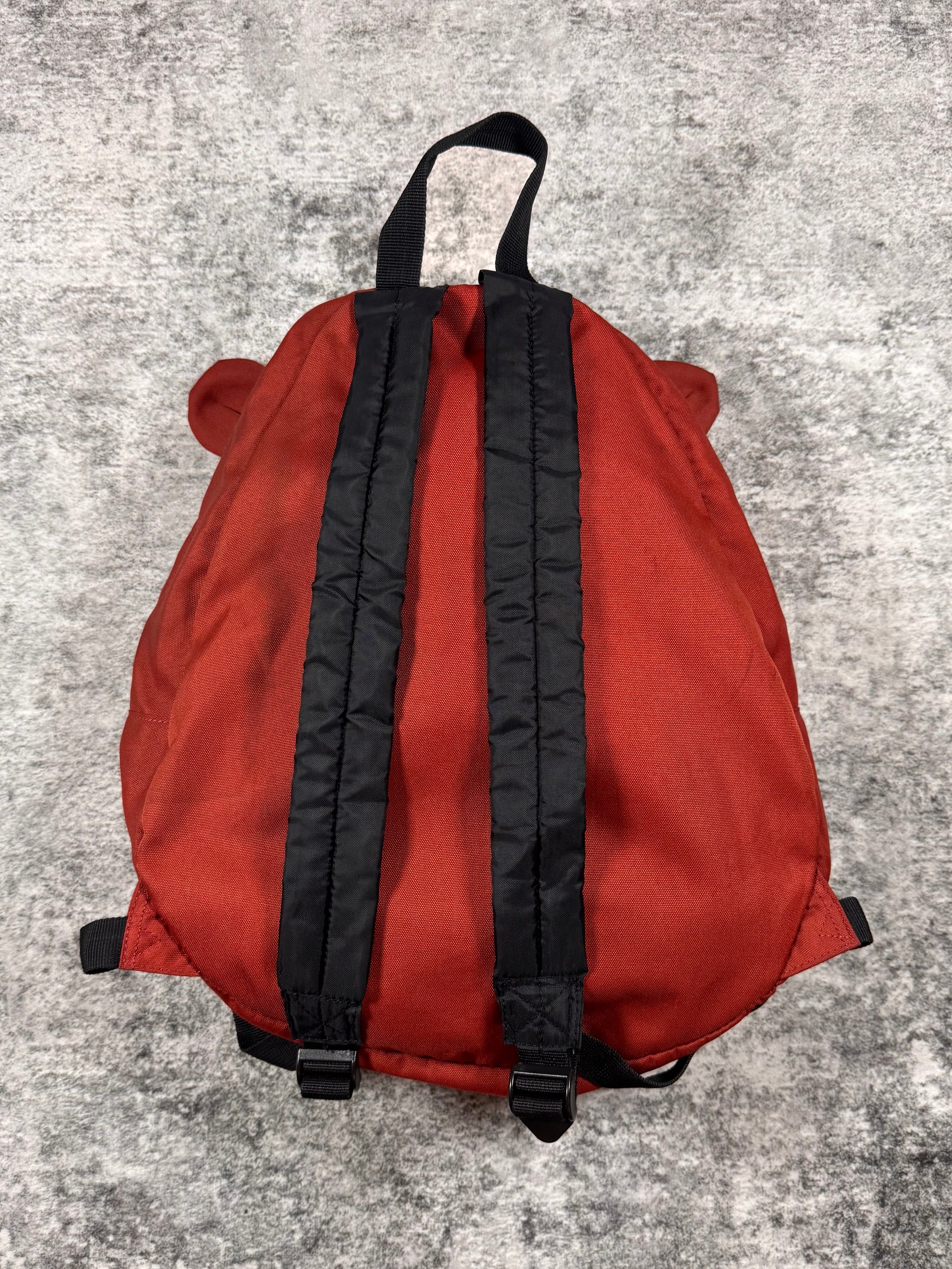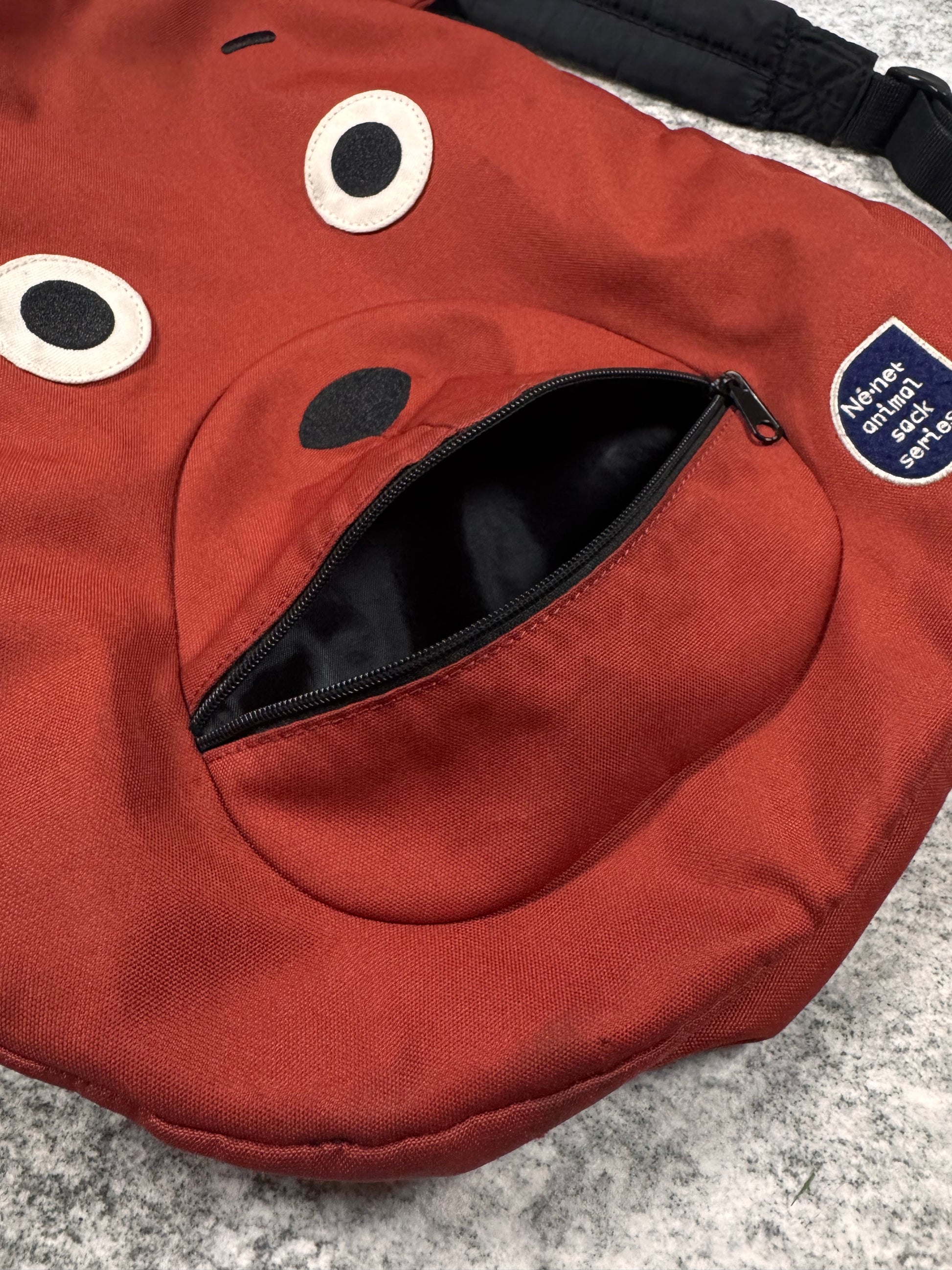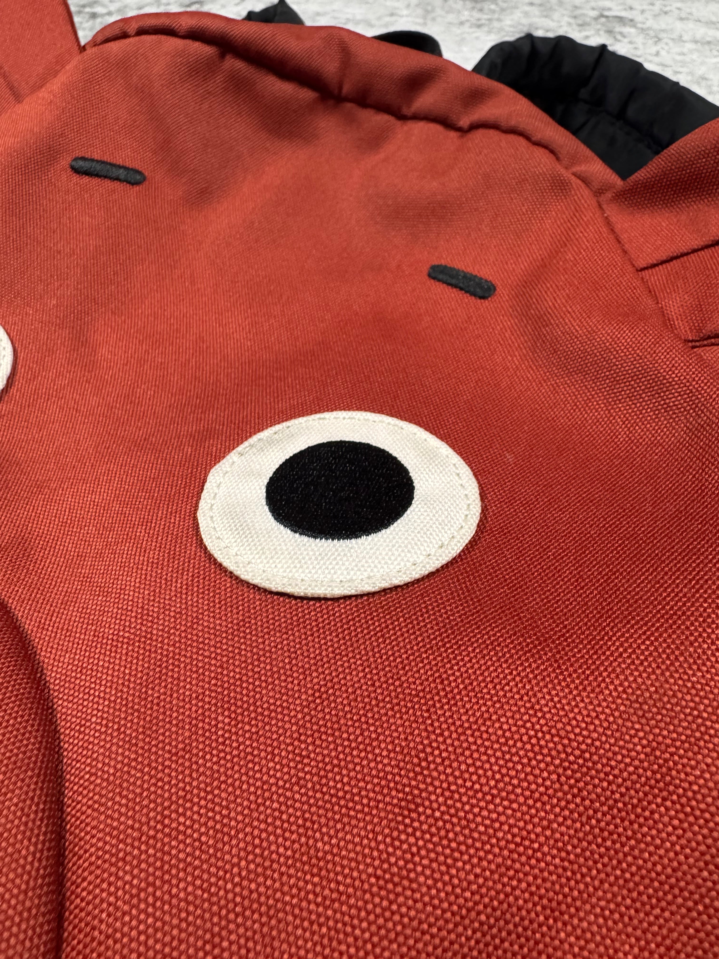 This playful backpack was released in 2014 as part of a ‘Animal Sack Series’, where Takashima released these backpacks with various different animal faces. This backpack comes in a red color way in the shape of a bear with ears at the top. Exterior pocket is accessed through a zipper on the mouth, adding a quirky and functional touch. One main spacious storage compartment. In solid condition with no major flaws