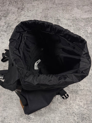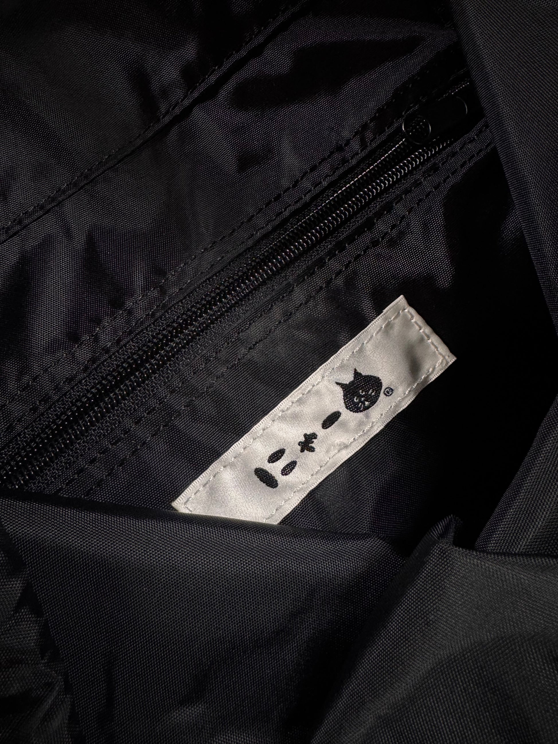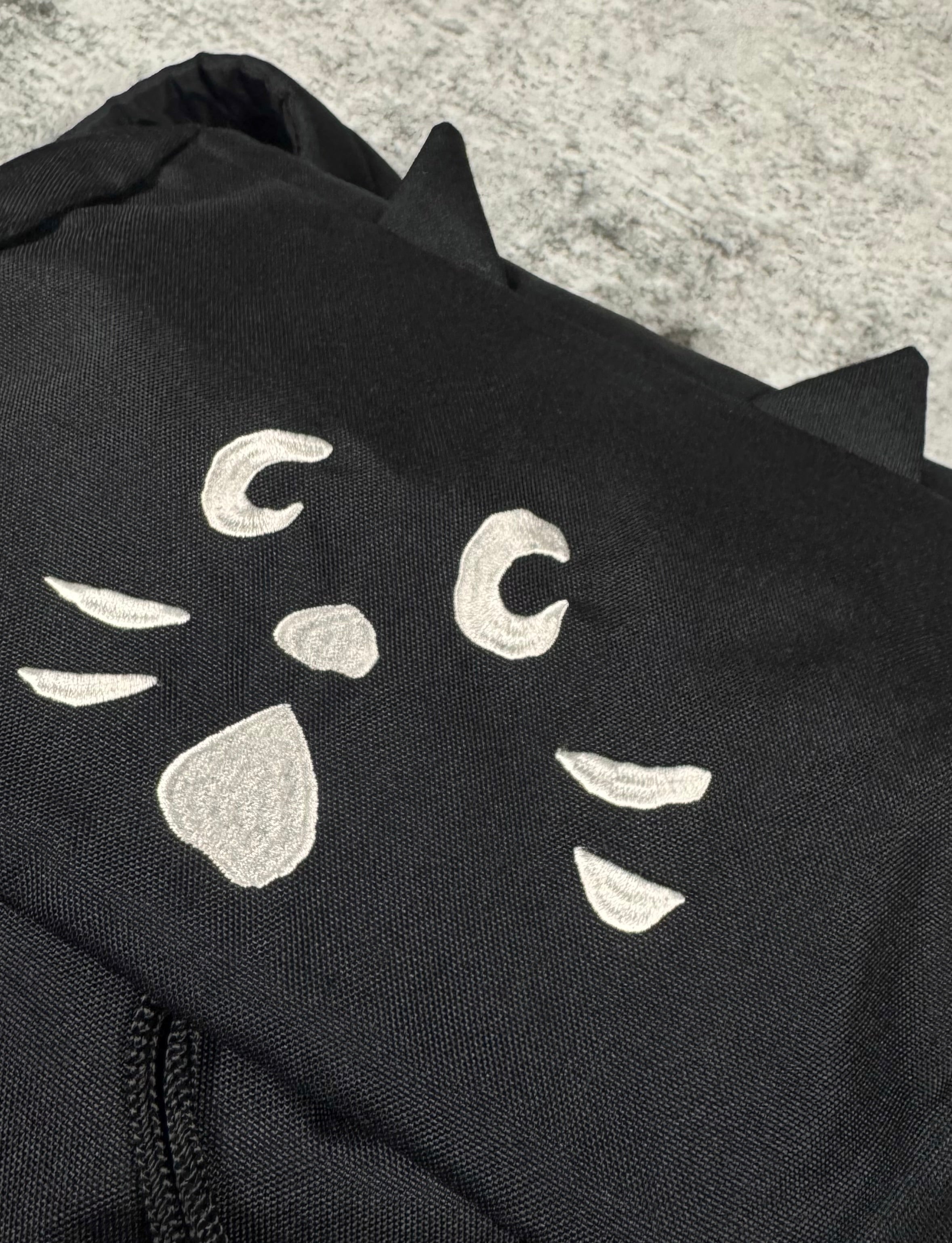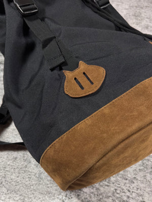 This spacious backpack coming in a black color way features a playful white "Nya" cat embroidery on the front flap with the triangular ears at the top. Brown suede bottom with two cat shaped suede patches. Drawstring closure with a buckle for added security. Spacious main storage compartment with small zipper pocket in the inner. Secret zipper on the side. In very good condtion, no major flaws or damages