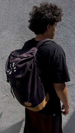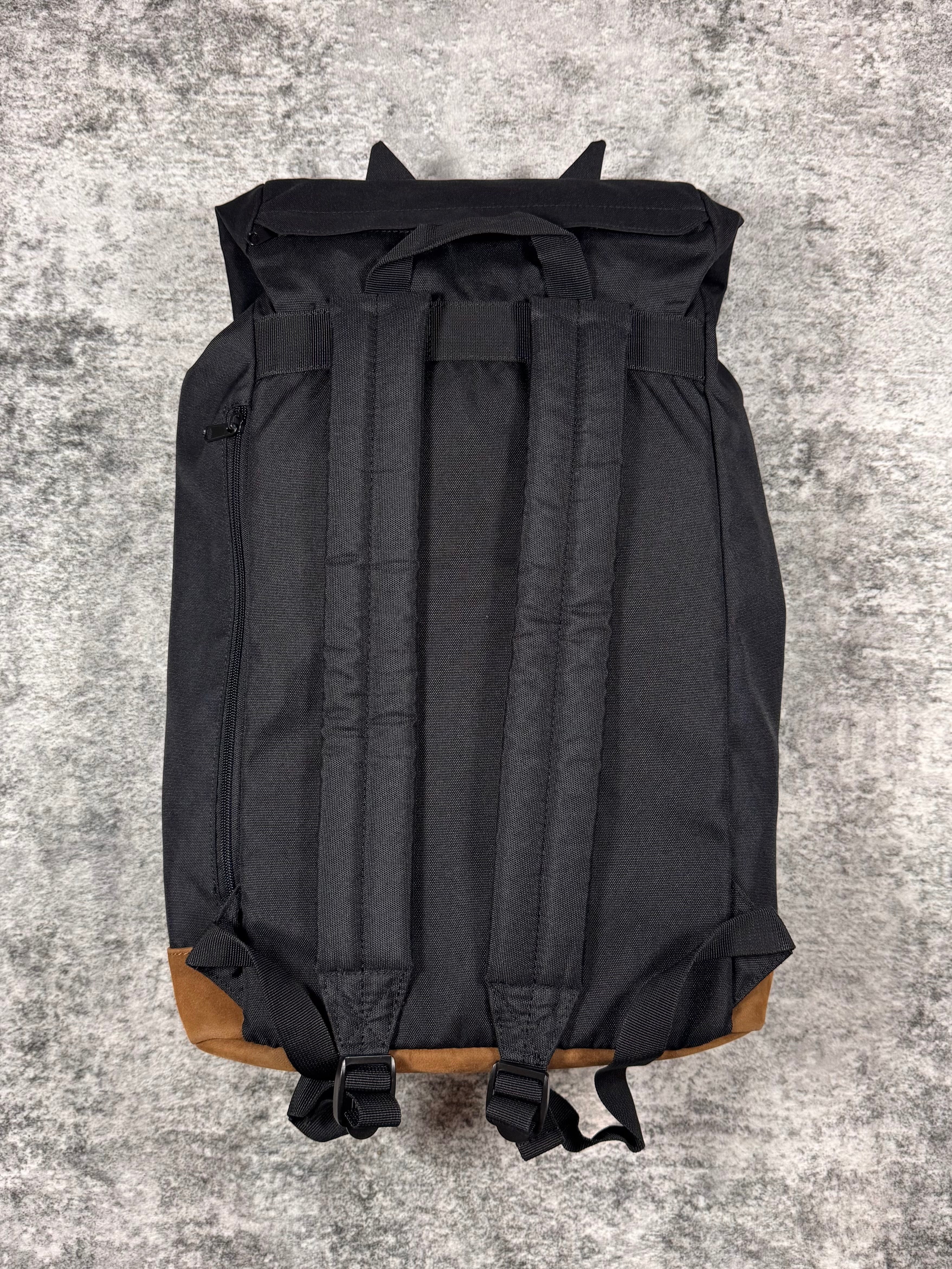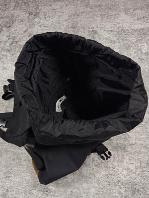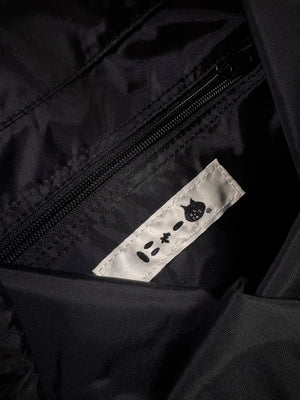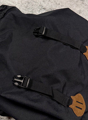 Spacious backpack coming in a black color way features a playful white "Nya" cat embroidery on the front flap with the triangular ears at the top. Drawstring closure with a buckle for added security. Spacious main storage compartment with small zipper pocket in the inner. Secret zipper on the side. In good condition, no flaws