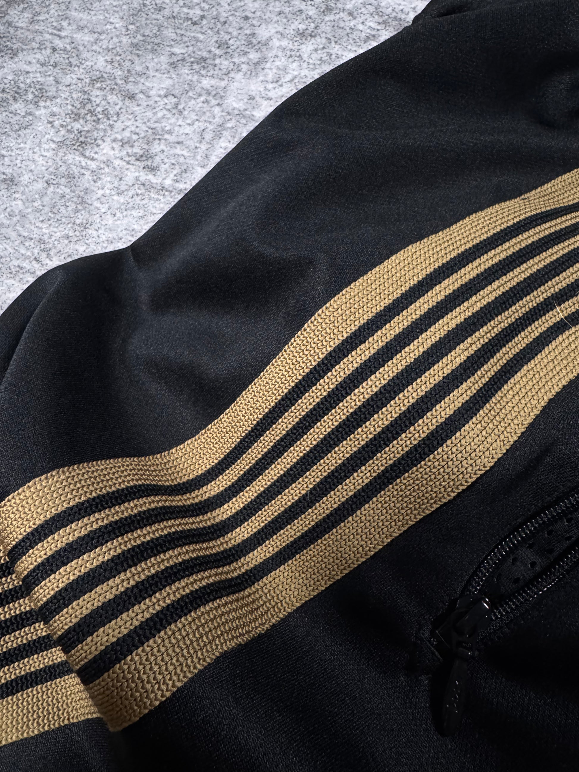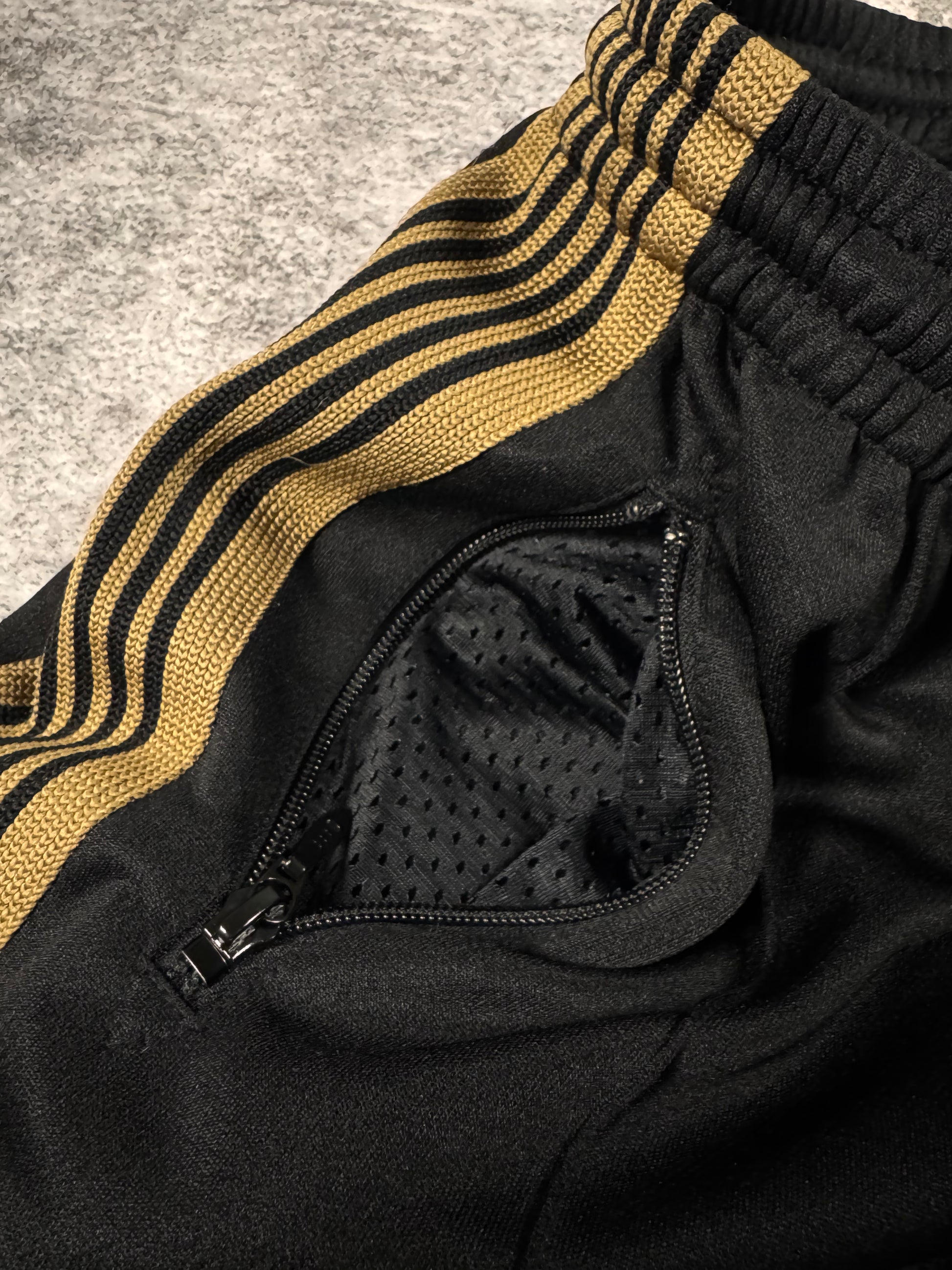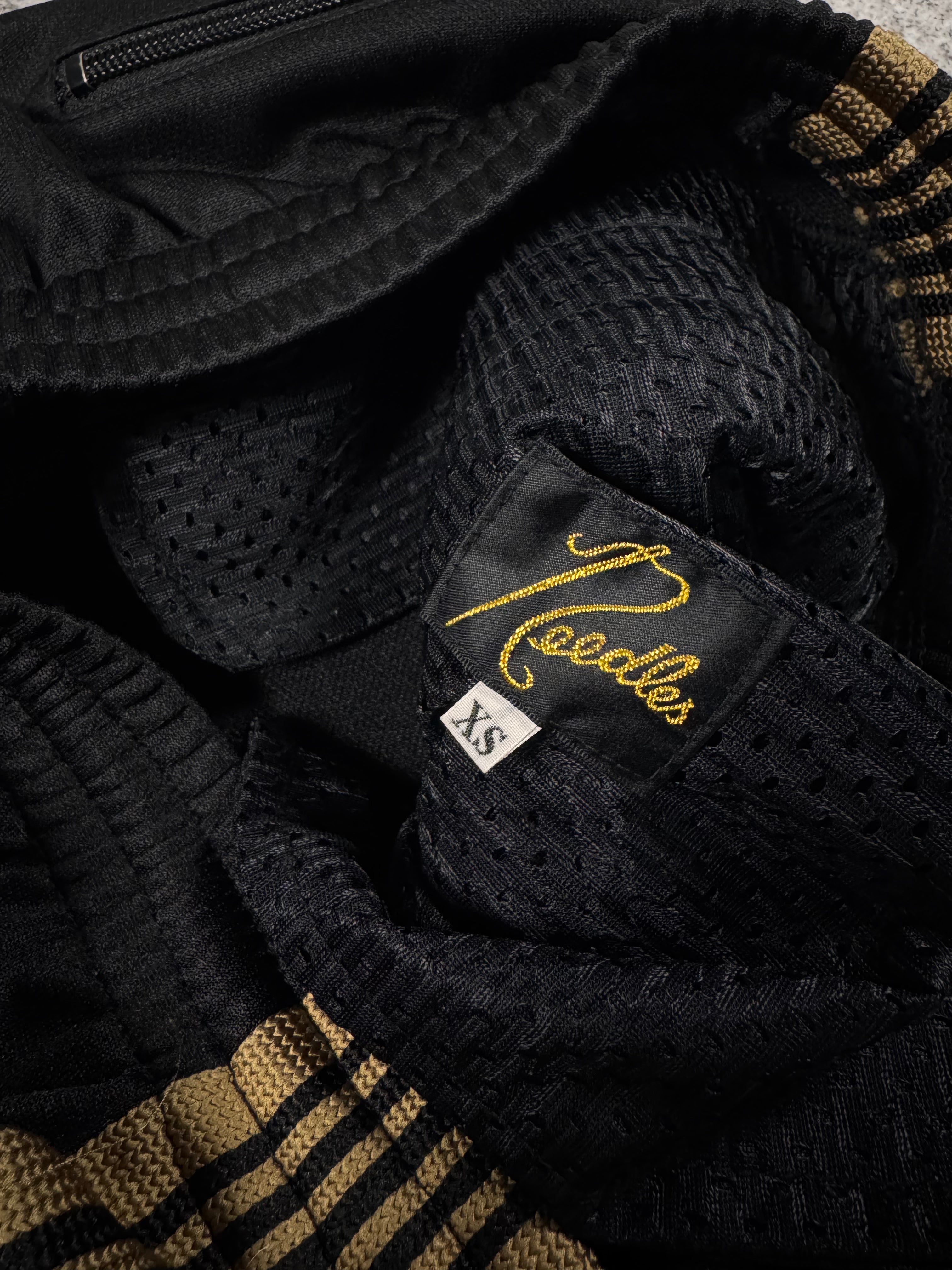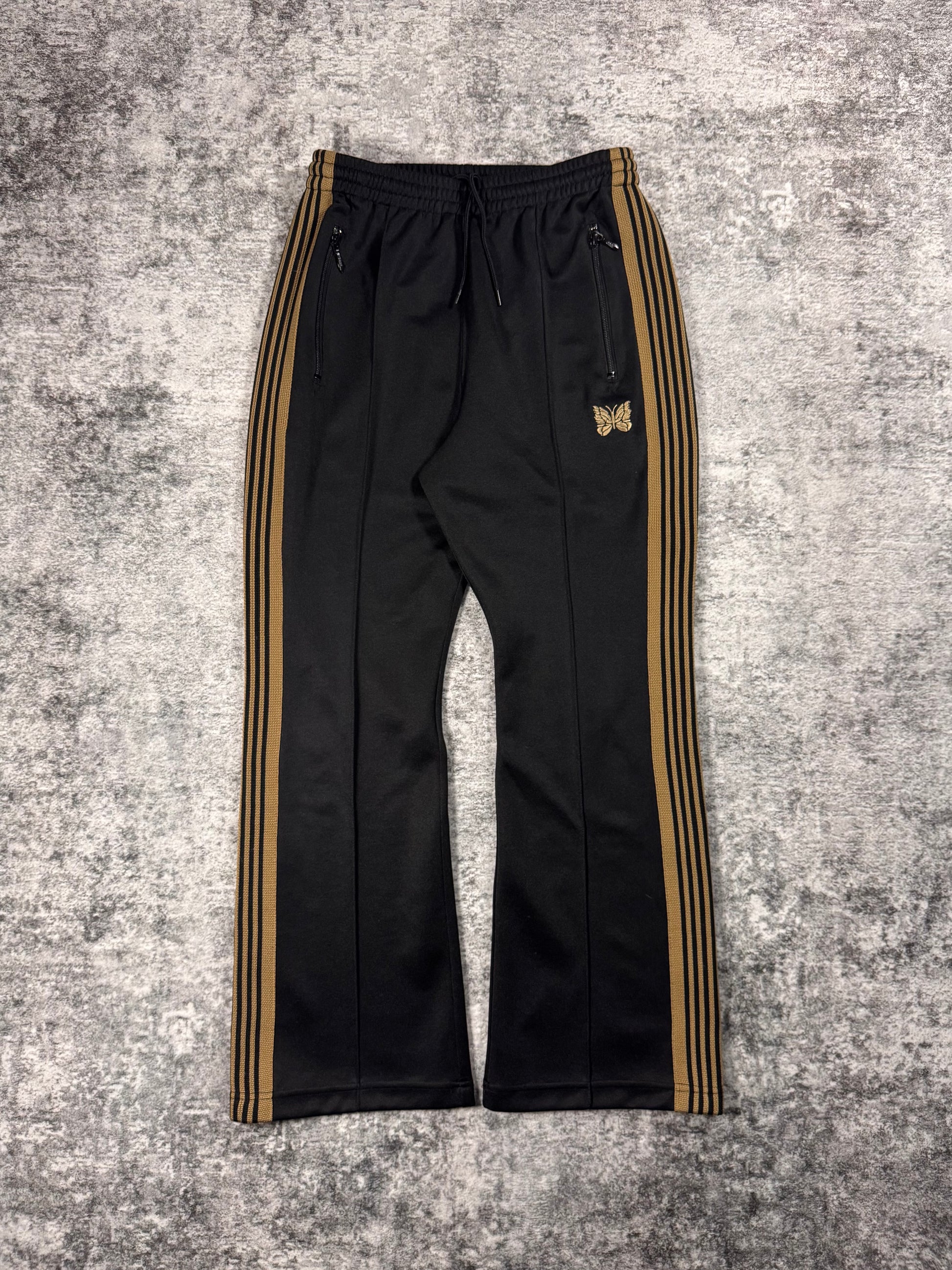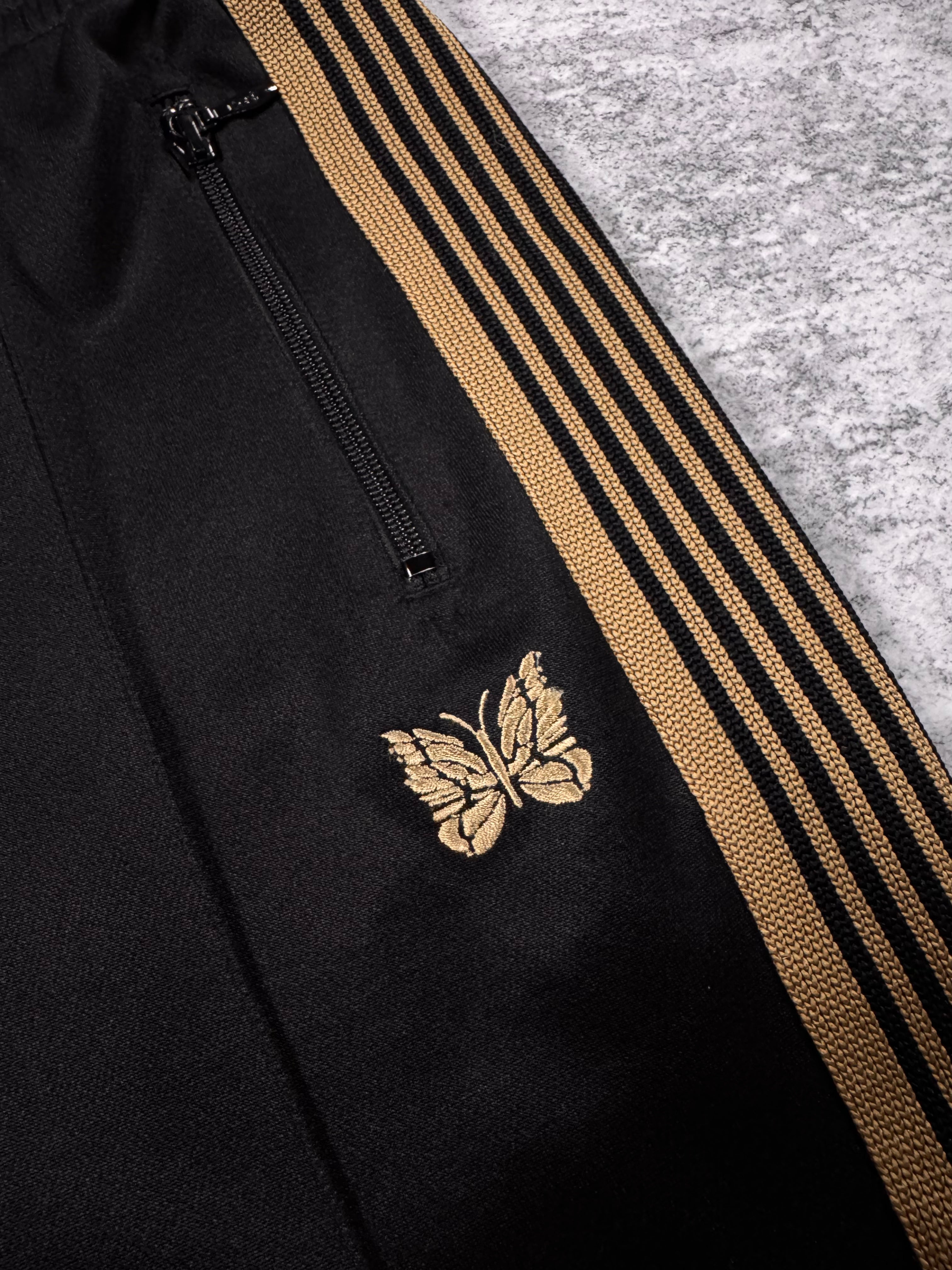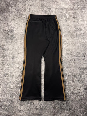 These classic pair of needles track pants have a flared silhouette (bootcut). In a gold/black color way, with the signature woven multi-stripe detailing. Needles butterfly embroidered logo near one of the zipper pockets. In great condition with no flaws or damages