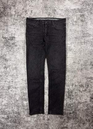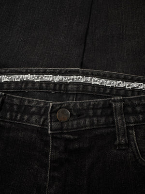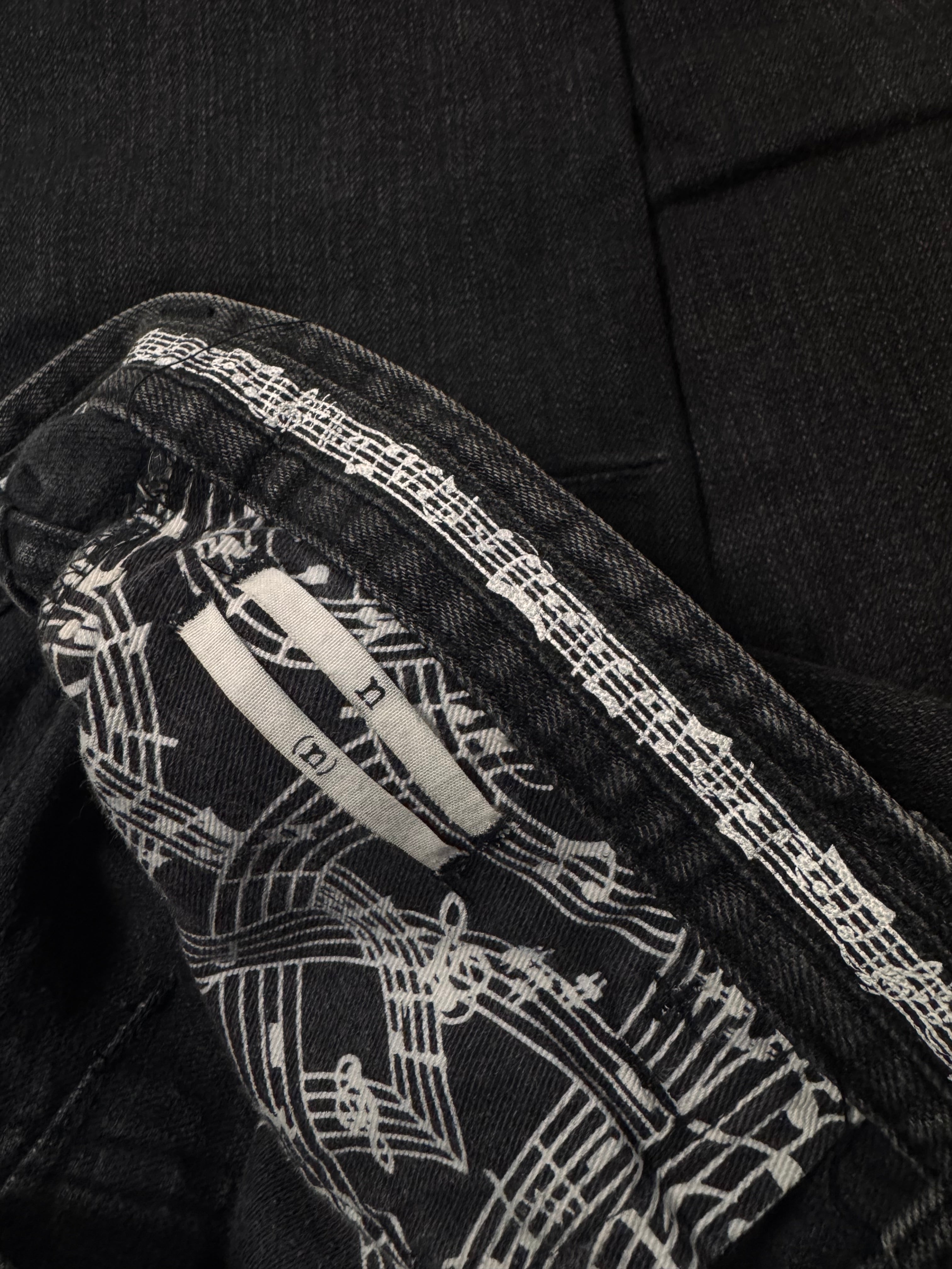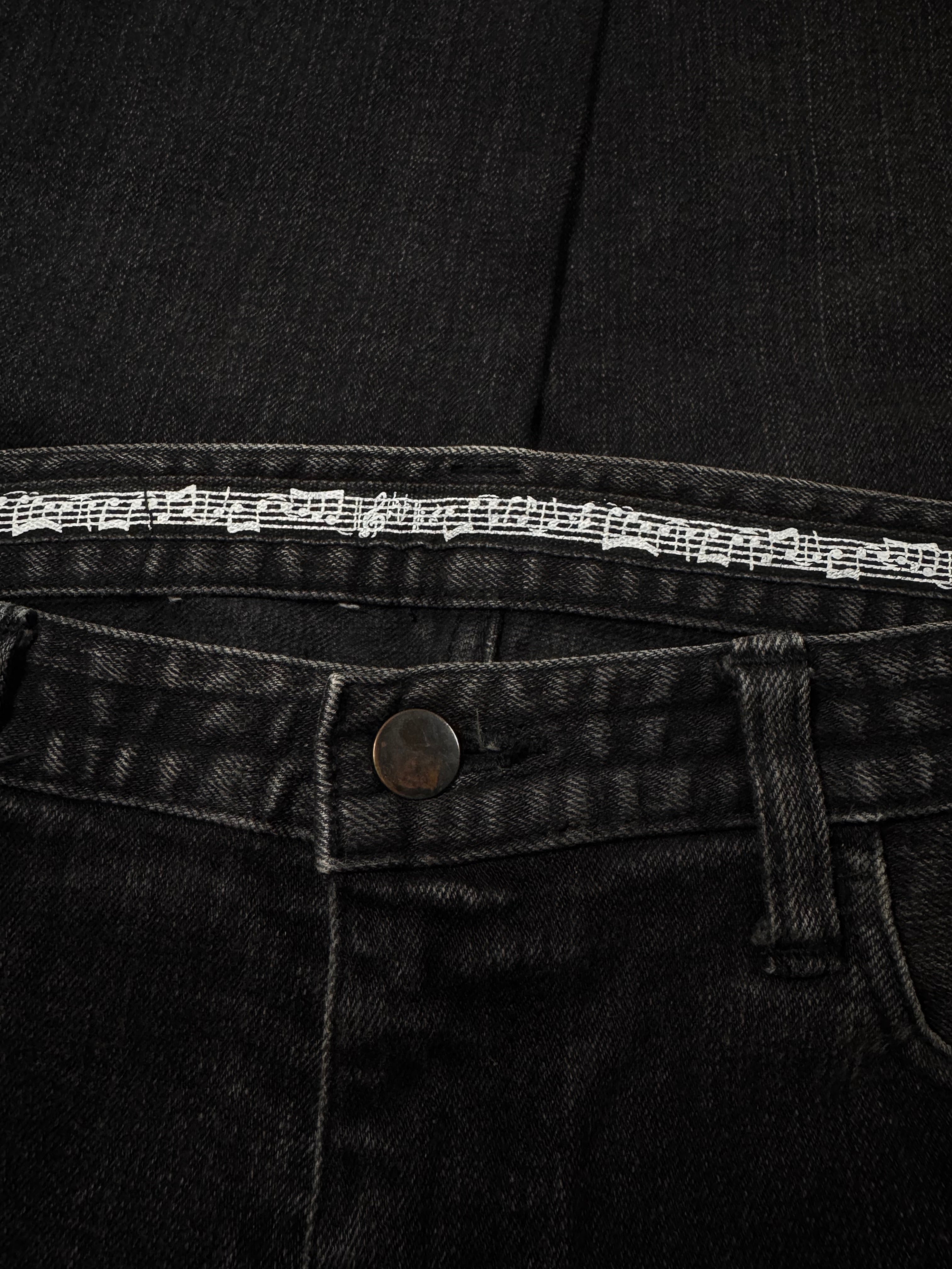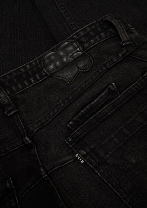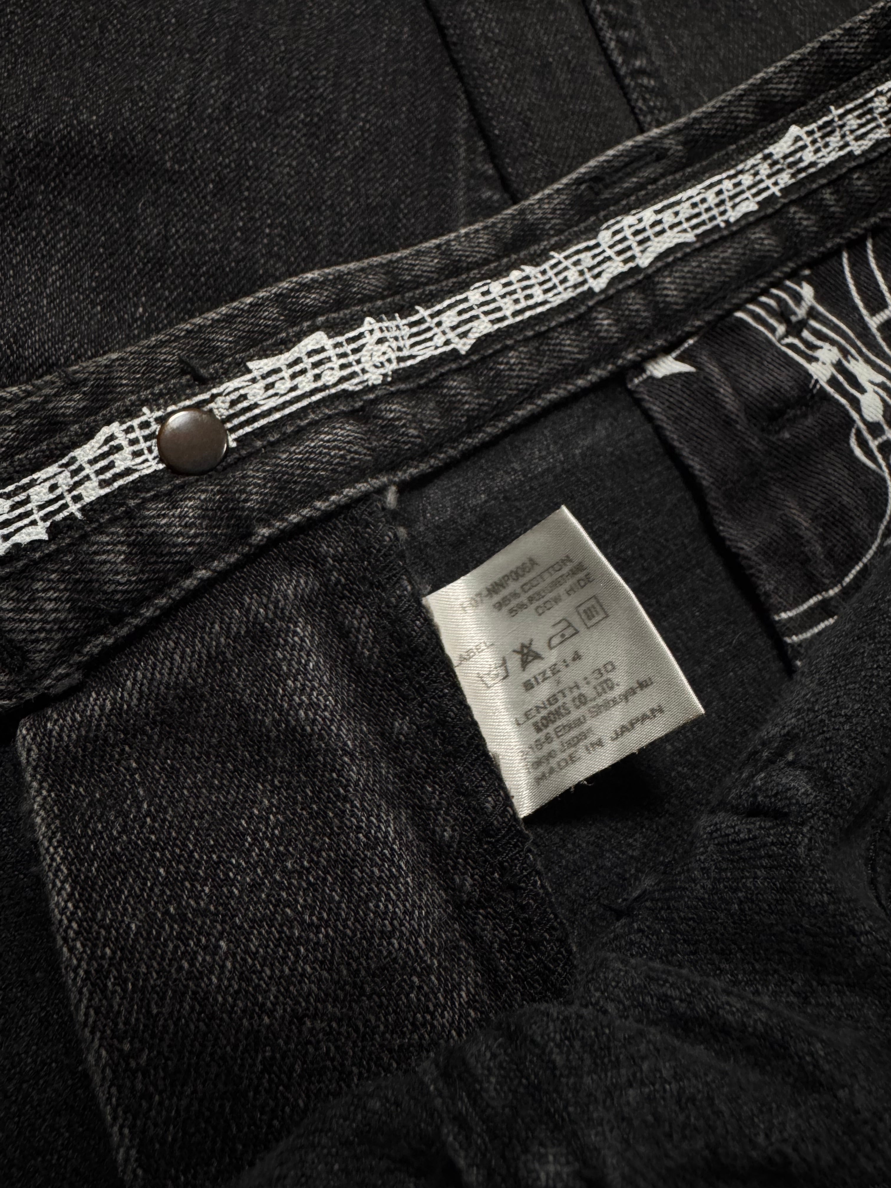 Beautiful pair of denim released in the Fall/Winter 2007 collection titled “Love, God, Murder”; as Miyashita was obsessed with Johnny Cash, he referenced the title from his 2000 compilation box set. The denim features a lovely aged black wash throughout. Iconic music note interior lining with the black crying heart patch on the rear. In good condition with no major flaws or damages