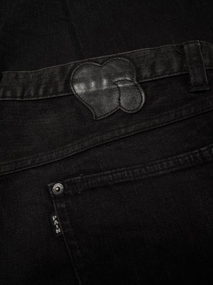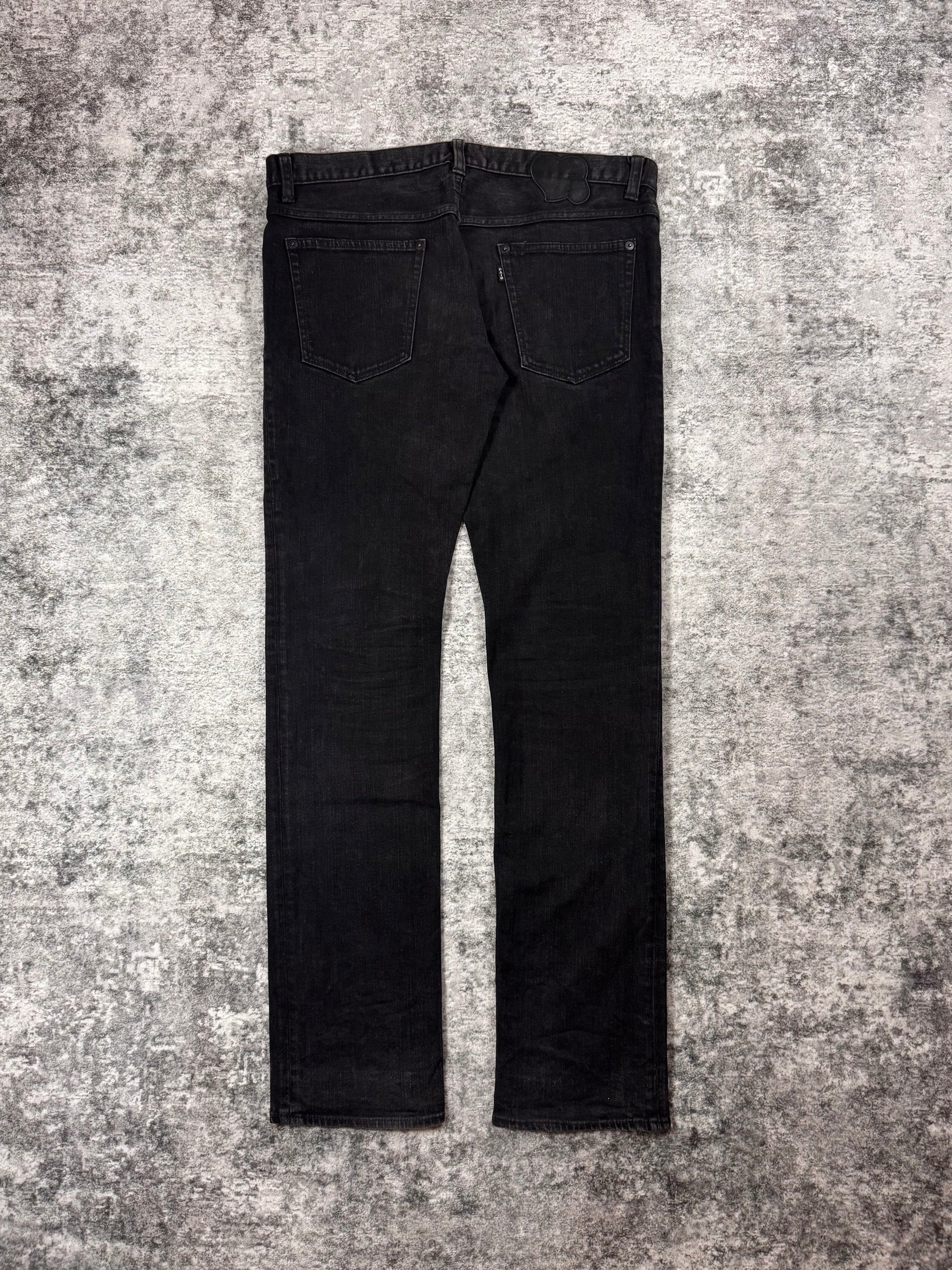 Beautiful pair of black signature ‘Pain’ denim from the Fall/Winter 2006 “Noir” collection. Features the classic crying heart patch on the rear as well as the Levi’s style “Pain” tab on the pocket. Number (N)ine all-over logo on the inner of both front pockets. In very good condition with no major flaws or damages