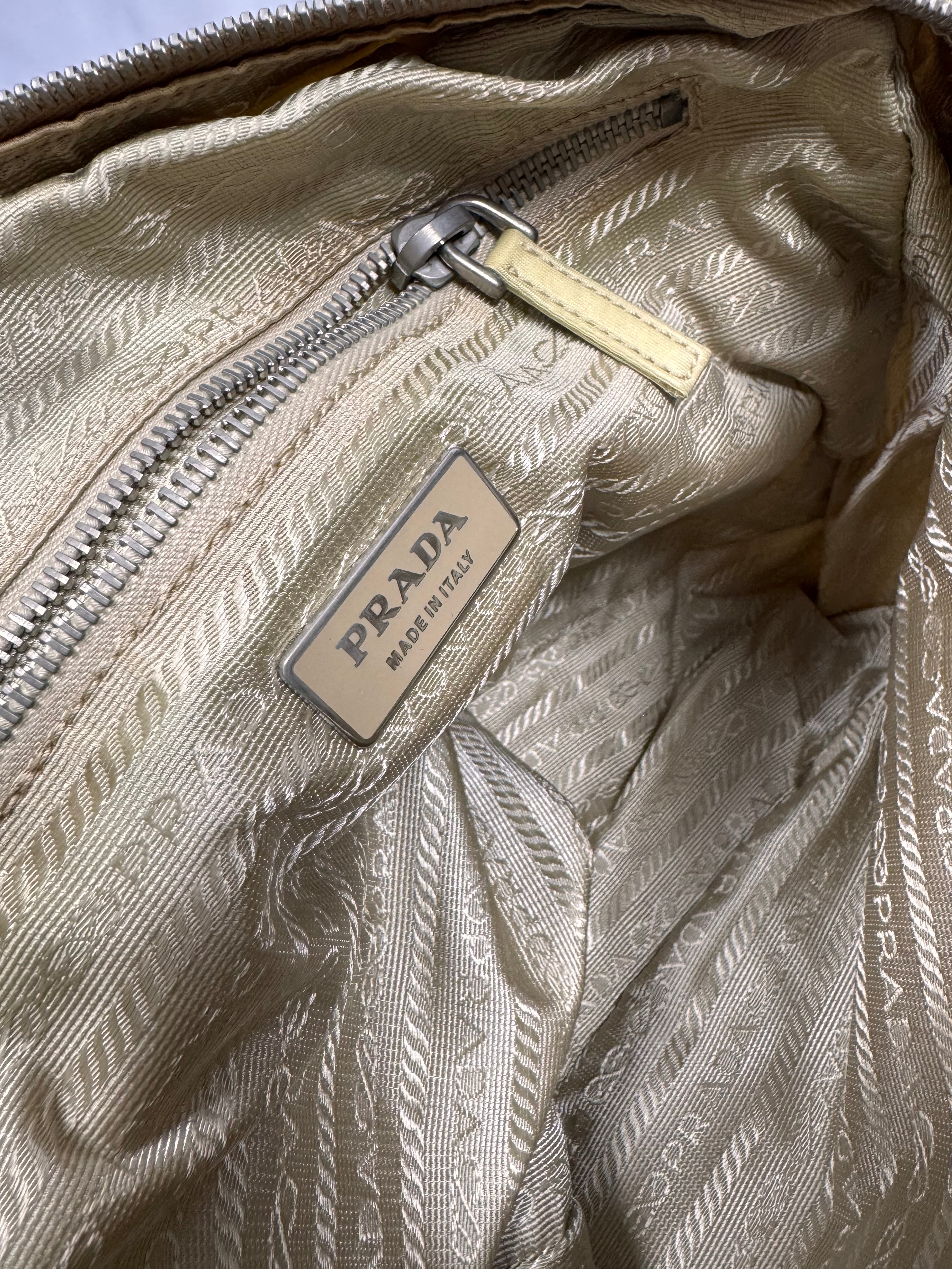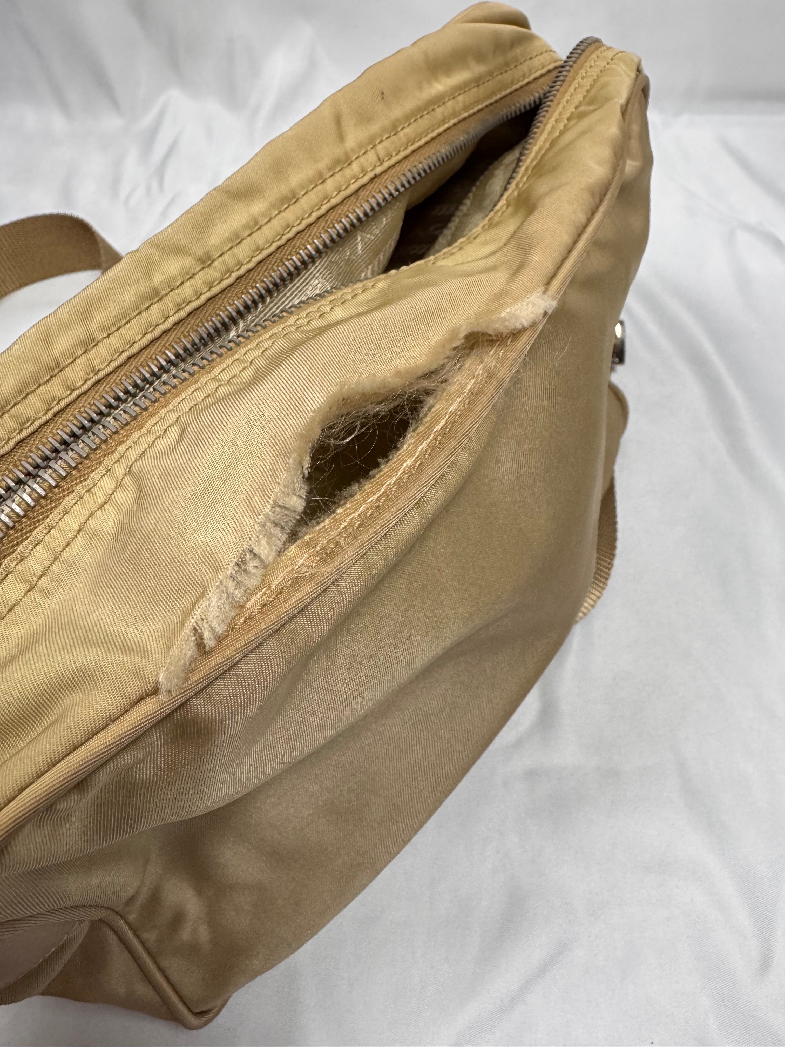 This Prada Milano crossbody bag comes in a lovely ‘Cammello’ color way; constructed of nylon material and features the signature Prada triangular plate on the front side. One main storage compartment with one other zipper compartment on the front side of the bag. Small tear on the exterior that is easily repairable, no other major flaws