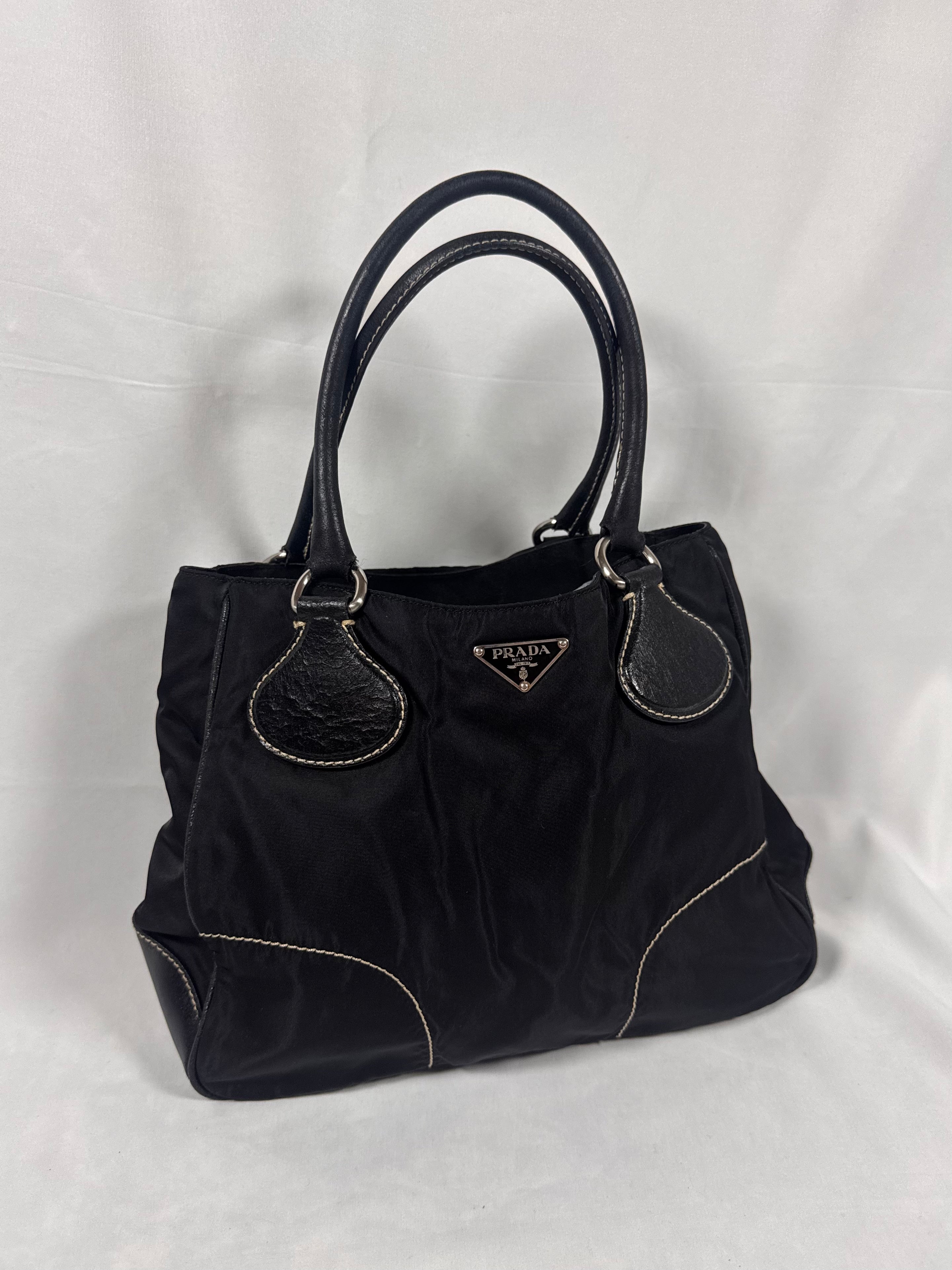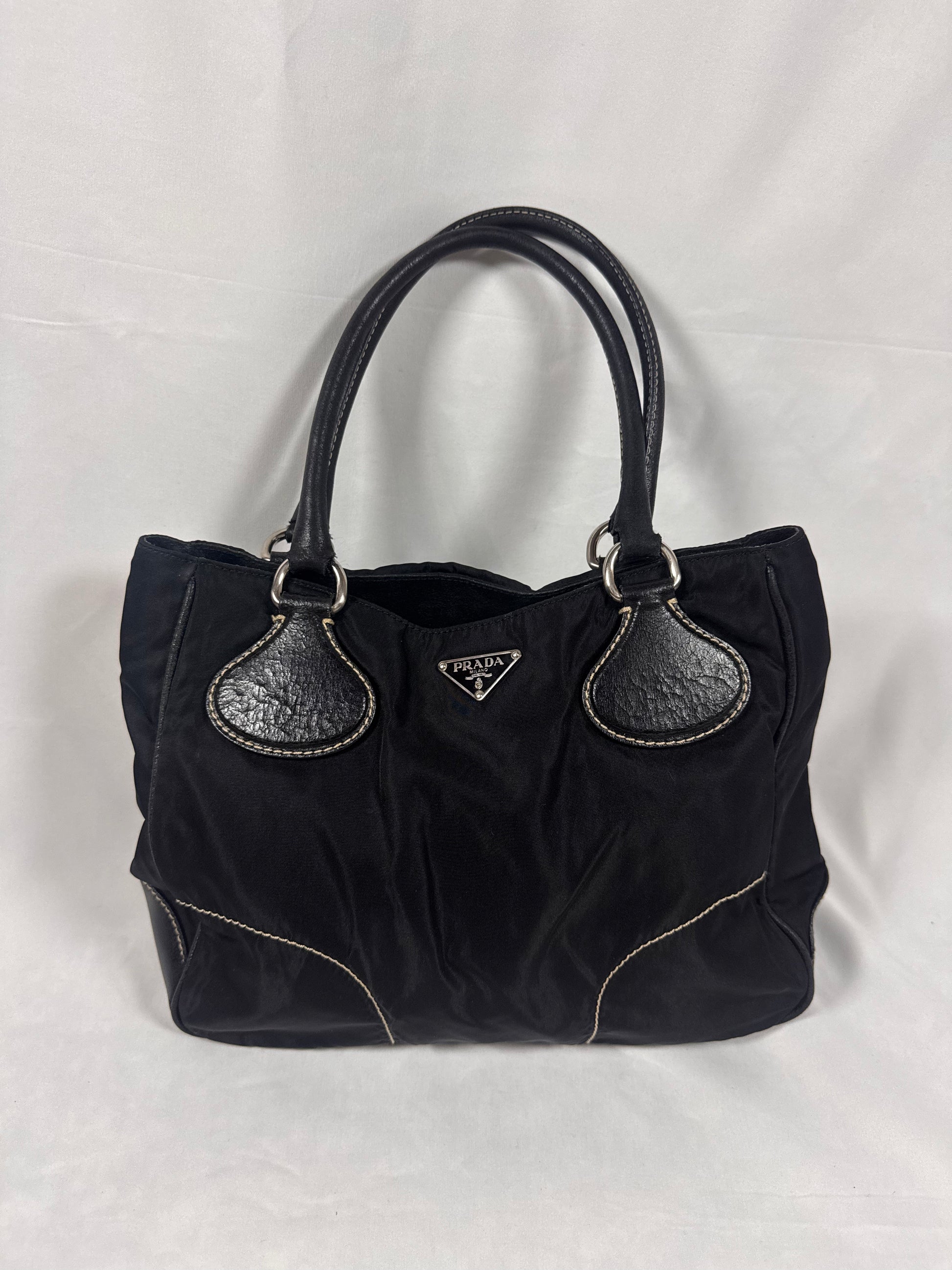 Gorgeous Prada Milano hand bag in the 'Nero' color way. Hybrid construction with calf leather on the handles and corners on the bottom. Solid condition with no major flaws or damages