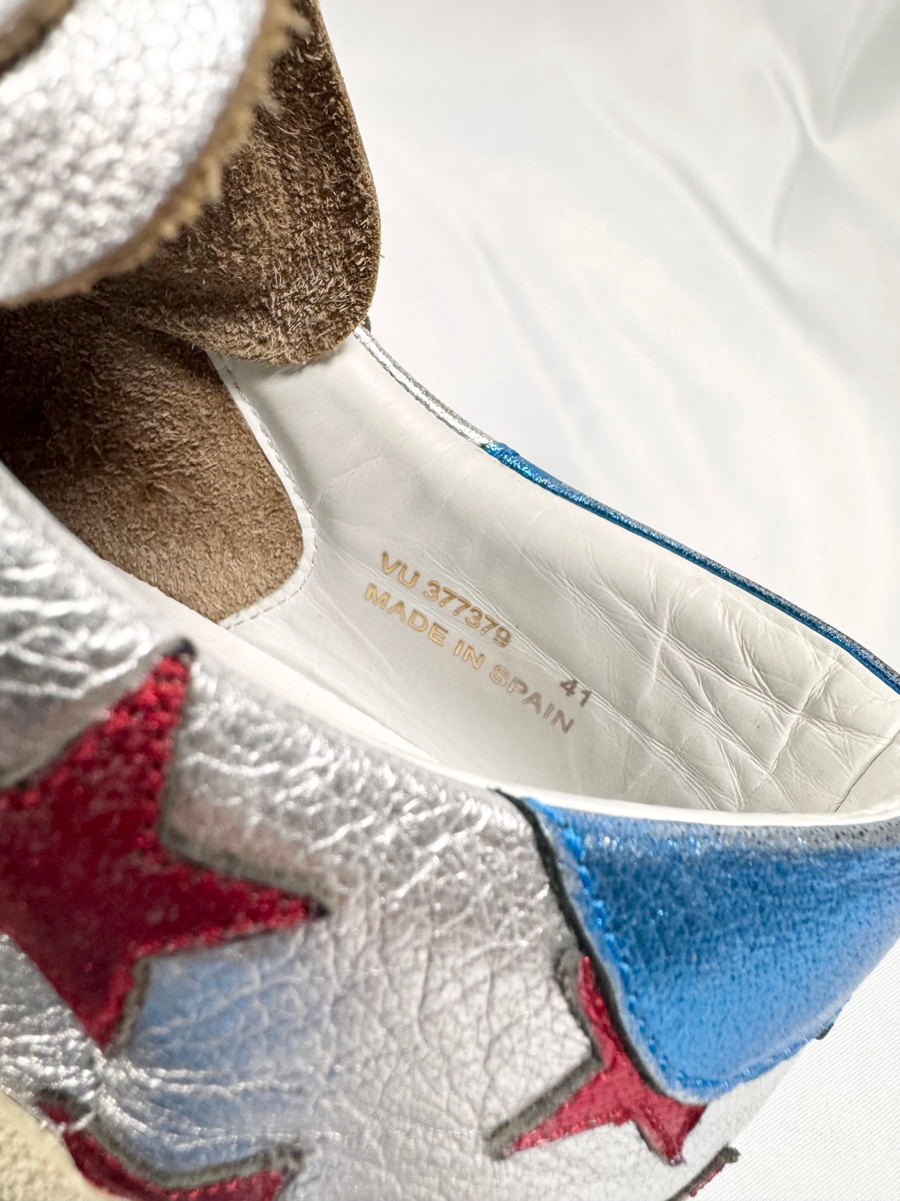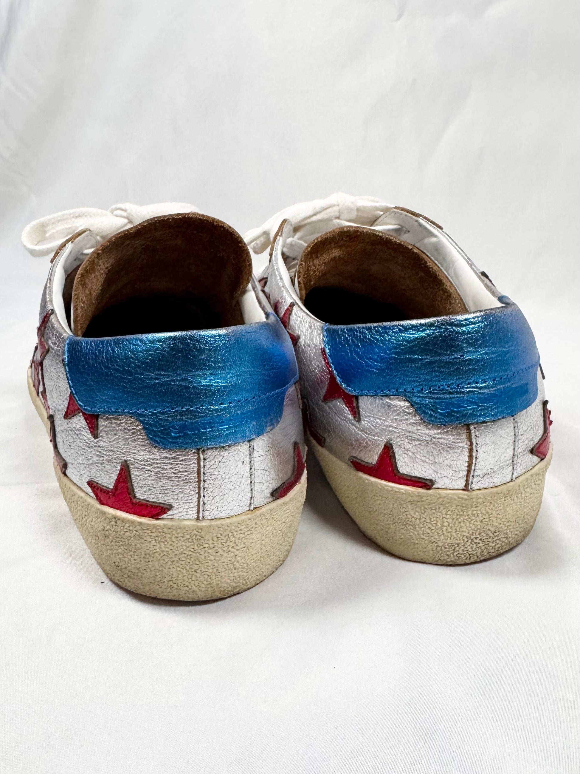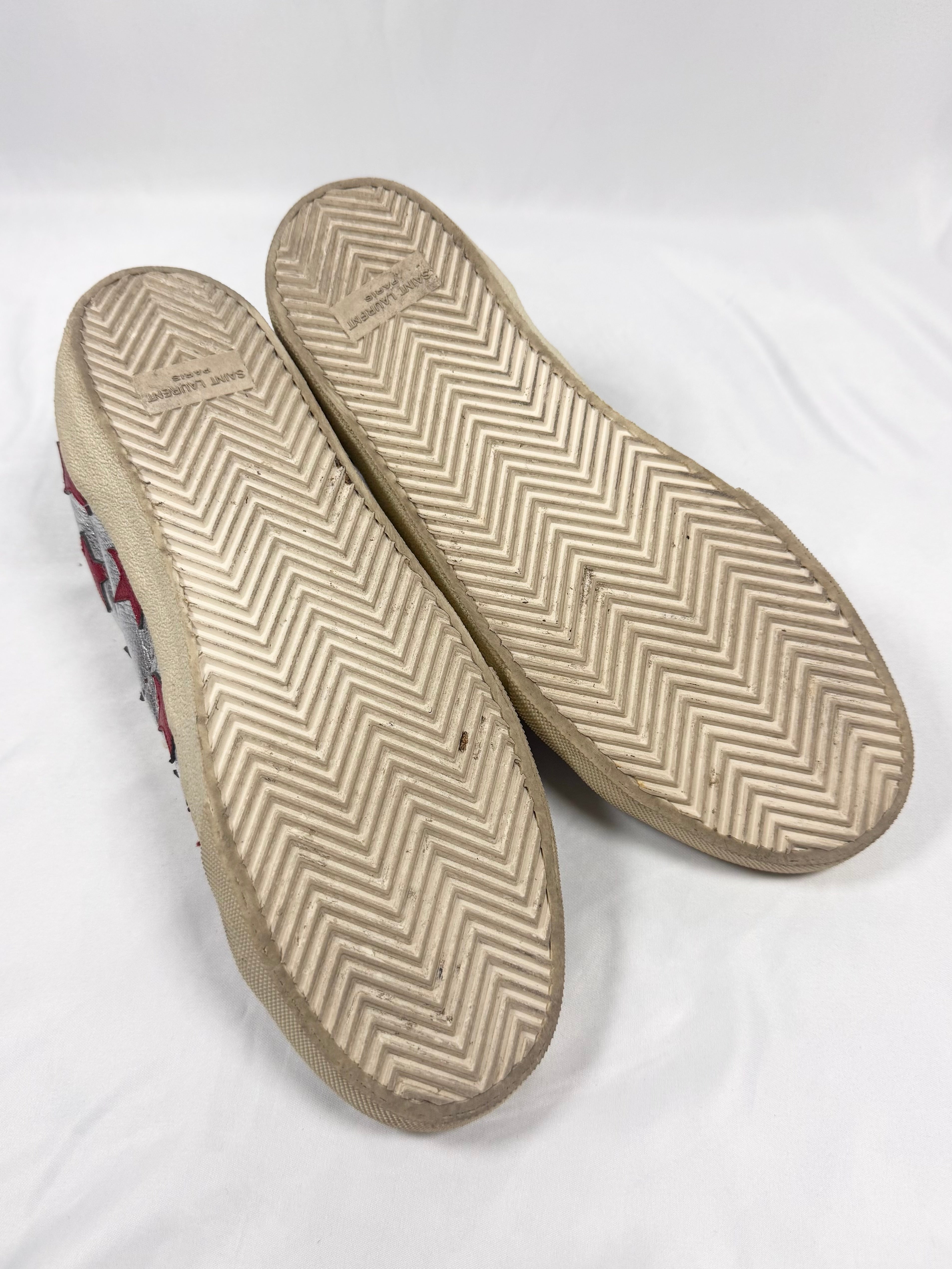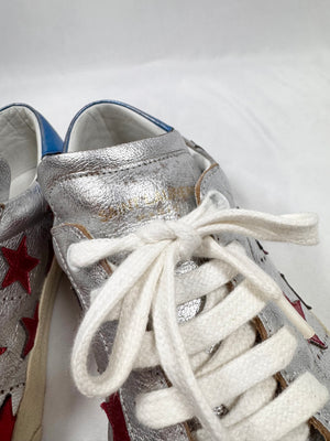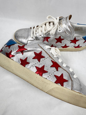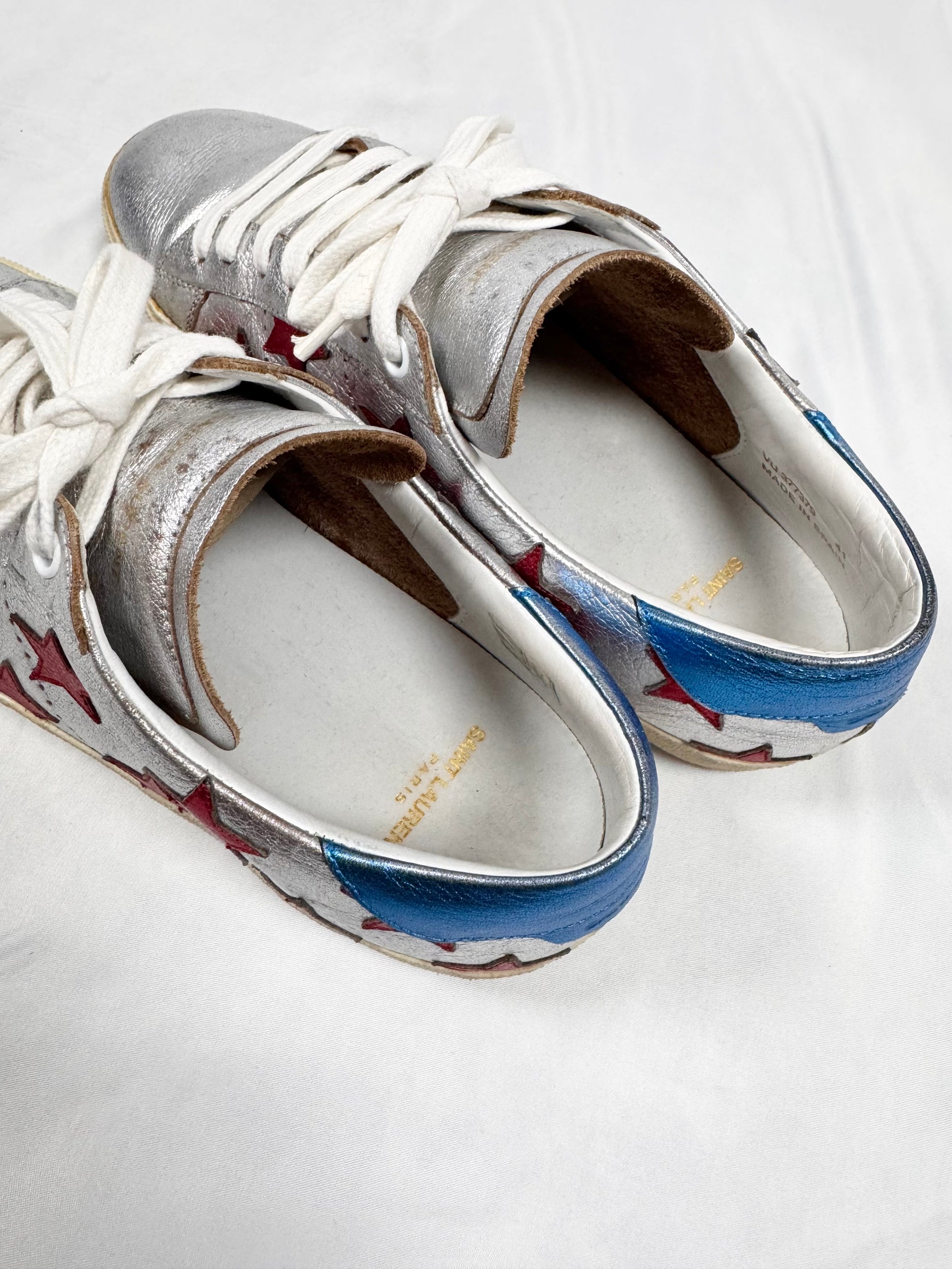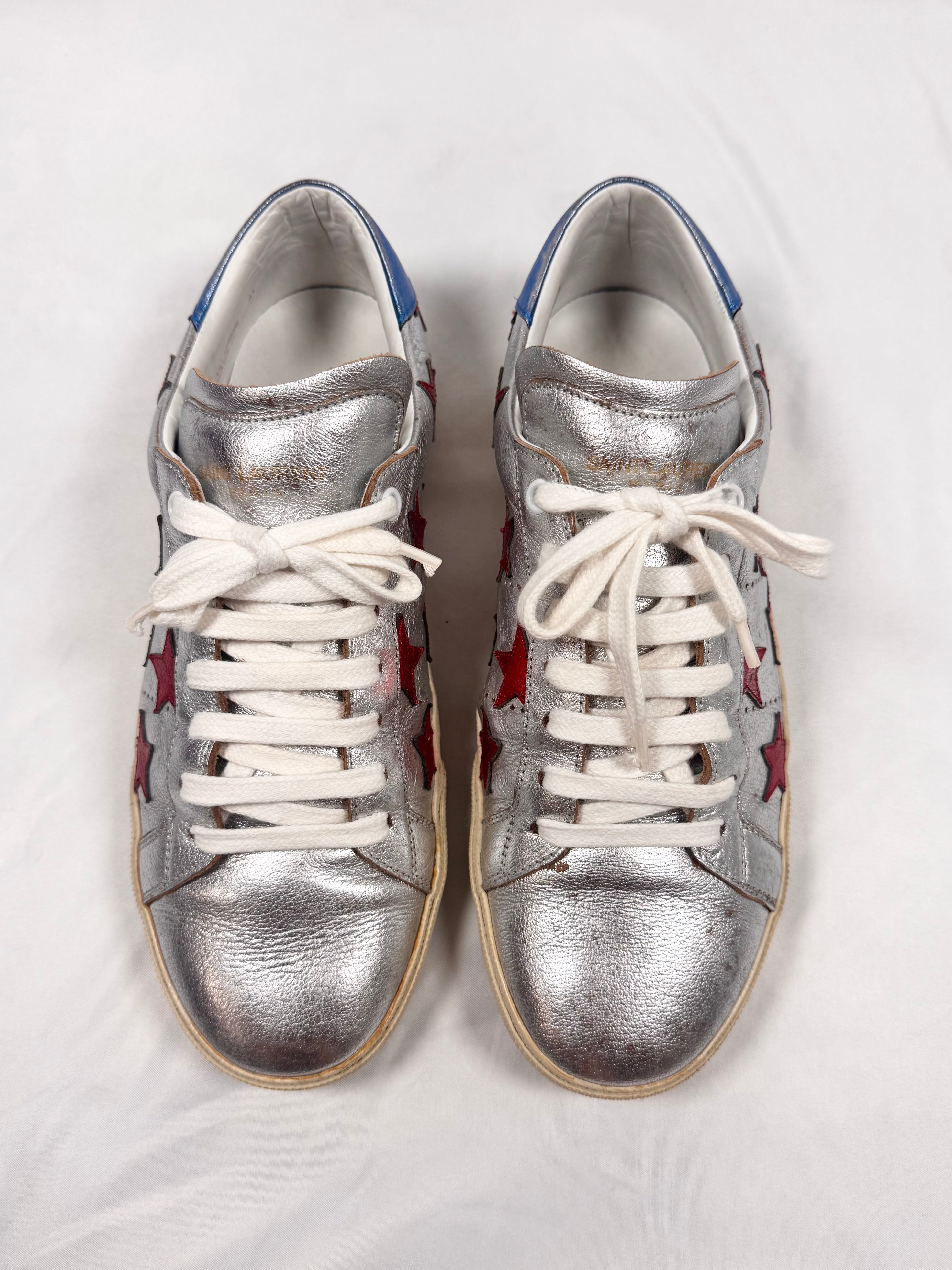 These Saint Laurent SL/06 low-top sneakers feature metallic silver leather uppers accented with bold red star appliqués. Finished with a vintage-toned rubber sole and classic court silhouette — signature Saint Laurent sneaker. In good condition with minor color defect on upper