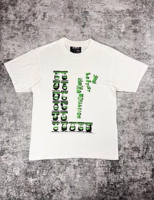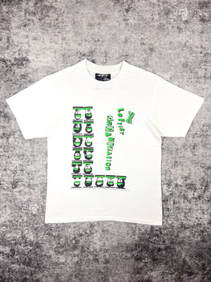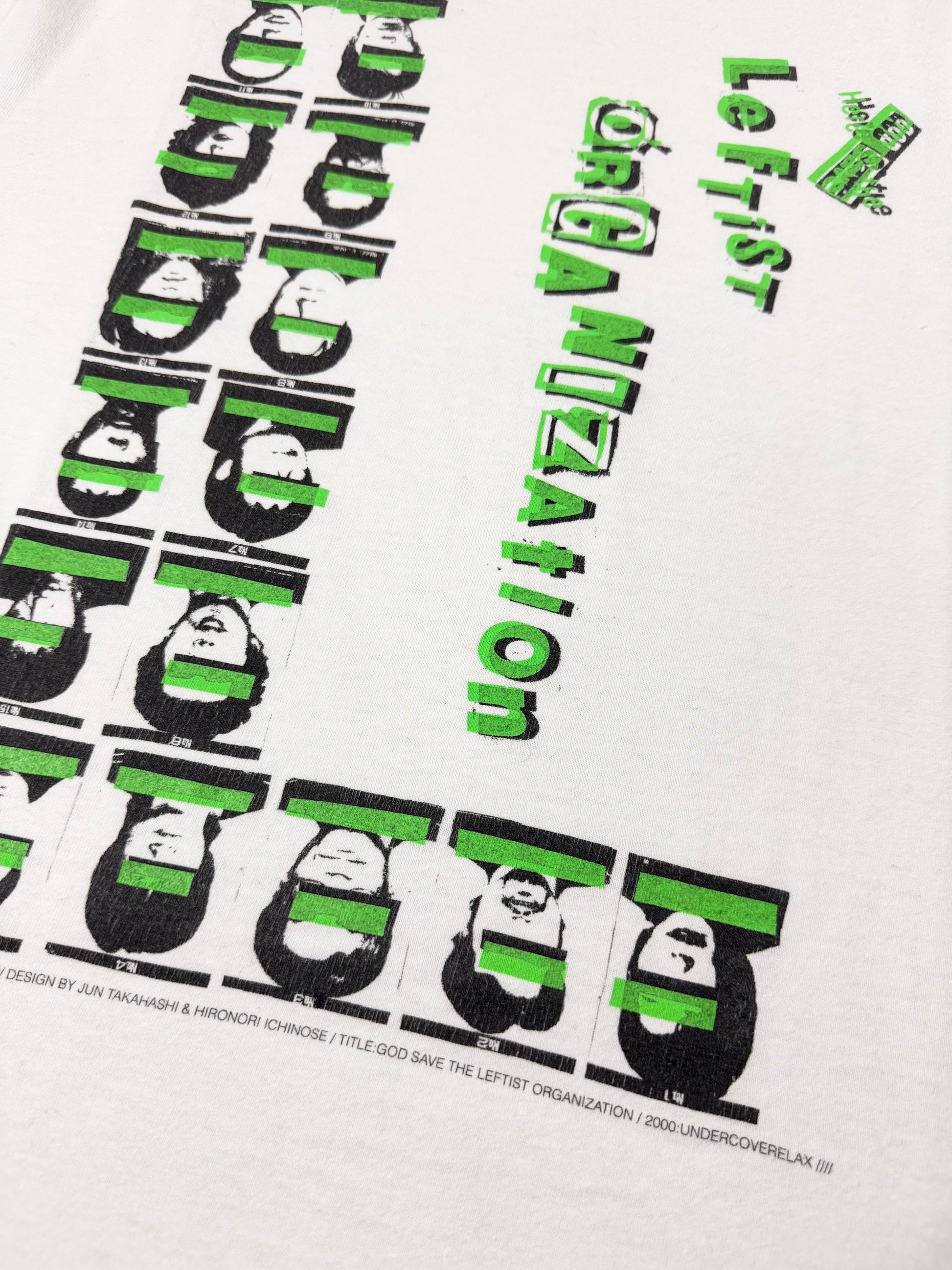 Extremely rare Undercover t shirt from Spring/Summer 2000 for the Relax magazine, reanmed 'UNDERCOVERRELAX' for this release this graphic was designed by Jun Takahashi and Hironori Ichinose titled "God Save The Leftist Organization"; features faces with a green eye-covering banner flipped upside down shaped in the letter "L". In brilliant condition for its age, no major flaws or damages