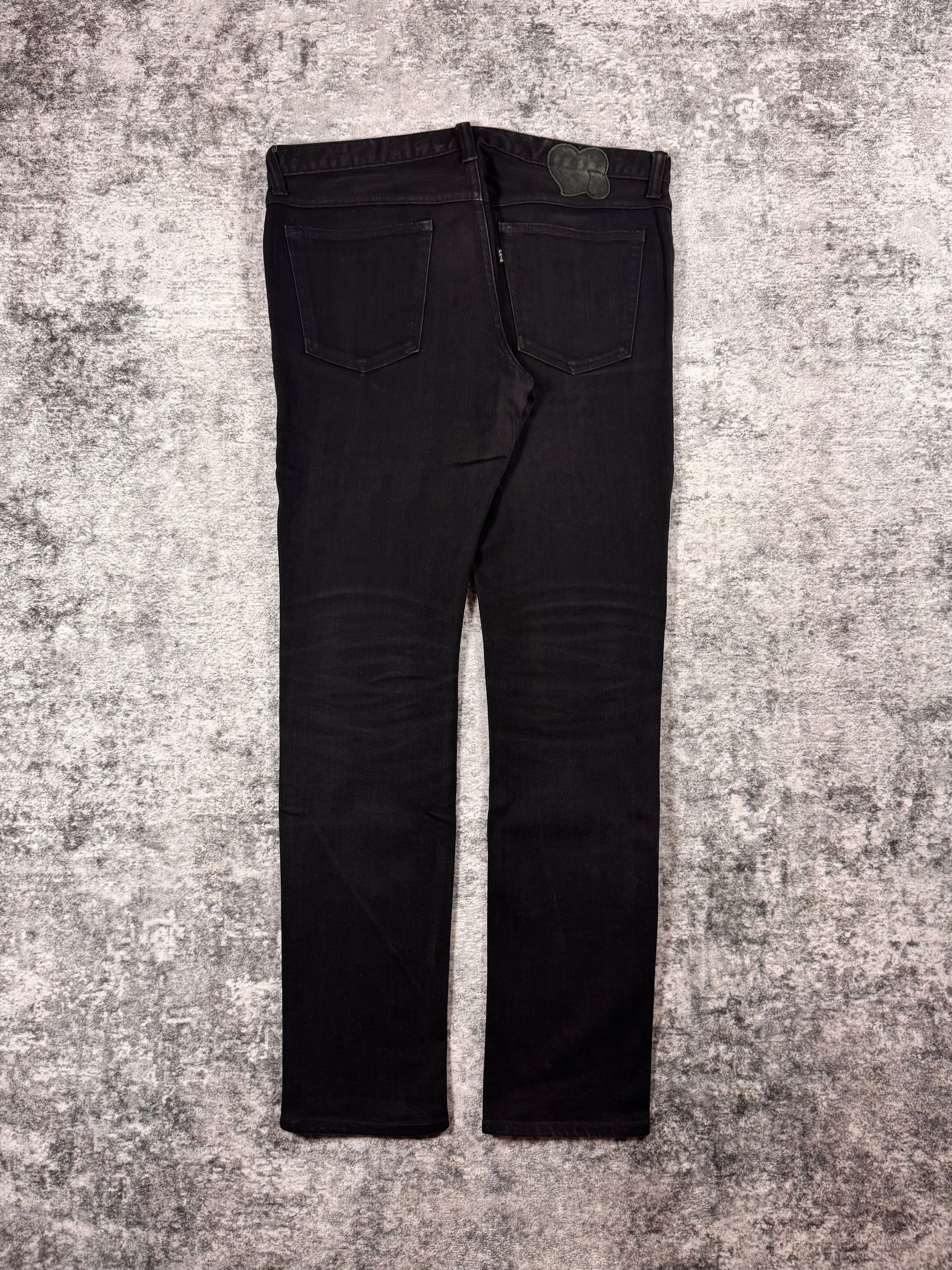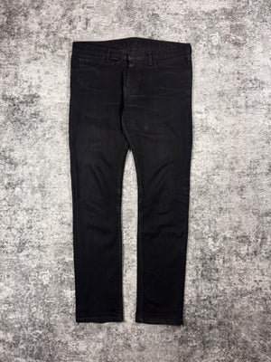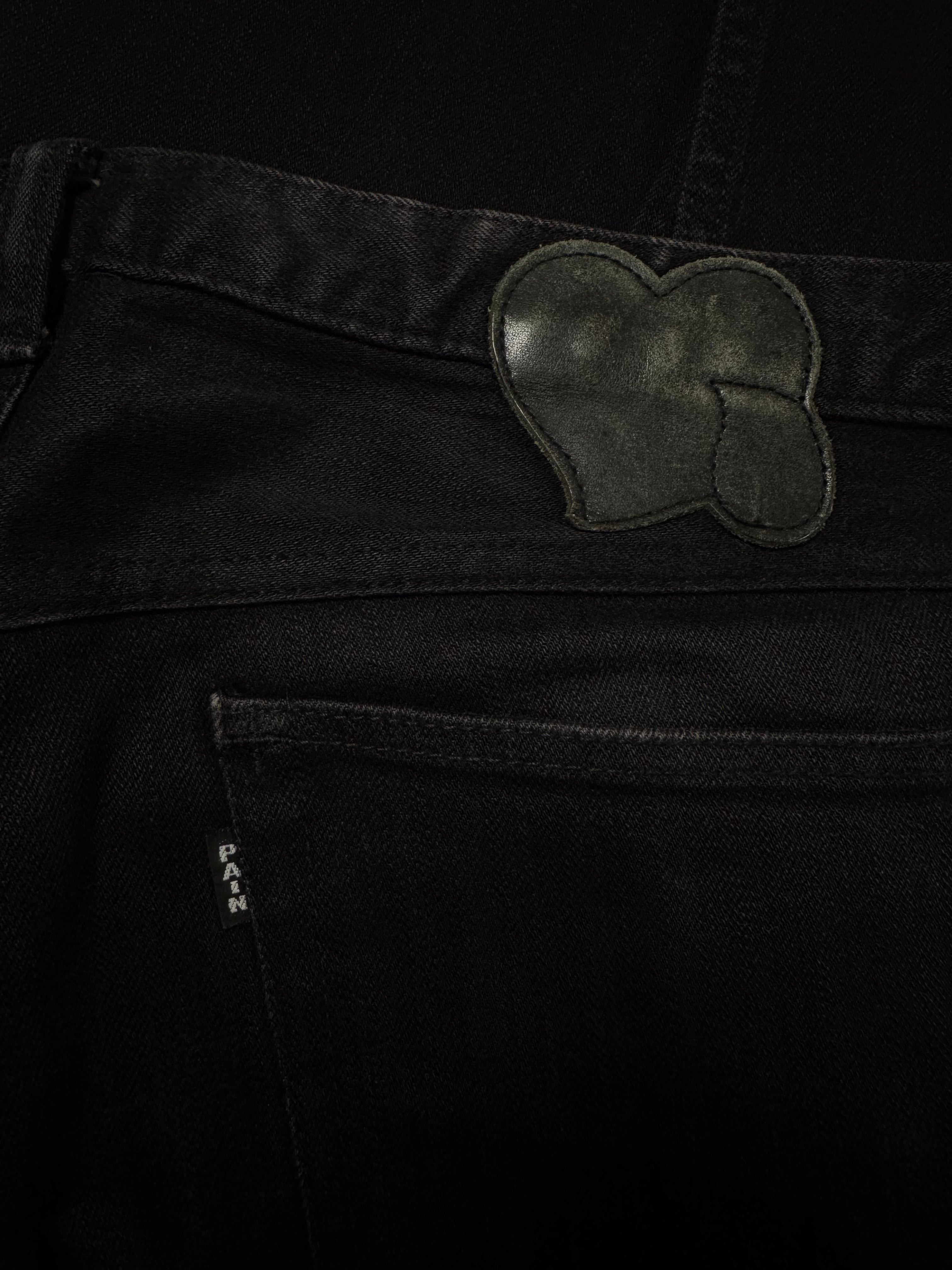 This beautiful pair of black denim is from the Spring/Summer 2005 “Nightcrawler” collection. Classic crying heart patch on the backside of the waistline. Levi’s style red “Pain” tab on one of the back pockets. Number (N)ine all-over logo on the inner of both front pockets. Bondage ring detail on multiple belt loops, both front and back. In good condition with no major flaws or damages