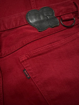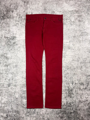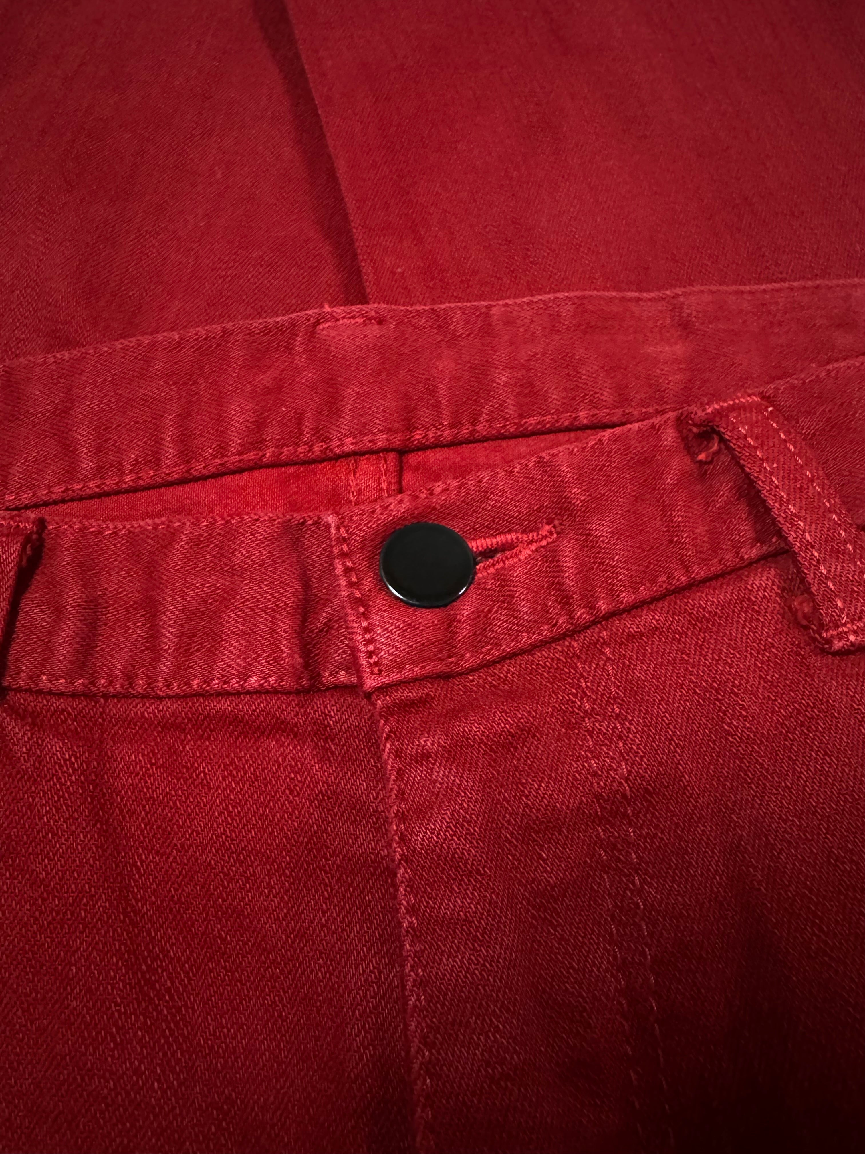 This gorgeous pair of runwary denim coming in all red is from the Spring/Summer 2005 “Nightcrawler” collection. Features the classic black crying heart patch on the rear of the waistline. Levi’s style “Pain” tab on one of the rear pockets. D-ring detail on one of the front belt loops. In good condition with no major flaws or damages