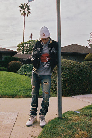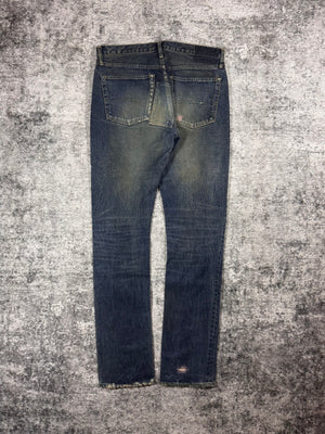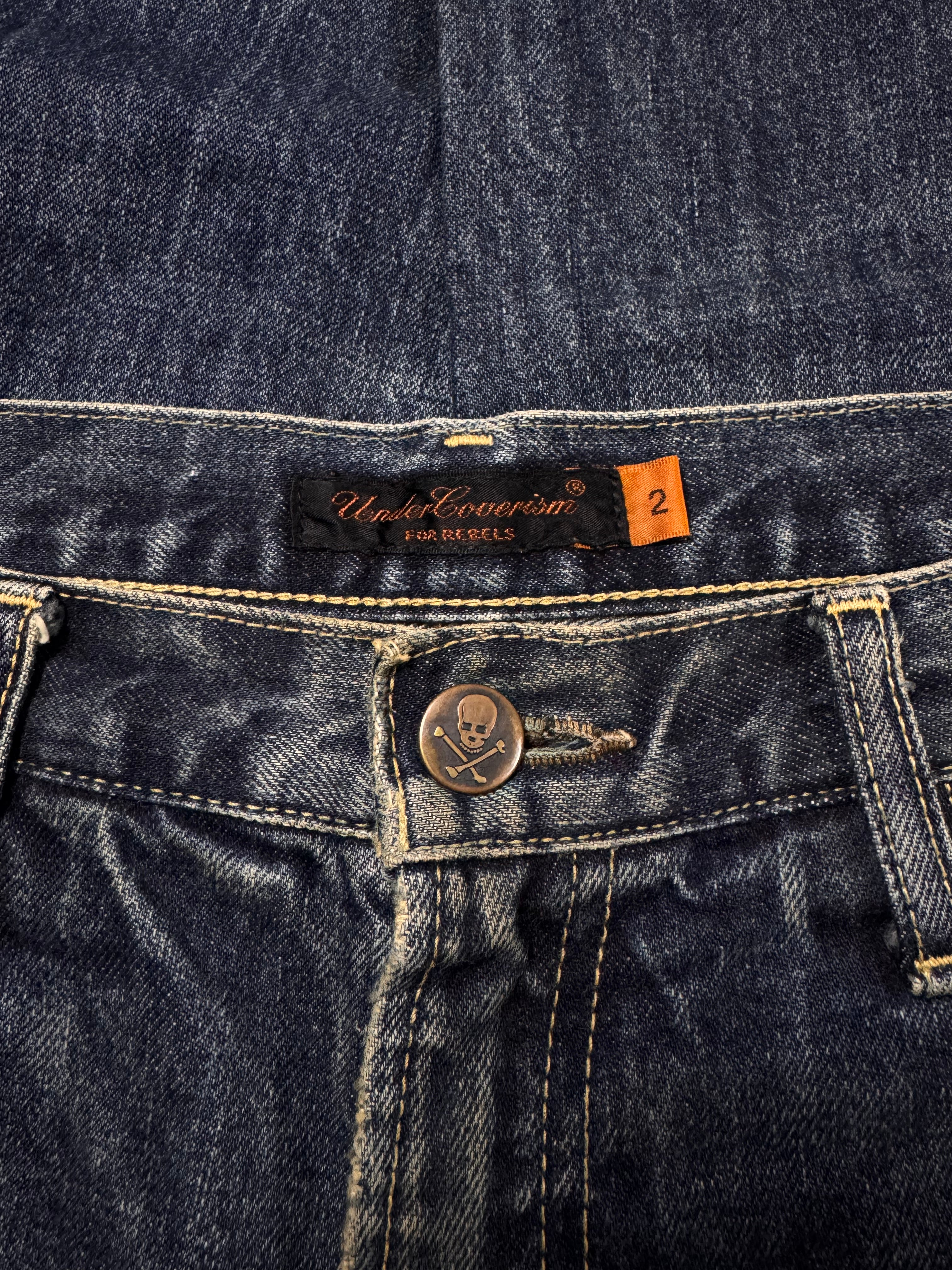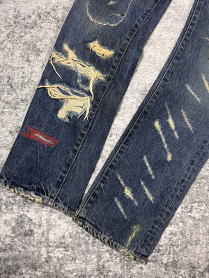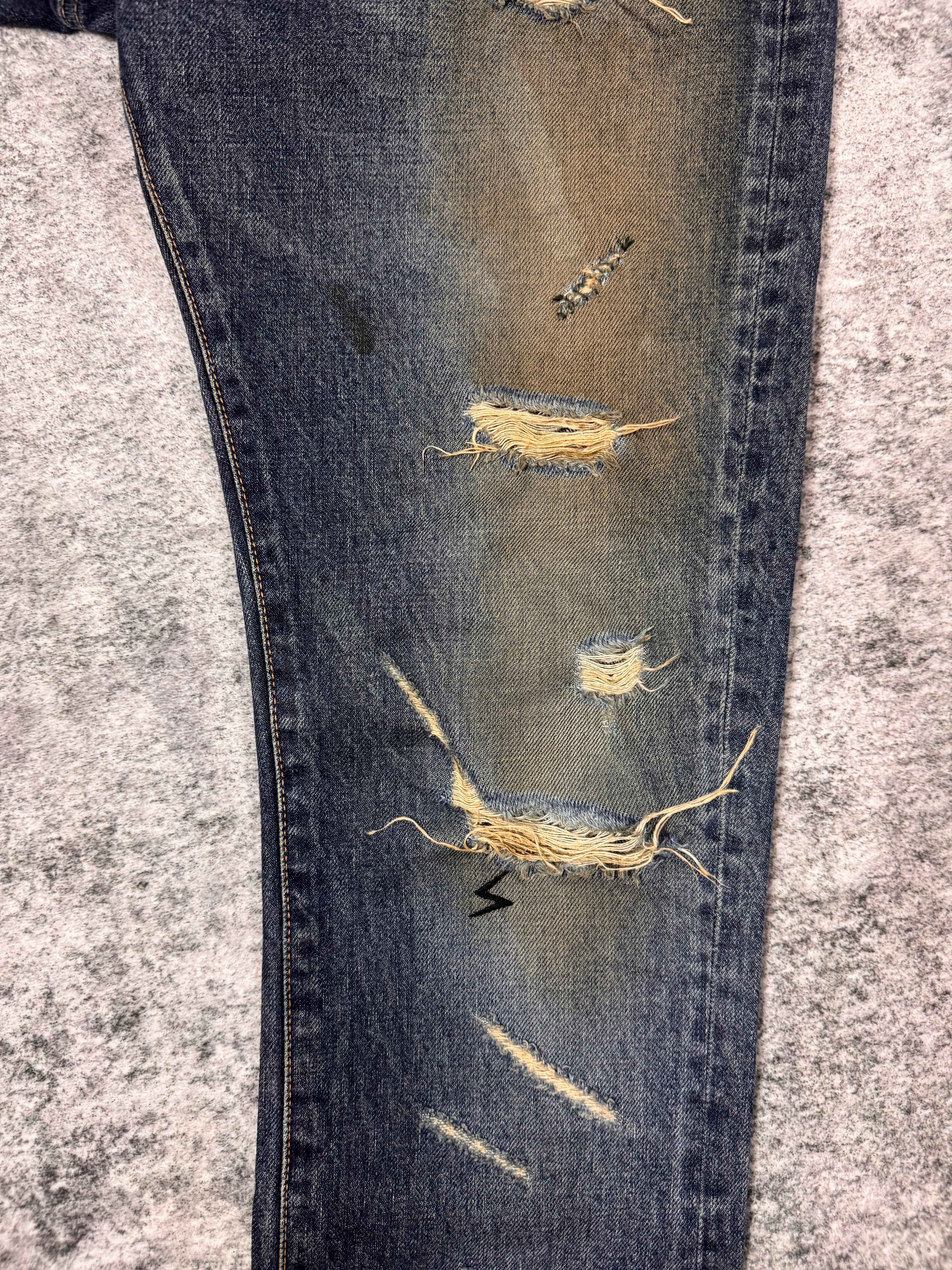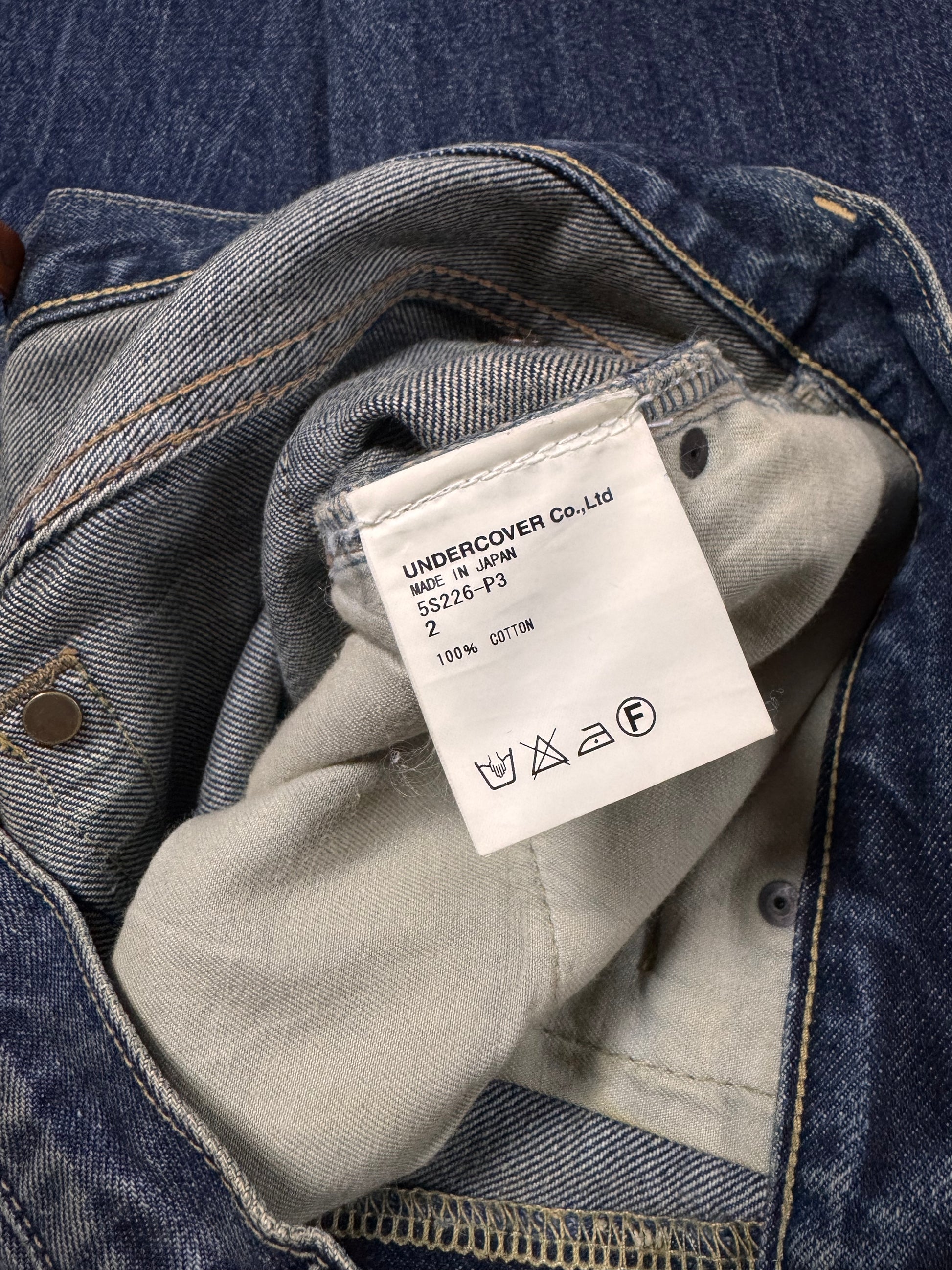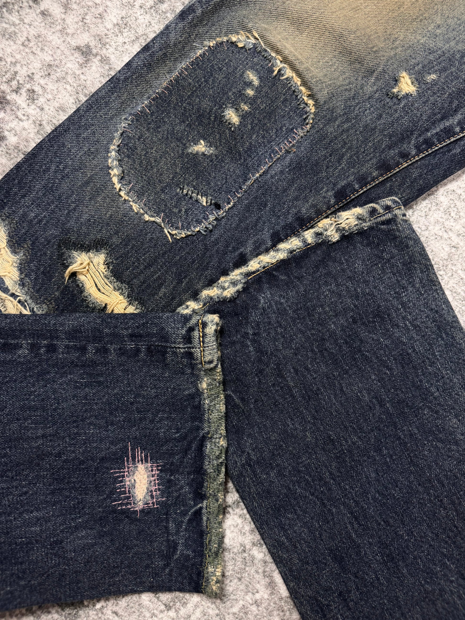 Stunning pair of Undercover denim from Jun Takahashi’s Spring/Summer 2005 “But Beautiful” collection, where destruction and repair coexist as a central design language. The denim showcases meticulous patchwork reinforcements, raw distressing, and visible repair stitching. Claw-mark distressing below the knee with different color threads used for stitching work, even visible on the leg opening (green). This pair has an mud-wash fade on the thigh area. Insane pair of jeans that defines Undercover’s poetic balance of chaos and beauty. Maintains fantastic quality for its age with no major flaws (the mud-wash is from natural aging/wear)