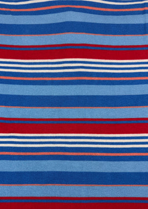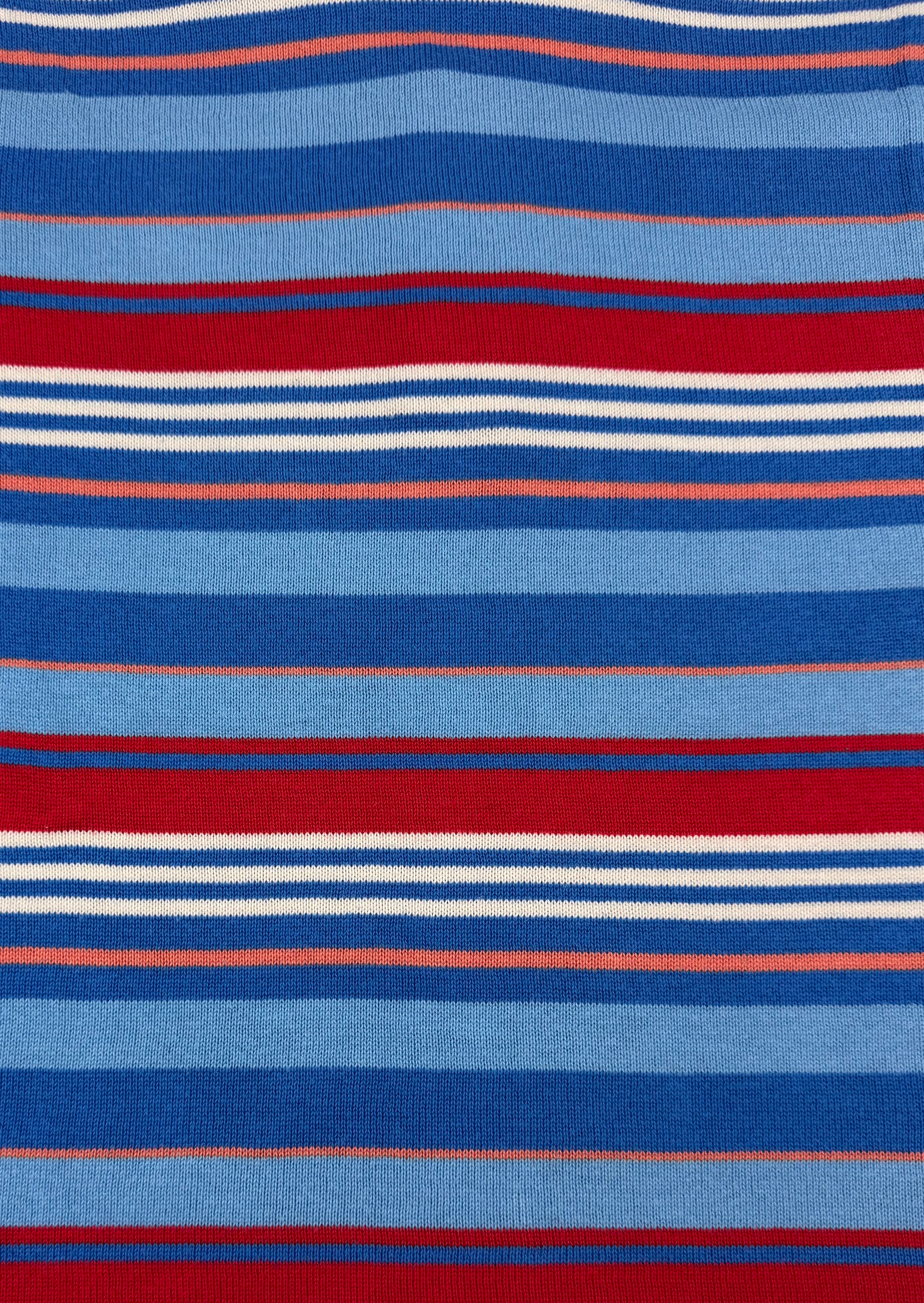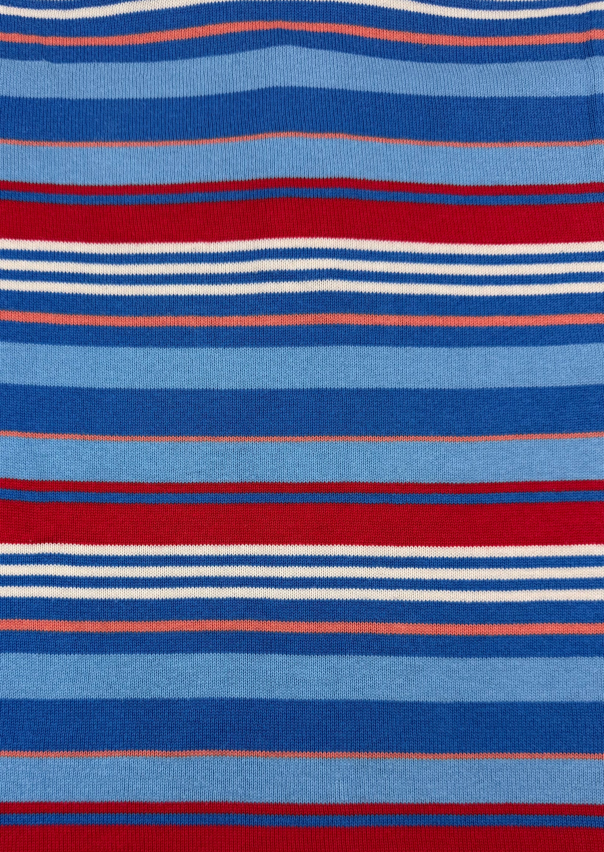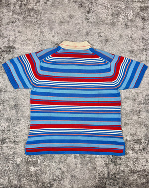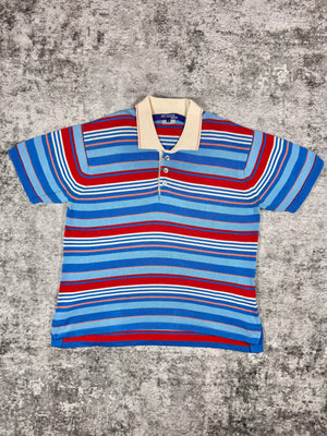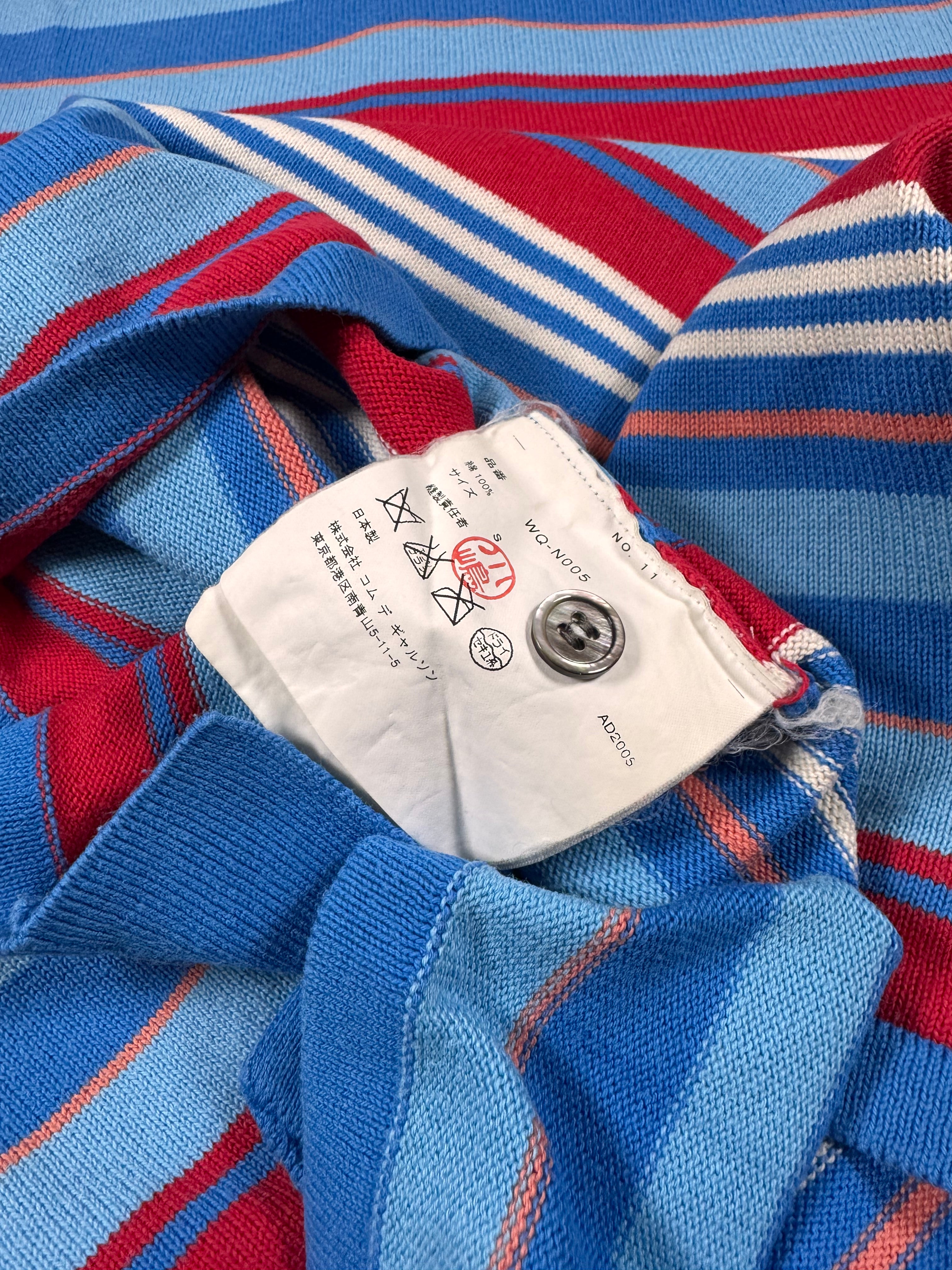 Spring/Summer 2006 Junya Watanabe Man short-sleeve knit polo featuring a layered blue/red/white horizontal stripe composition. Crafted in Japan from 100% cotton, the piece showcases Junya Watanabe’s precision in knitwear construction and balanced use of color blocking during his mid-2000s menswear period. In brilliant condition with no flaws or damages