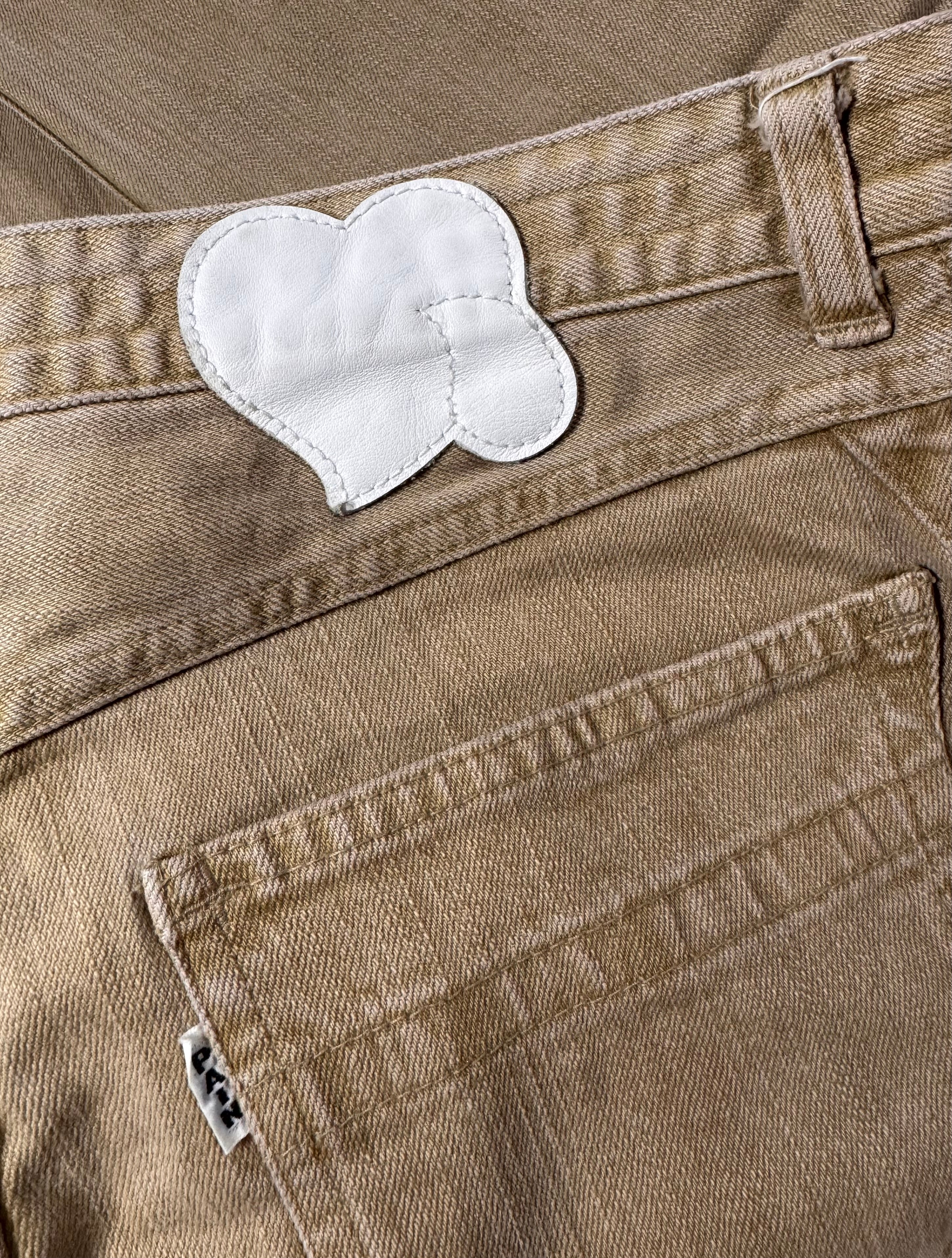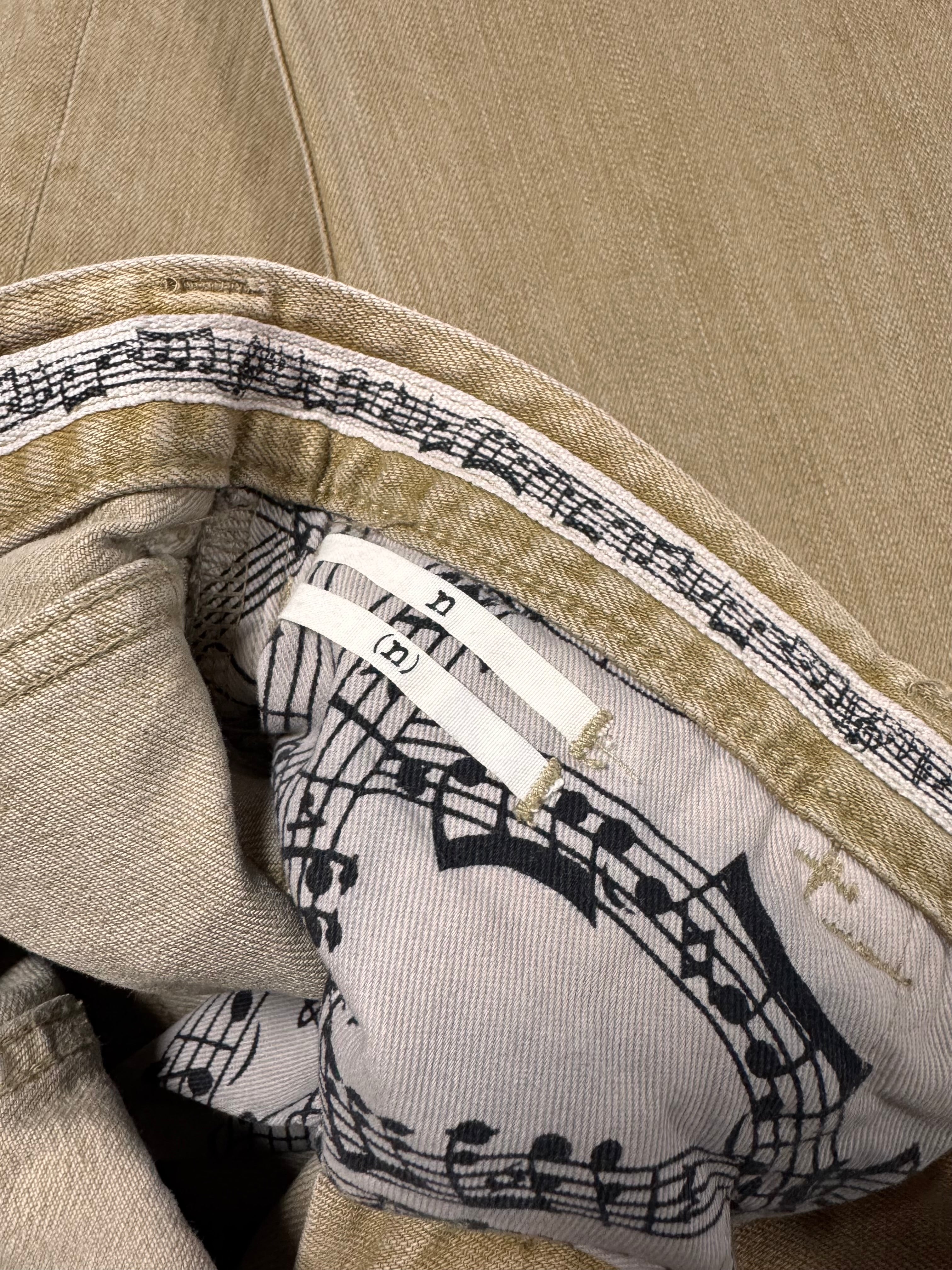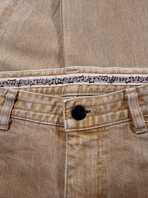 Signature pair of the ‘Pain’ denim from Spring/Summer 2007 “About a Boy”, themed around a Western style, featuring cowboy referenced garments. This beautiful pair features a tan wash with the music note interior lining. Iconic crying heart patch/pain tab on the rear. In great condition, maintains top quality