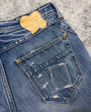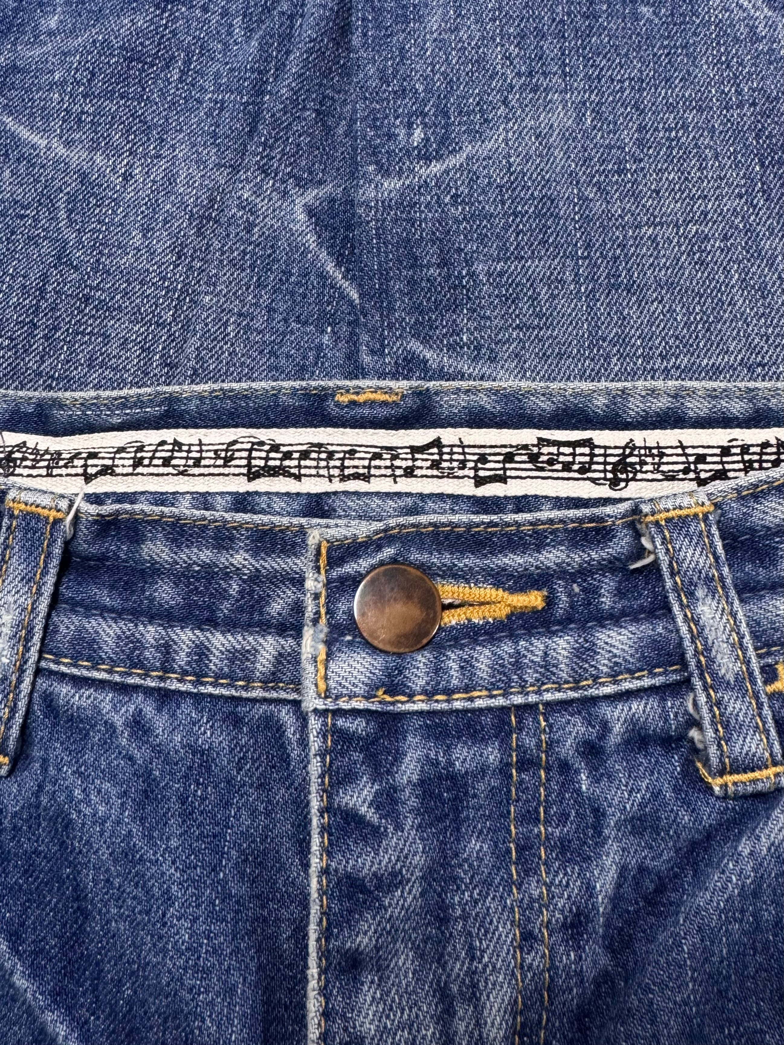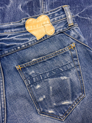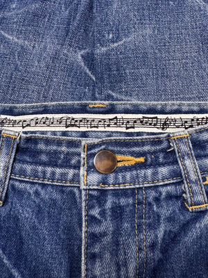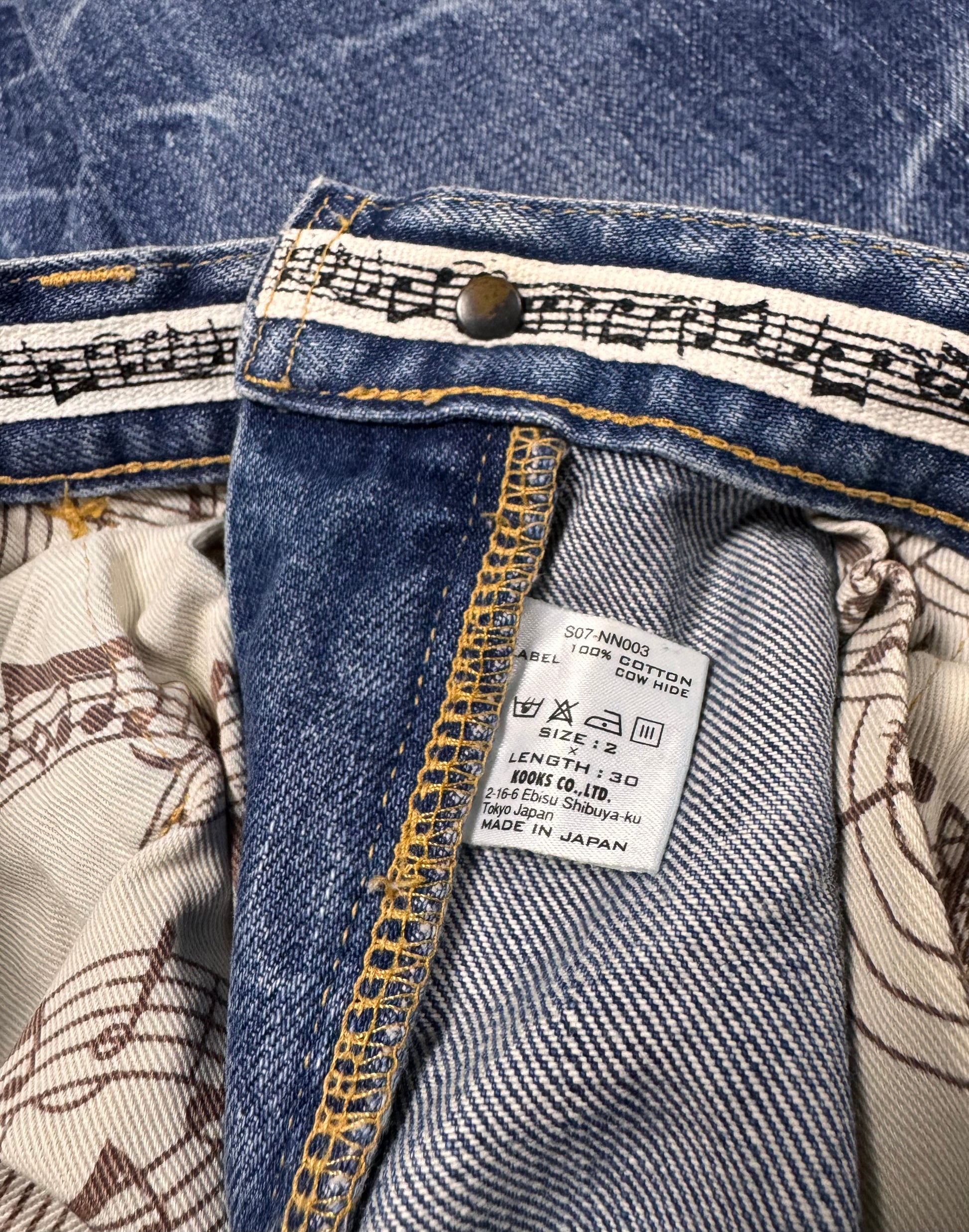 From Takahiro Miyashita’s iconic Spring/Summer 2007 “About A Boy” collection, these Number (N)ine denim feature a beautifully faded vintage wash with natural whiskering, knee distressing, and subtle abrasions throughout, giving the denim a worn-in character reminiscent of years of wear. Signature ‘crying heart’ leather l patch sits at the back waistband, while the interior reveals the collection’s recognizable musical score lining—an homage to the music-inspired narrative of the season. In fantastic condition for its age with no major flaws or damages