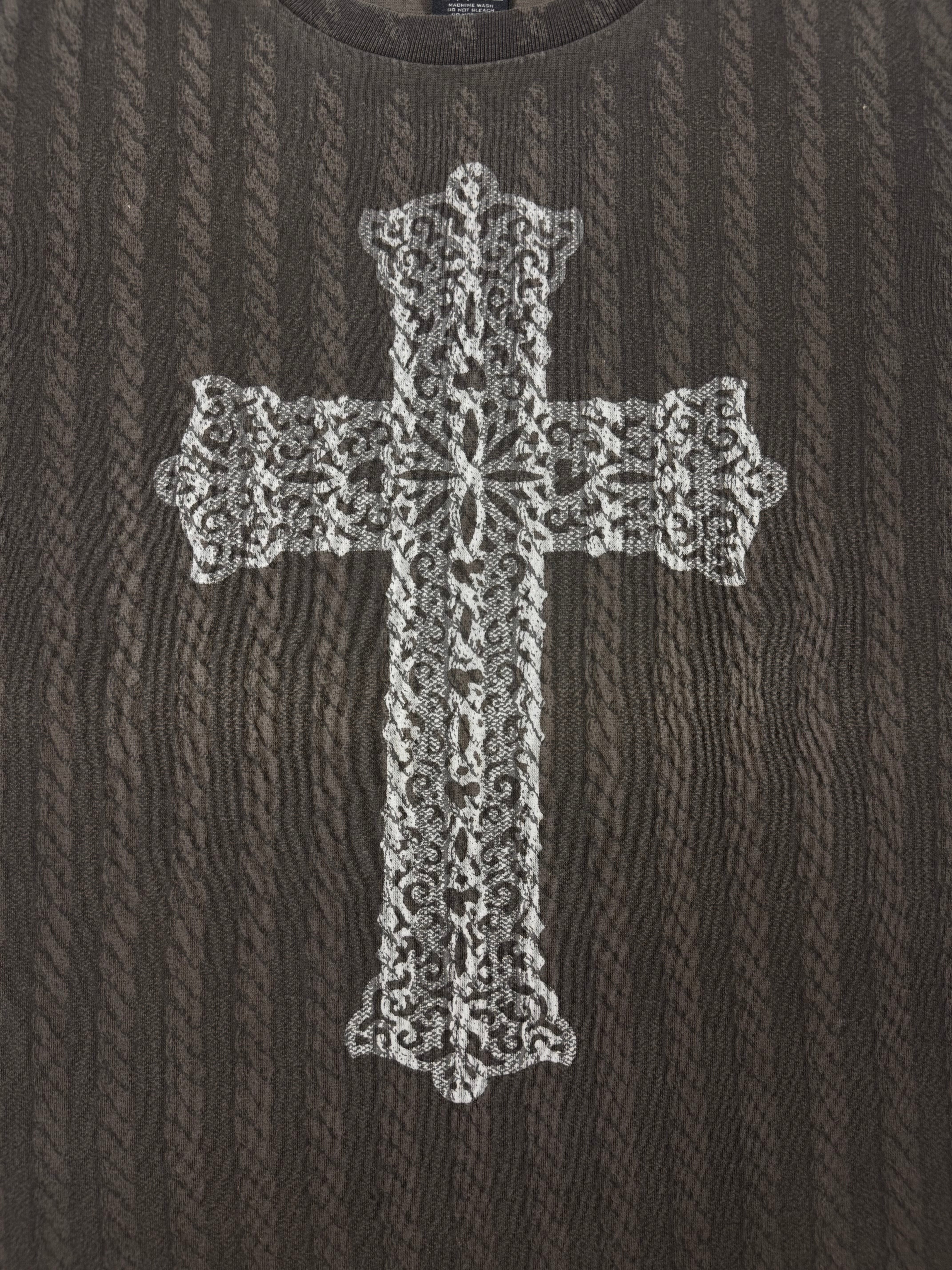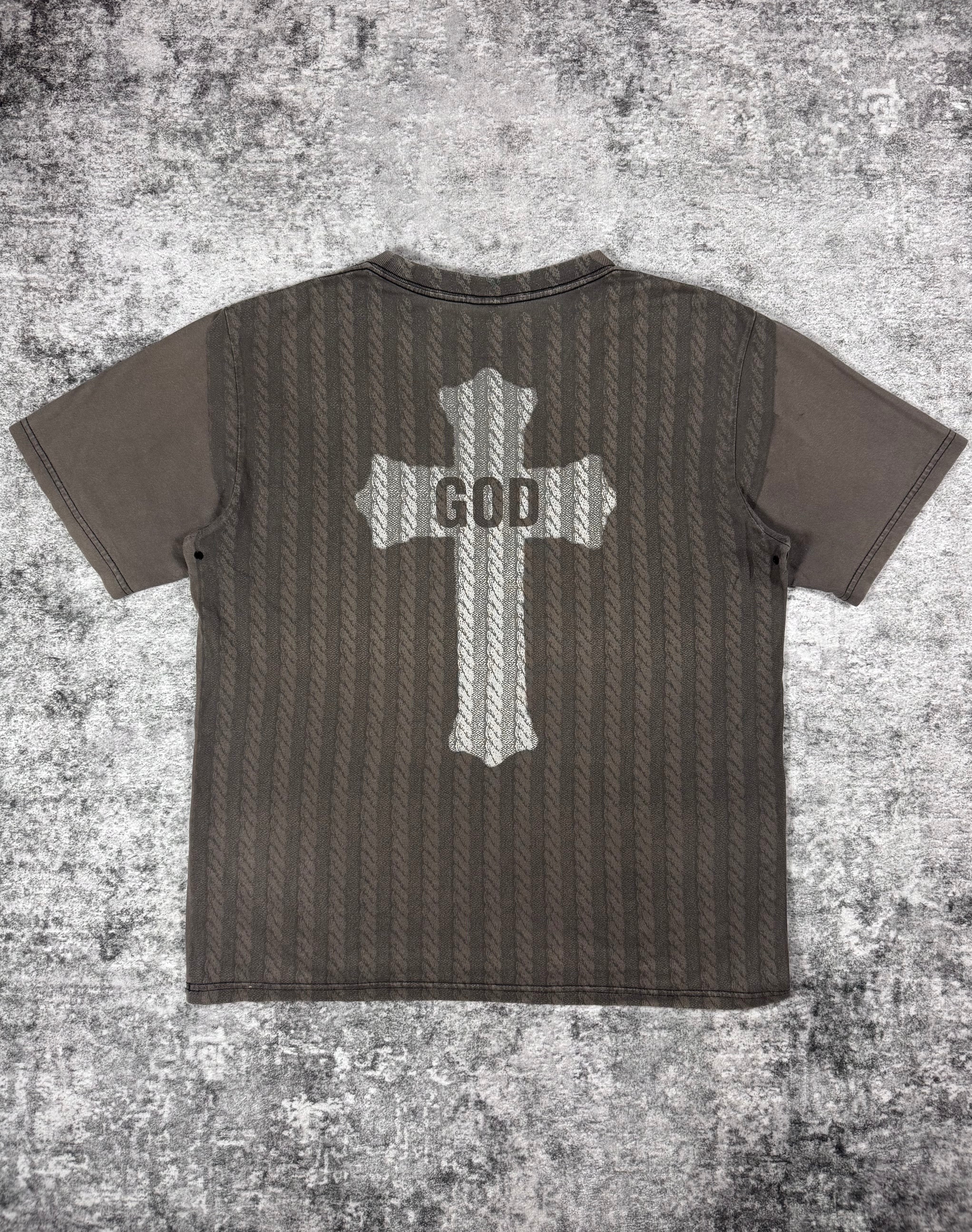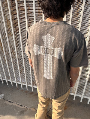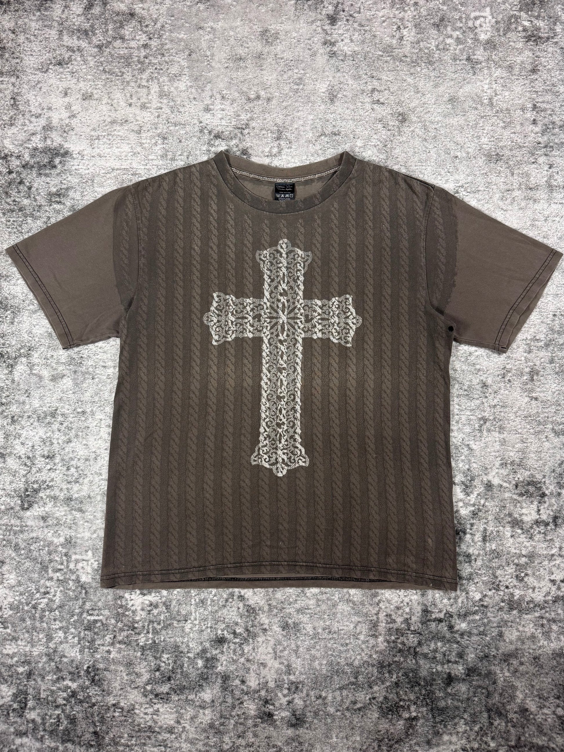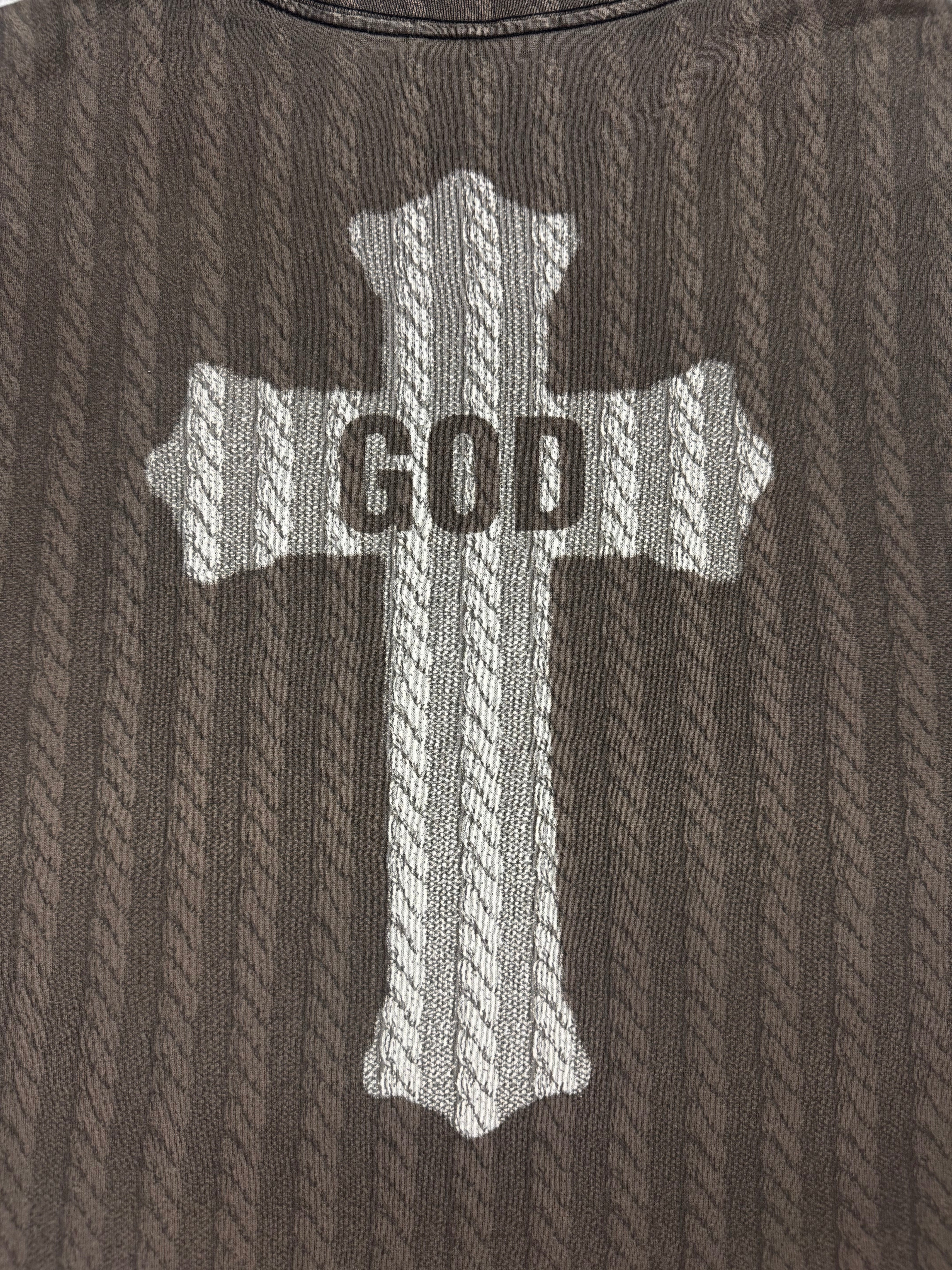 From Spring/Summer 2007 “About a Boy” this t shirt features a vertical feinted rope graphic throughout, with intricate crosses on both sides with ‘GOD’ printed on the rear. In good condition with no flaws or damages