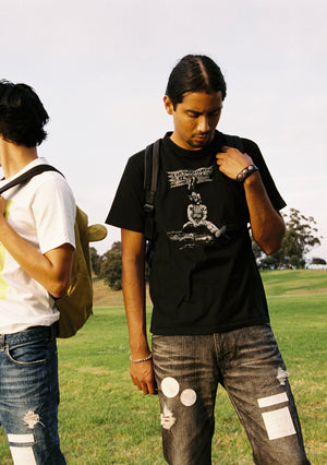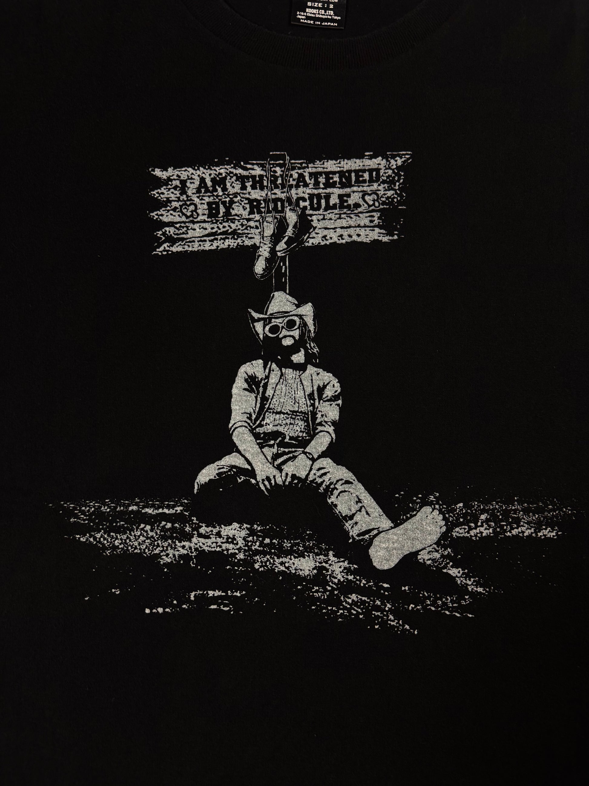 From Spring/Summer 2007 “About A Boy”, all black t shirt featuring Kurt Cobain under a sign that reads, “I am threatened by ridicule” with crying heart motifs. In good condtion with no flaws or damages