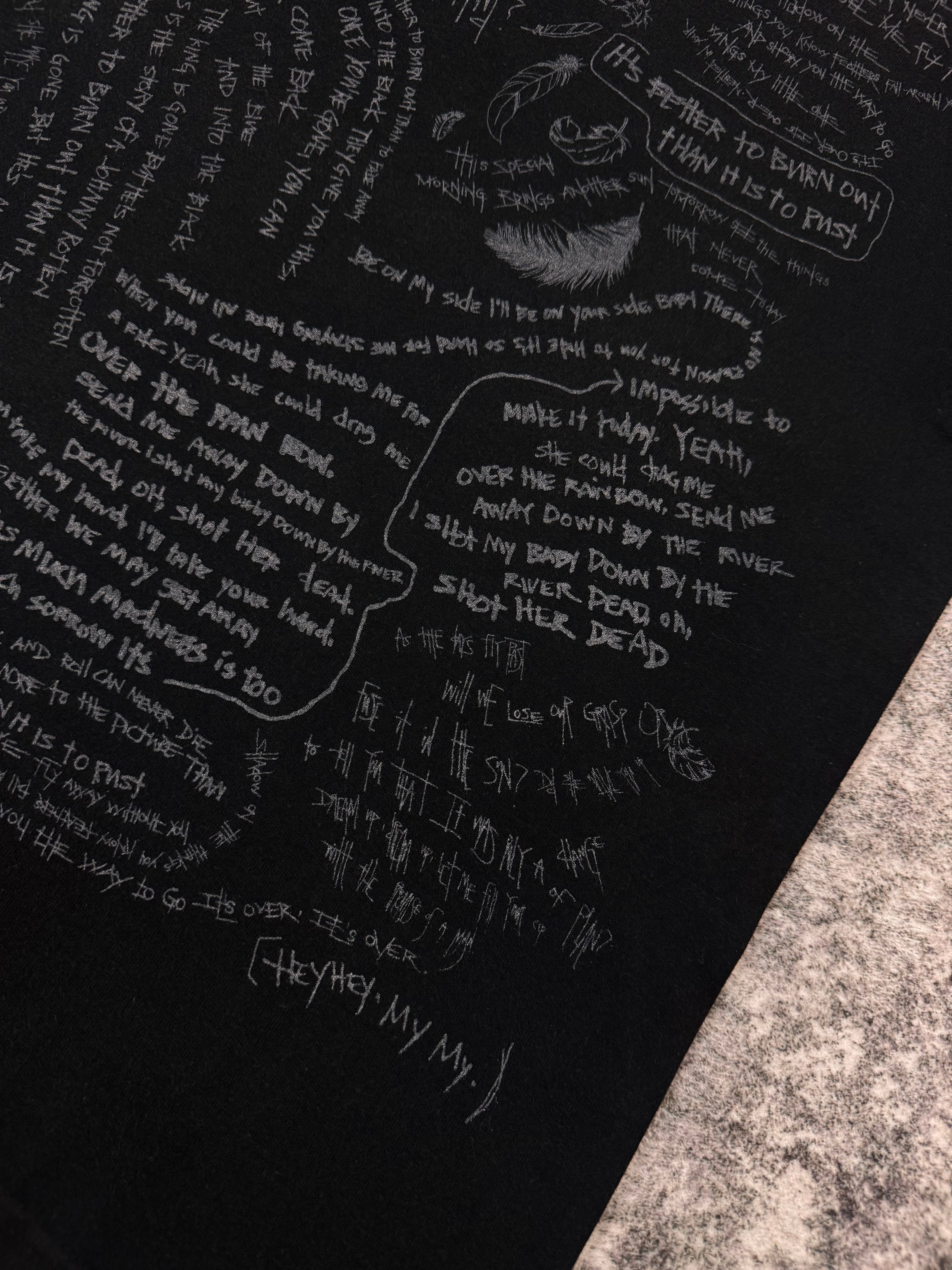 From Spring/Summer 2008 “Birds”, featuring Neil Young lyrics scattered around the front side erratically with feather motifs. In good condition with some fading from aging