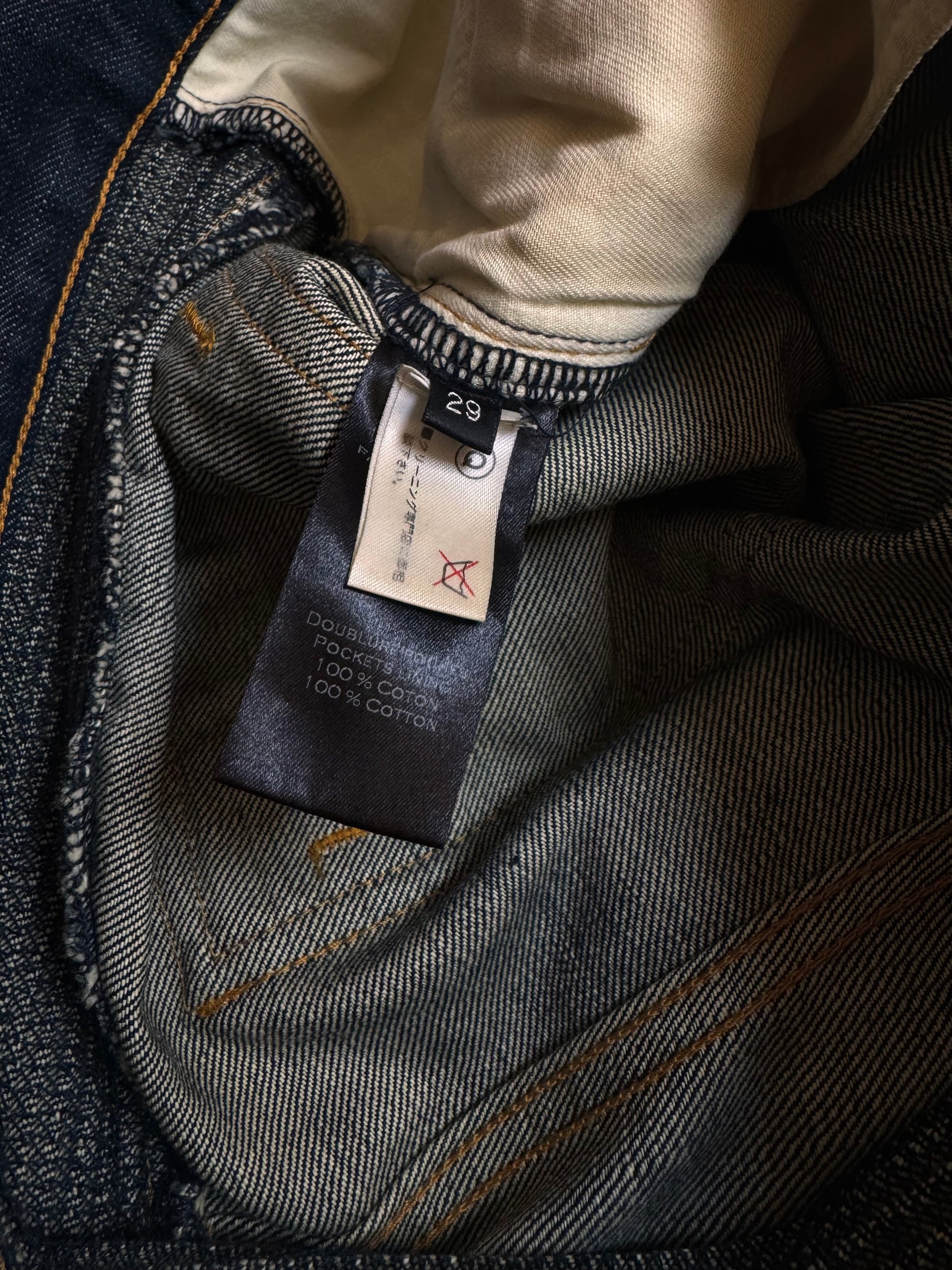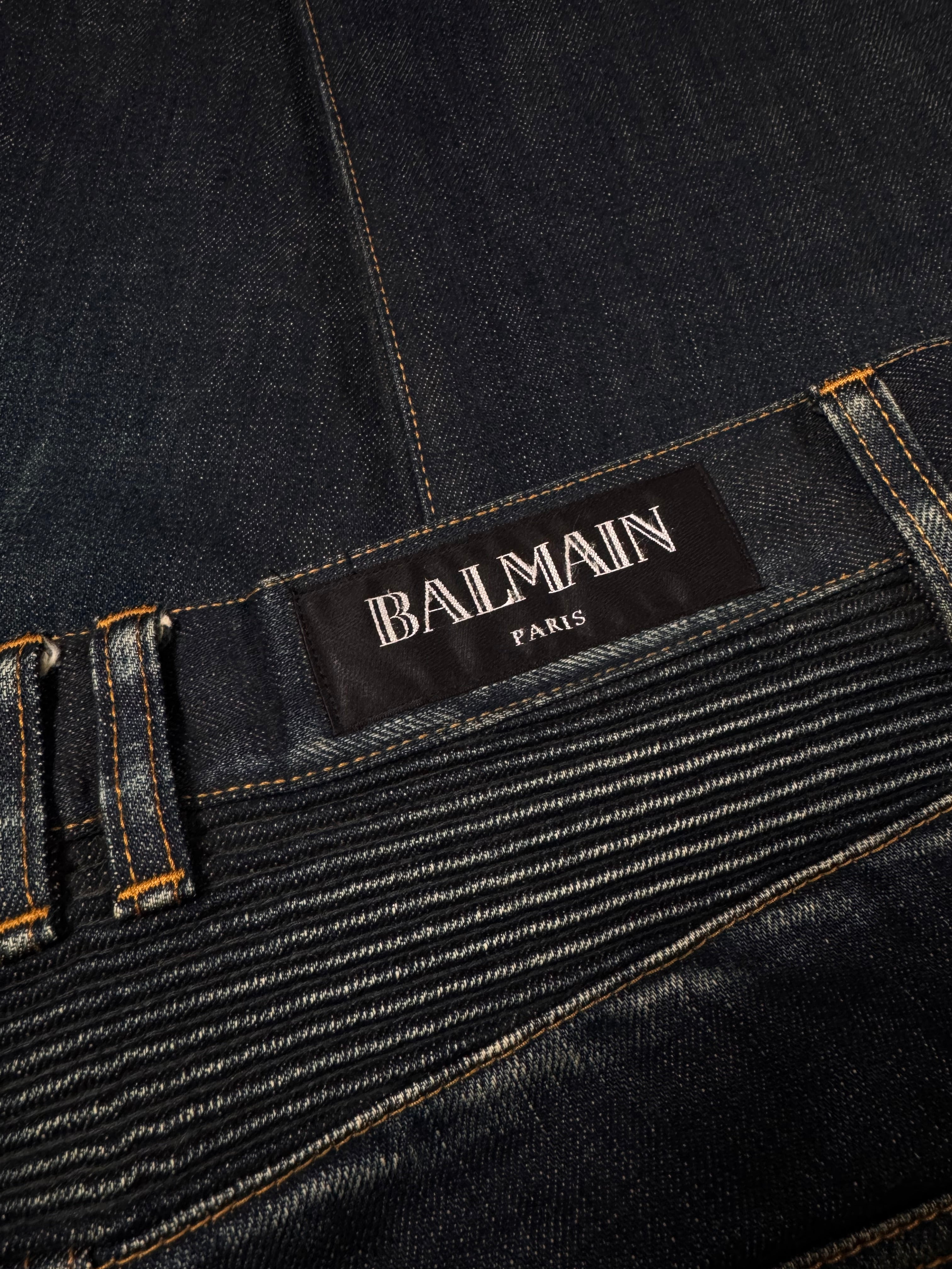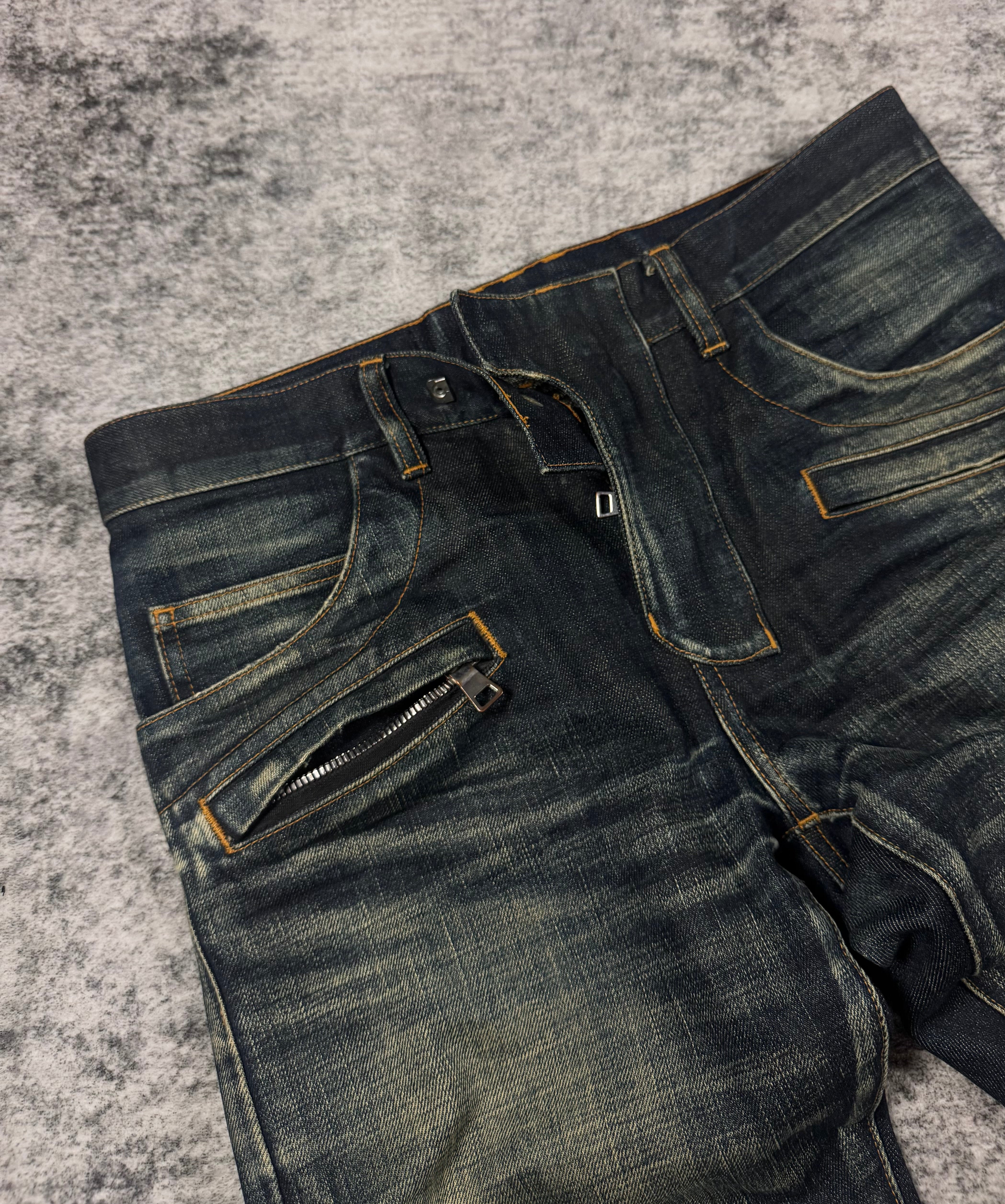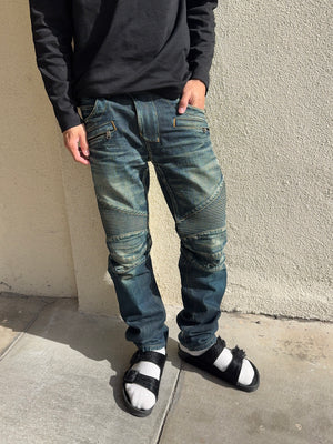 These Balmain Homme biker jeans from Spring/Summer 2014, designed under Olivier Rousteing, feature the house’s signature moto construction with ribbed accordion knee panels, articulated thigh quilting, and zippered pockets for a sharply engineered silhouette. While firmly rooted in Rousteing’s era of bold, body-conscious luxury, the design clearly carries forward the aggressive, rock-inspired biker DNA first established by Christophe Decarnin in the late 2000s. Finished in a richly faded deep indigo wash, the denim balances a worn-in, road-tested look with the precise tailoring and polish that define modern Balmain.