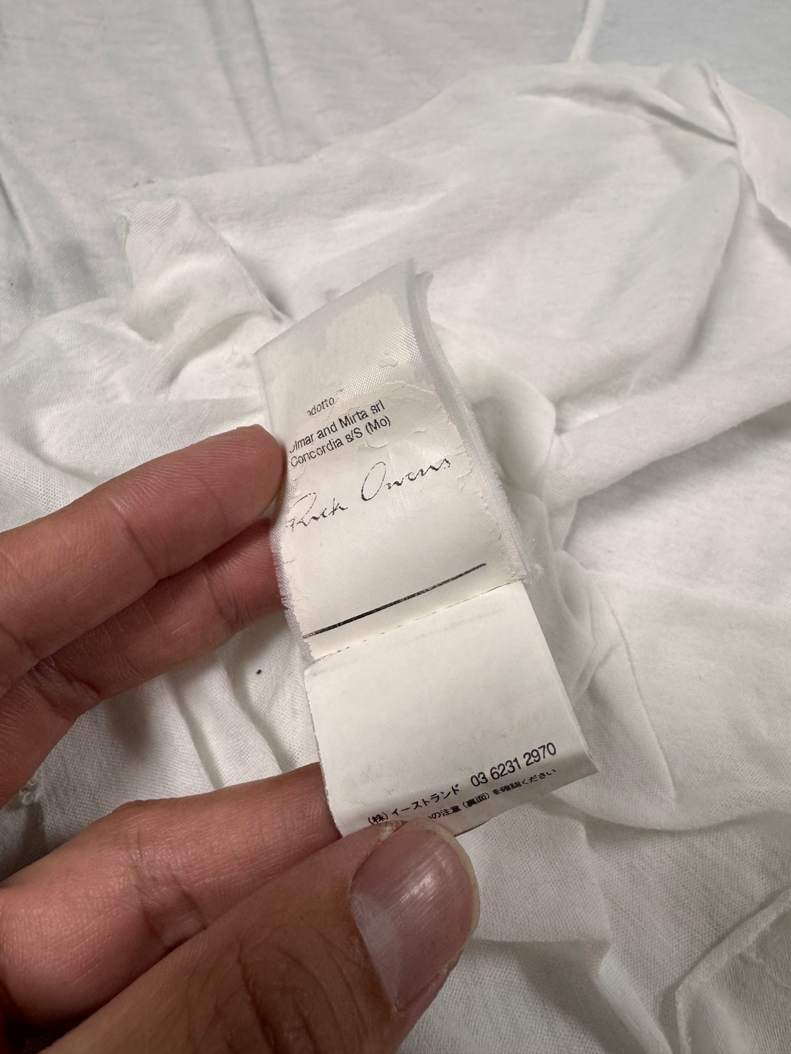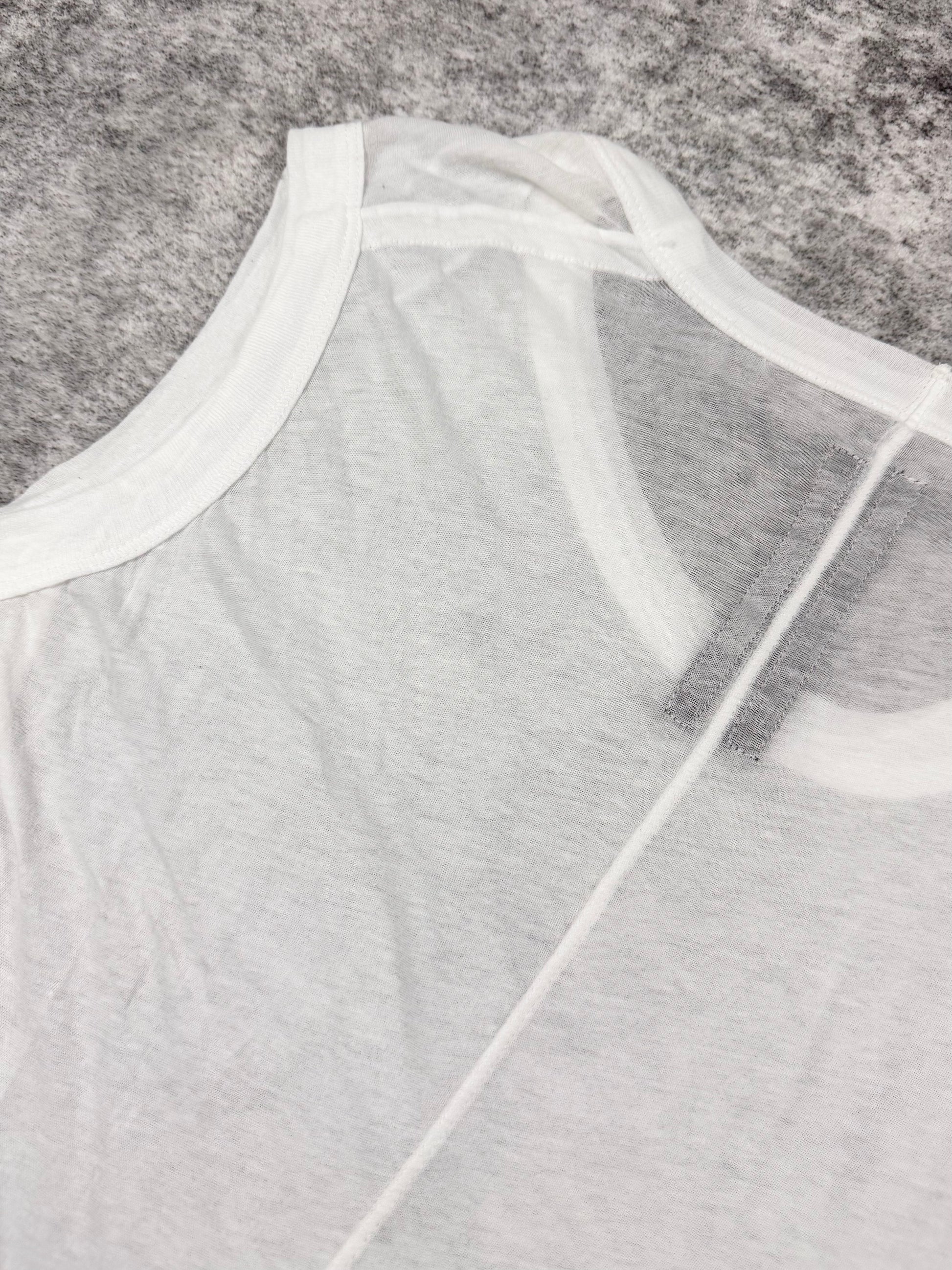 A minimalist sleeveless top from Rick Owens’ Spring/Summer 2015 “Island” collection, crafted from lightweight off-white cotton jersey with a soft, fluid hand feel. The design features a longline silhouette with wide arm openings and a subtle exposed center seam that gives the piece its signature asymmetric drape. In good condtion with some small damages, but maintains good overall quality