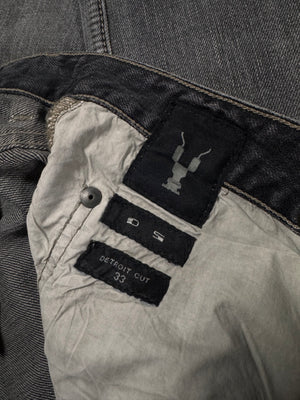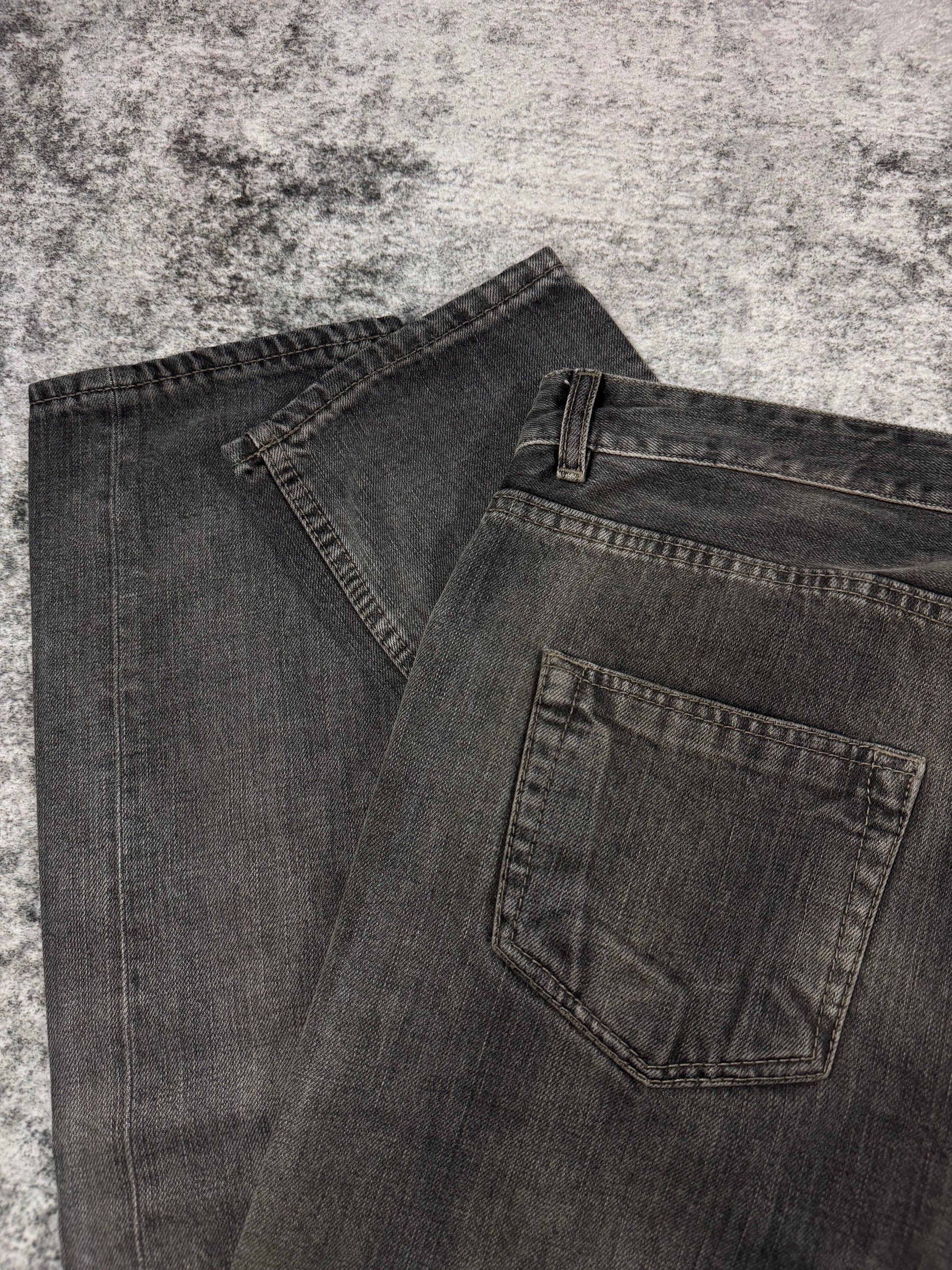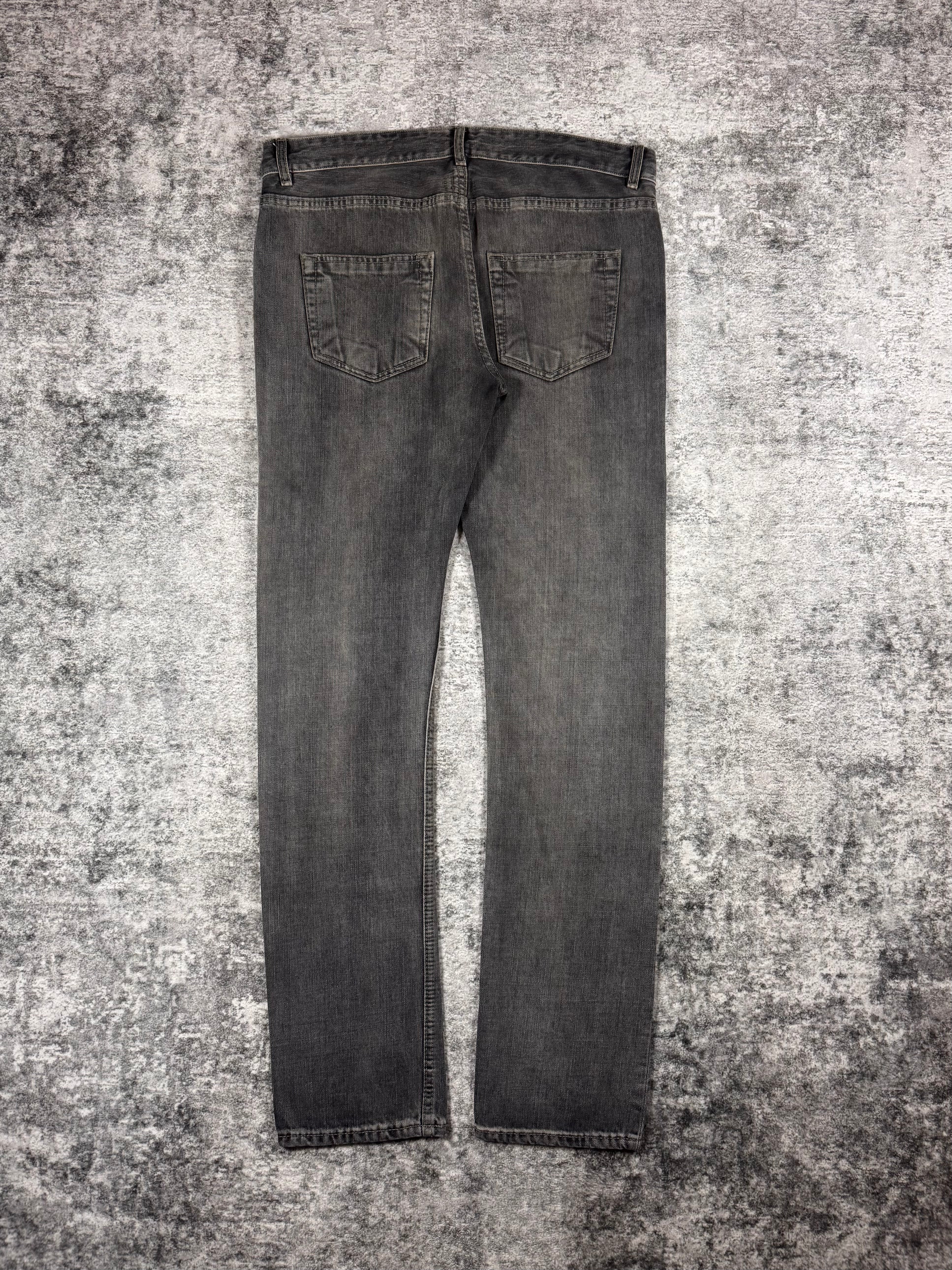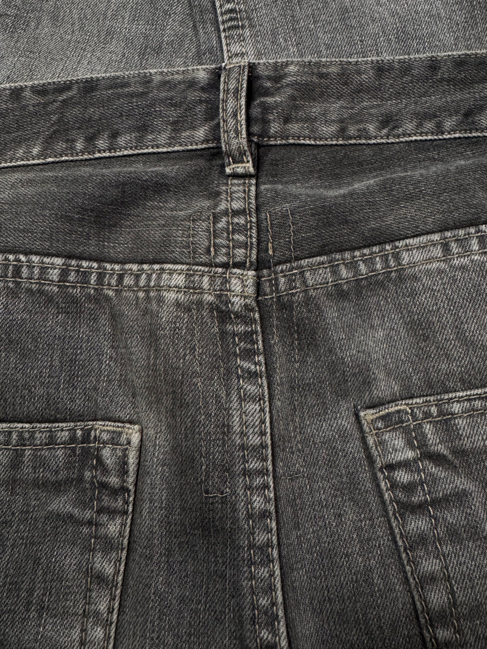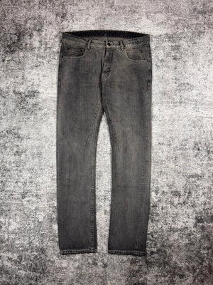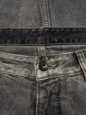Stunning pair of Rick Owens denim in the signature Torrance cut silhouette from the Spring/Summer 2018 collection titled “Dirt”. Coming in the faded grey ‘Hustler’ wash with a slight mud-wash effect. ‘DS’ logo embossed on all hardware buttons. In brilliant condition with no flaws or damages