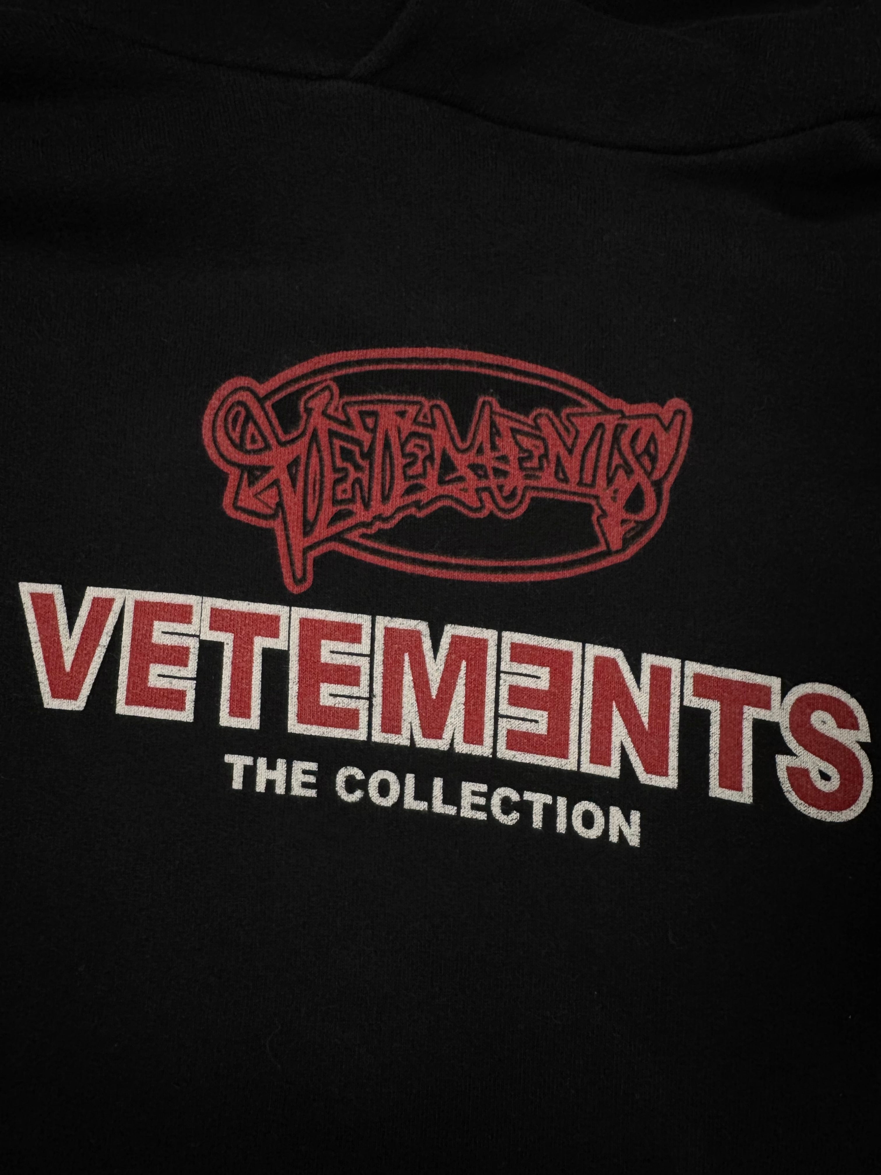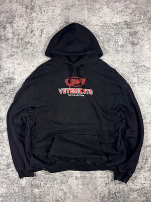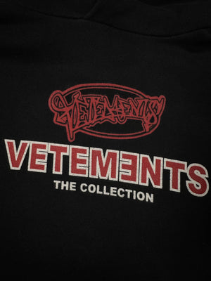 From the Spring/Summer 2018 collection, a classic black Vetements pullover hoodie featuring the “The Collection” graphic printed across the chest. The design combines a bold red graffiti-style Vetements emblem layered above a classic block logo, reflecting the label’s signature subversive branding. Constructed from heavyweight cotton fleece with the signature oversized fit. In solid condition with no major flaws or damages