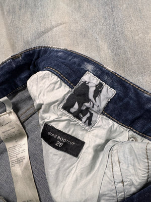From Spring/Summer 2024 “LIDO”, these Rick Owens denim in the ‘Bias Bootcut’ cut features a strikingly fluid silhouette that drapes elegantly from hip to hem, offering a modern reinterpretation of classic bootcut styling. Crafted on a bias cut, the denim gently hugs the body with subtle elasticity. Elastic waist accommodates for a range of waist sizes. In solid condtion with no major flaws