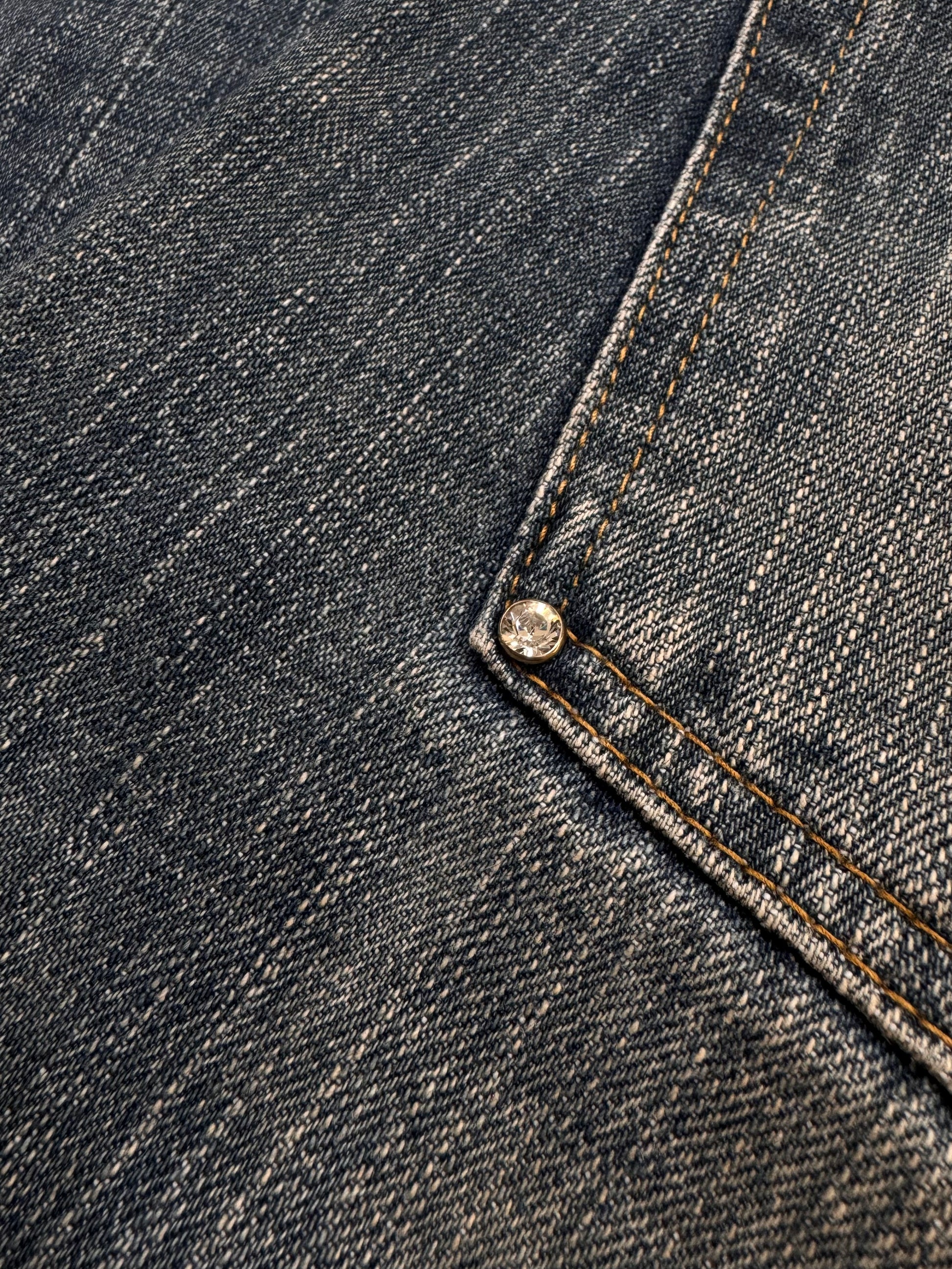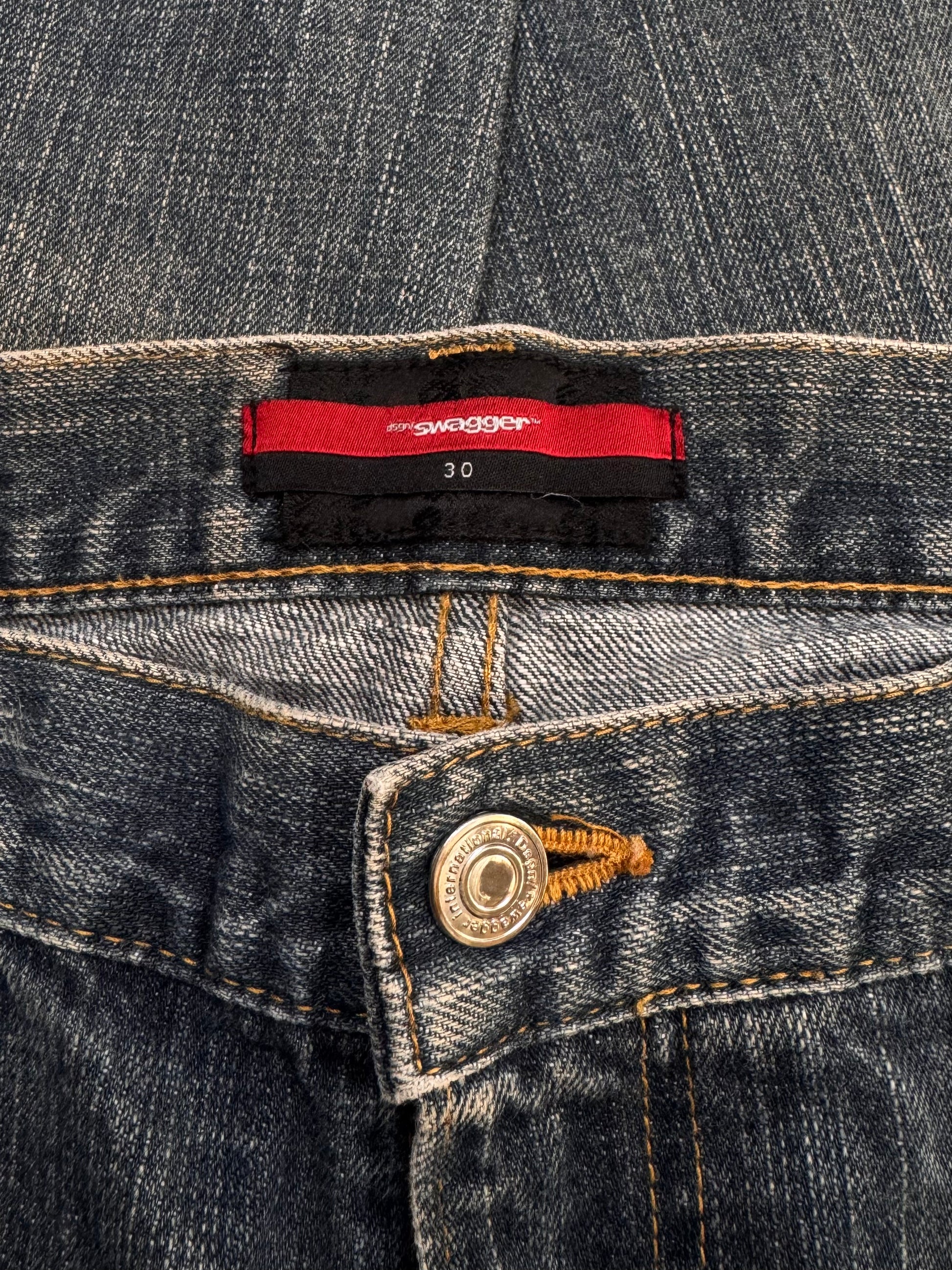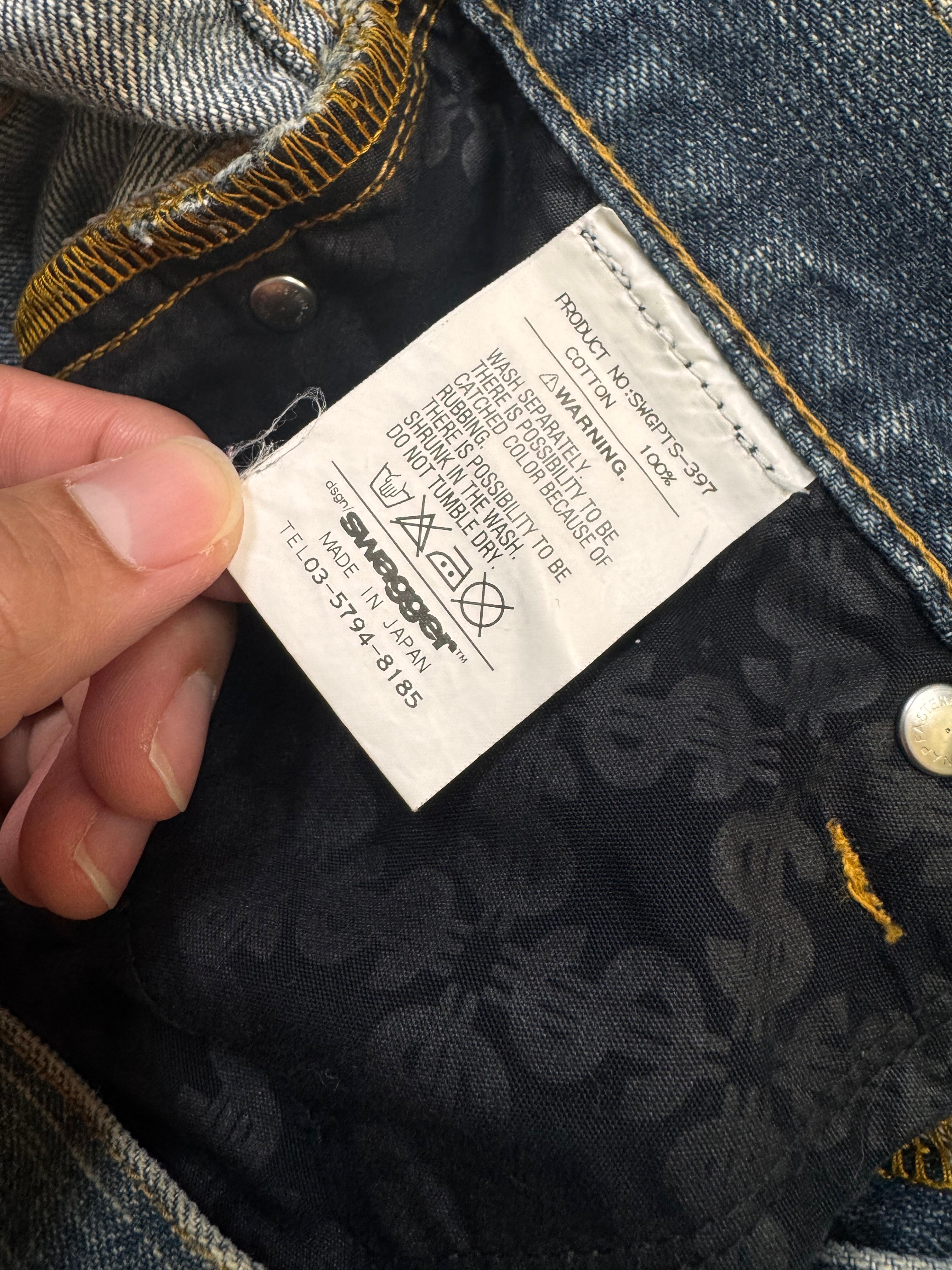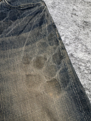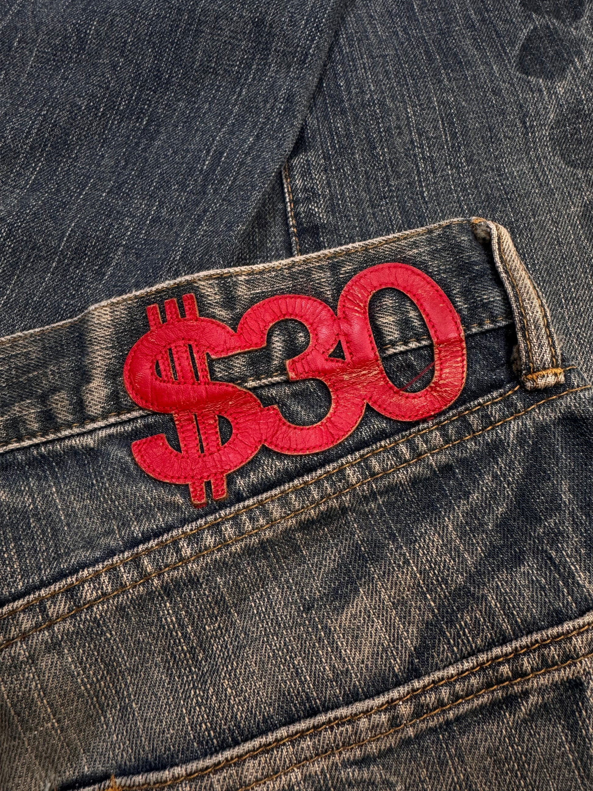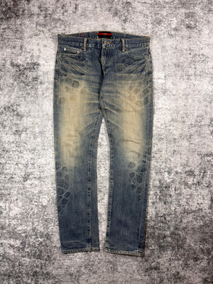 A standout pair of Swagger denim from the early 2000a, featuring a unique abstract leopard-like fade pattern across the thighs and legs, achieved through an intentional heavy wash process. The organic spotting blends with strong whiskering and tonal distressing, creating a layered, animal-inspired visual texture. Finished with the signature red “$30” leather back patch indicating the size. In solid condition with no major flaws or damages