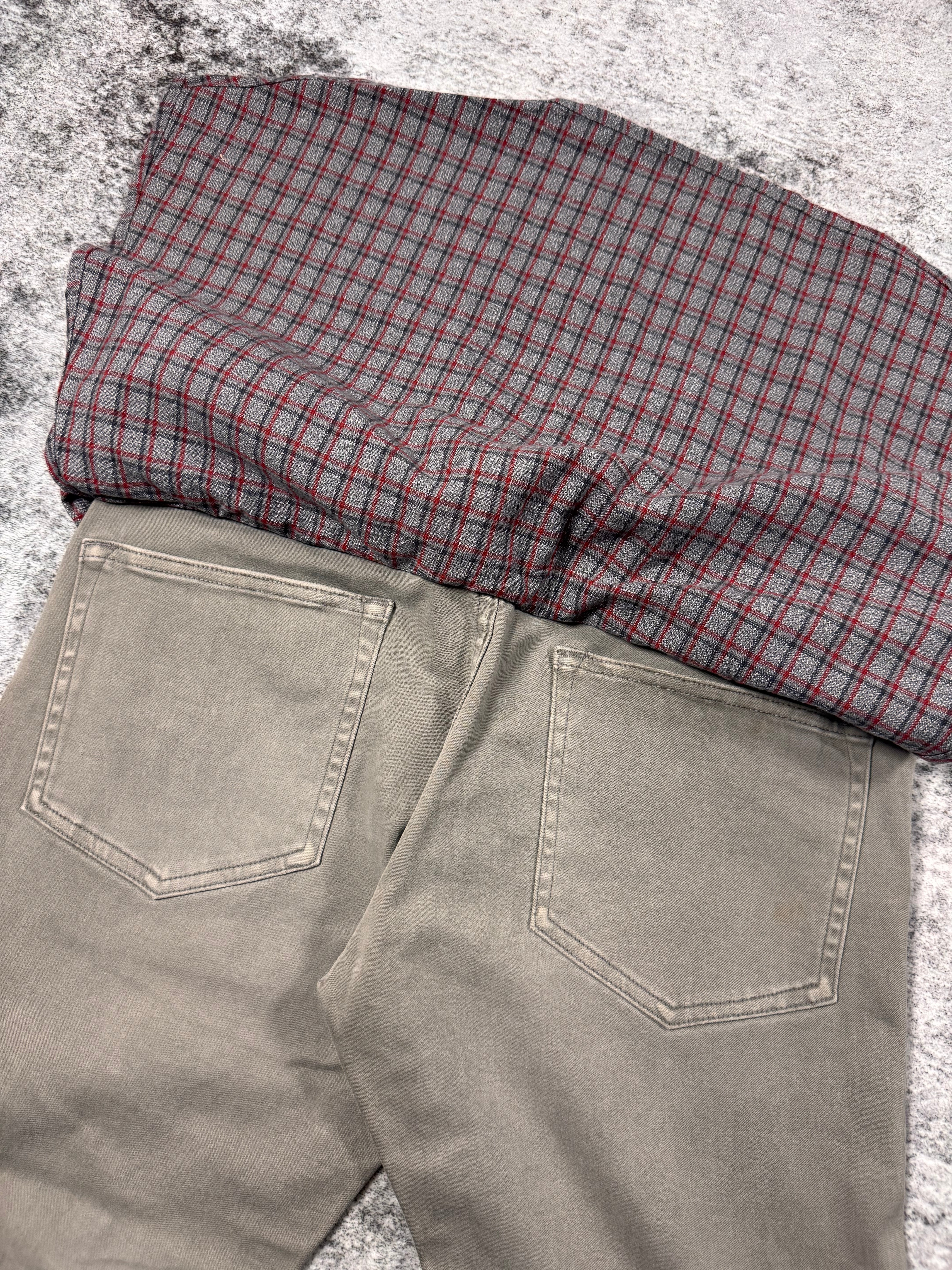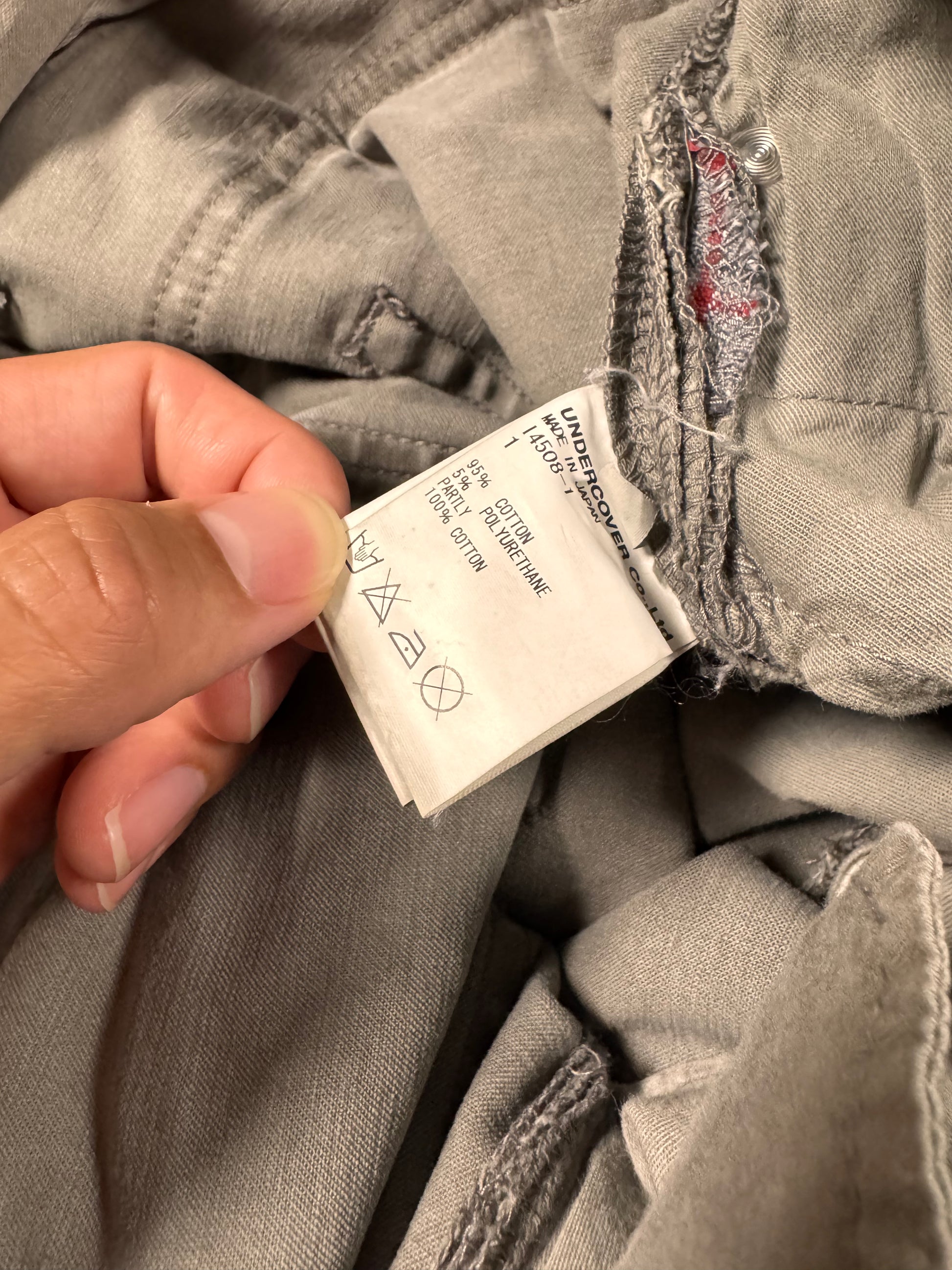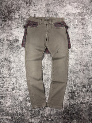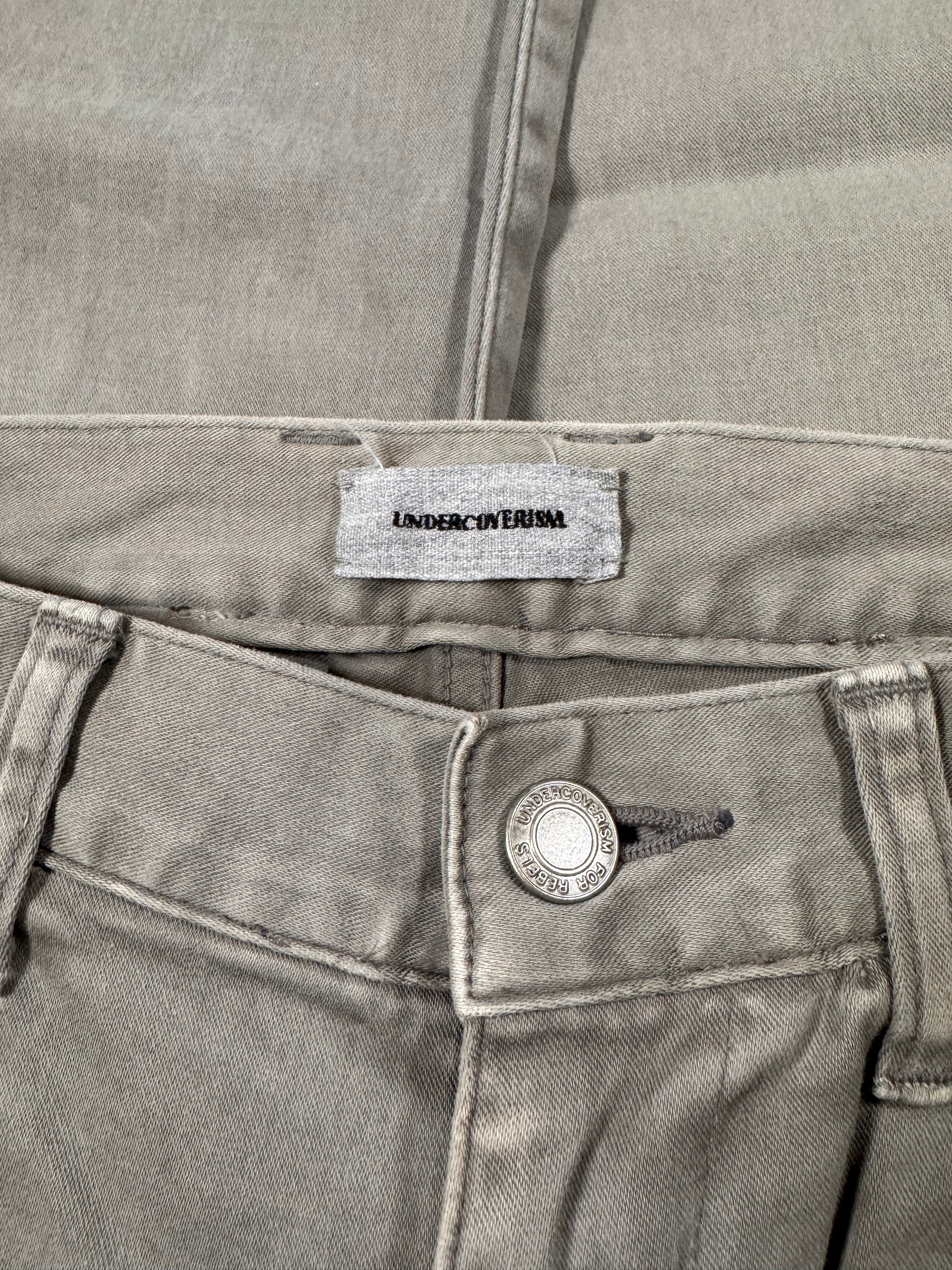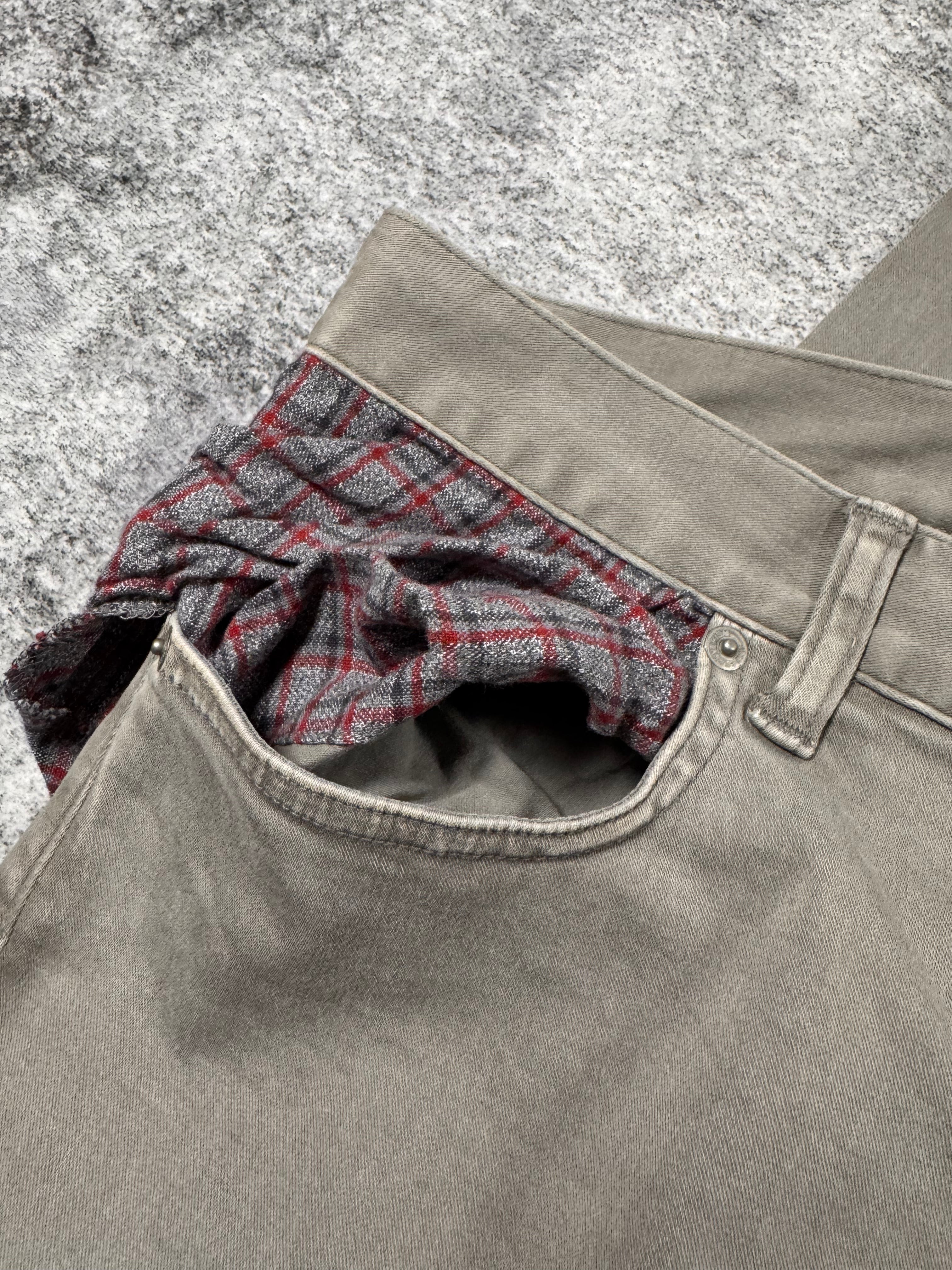 From Spring/Summer 2012 “Open Strings”, these light grey lightweight denim has a unique construction with a two-piece flannel cut sewn onto the rear of the denim. In good condition with no flaws or damages