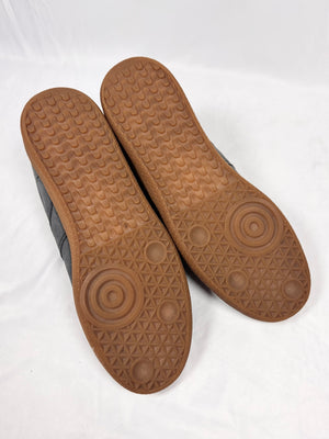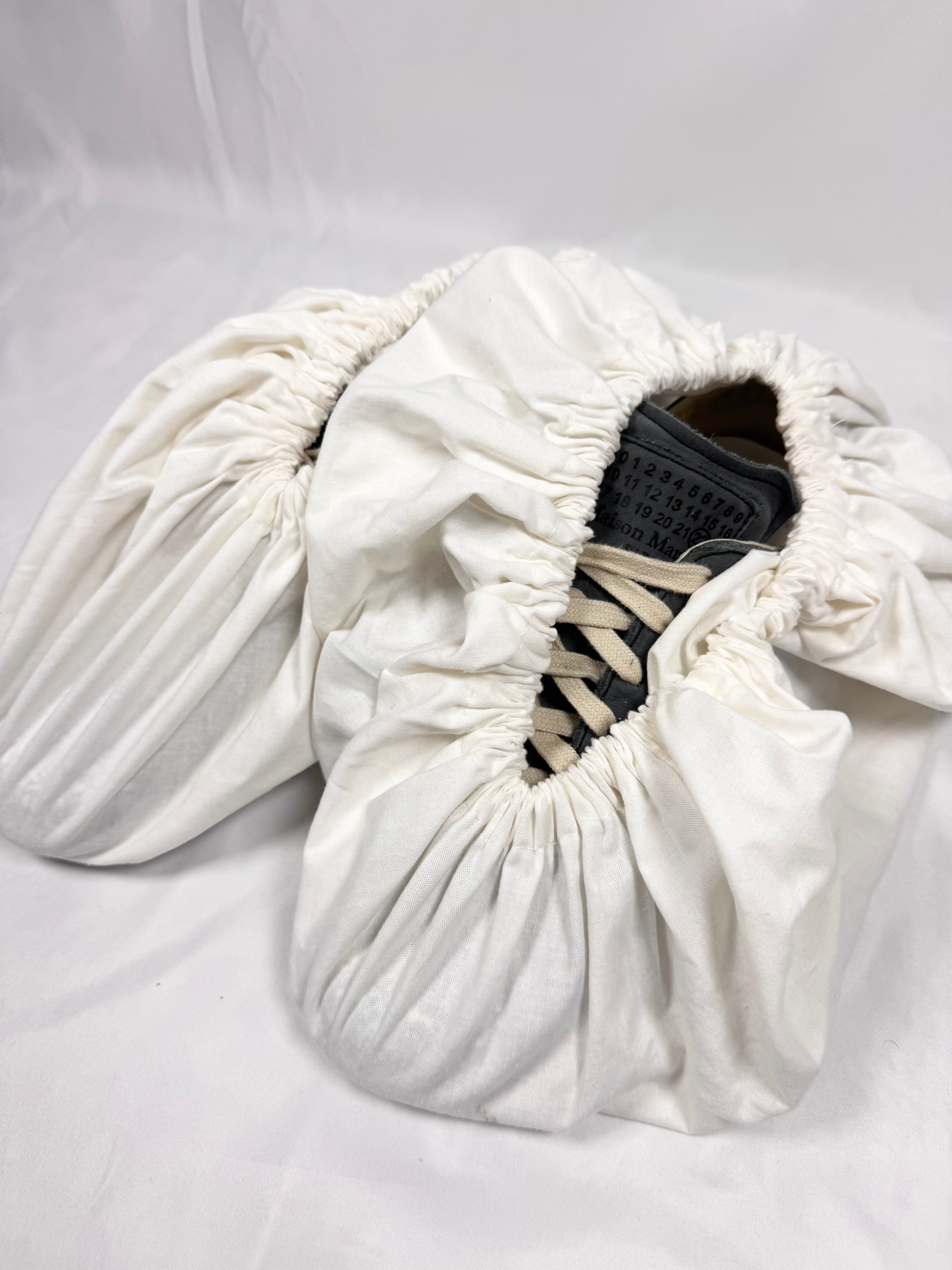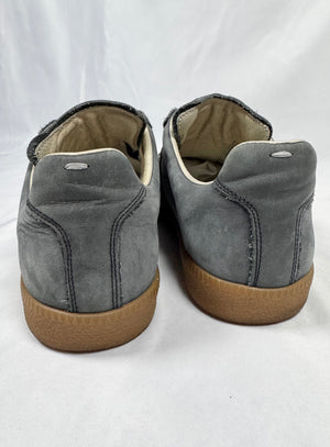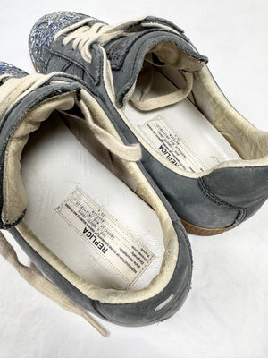 Signature pair of sneakers by Maison Margiela denoted as “replica”, as they are modeled after the German Army Trainers (GAT) and the silhouette roots extend back to the 1970s. This stunning pair is one of the most iconic variations with the paint splatter detailing on the upper, coming in a beautiful charcoal color way with a rubber sole. Features the iconic Maison Margiela number labeling on the tongue in suede. In amazing condition with no flaws or damages, very minor heel drag. Comes with the original shoe covers