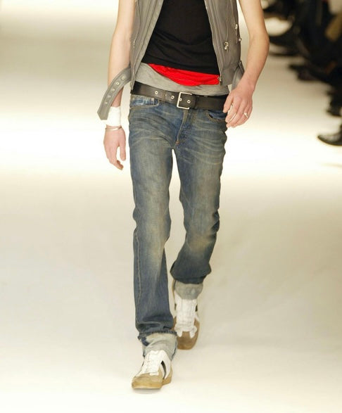 Iconic piece from Dior Homme’s Autumn/Winter 2004 “Victim of the Crime” collection under Hedi Slimane. These rust-wash denims exemplify the era’s sharp, rock-influenced minimalism - feature a distinctive oxidized fade that evokes natural wear and raw attitude. In beautiful condition with no flaws or damages (released gems/altered)