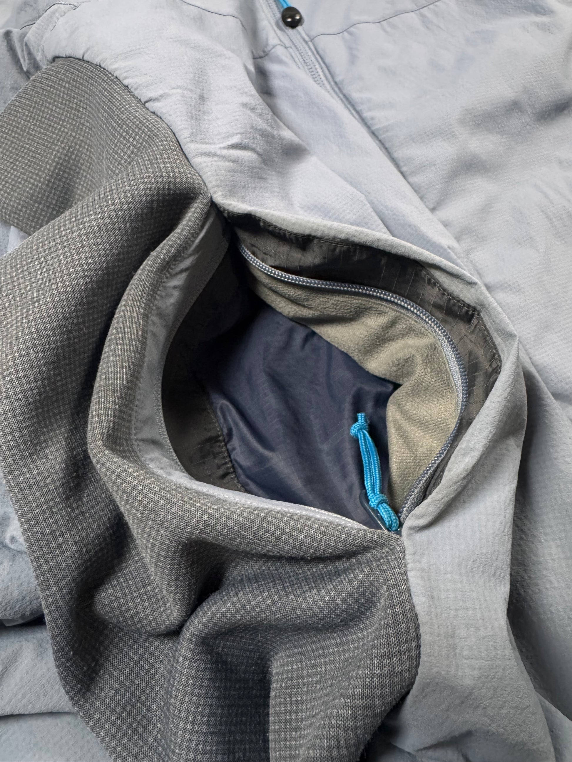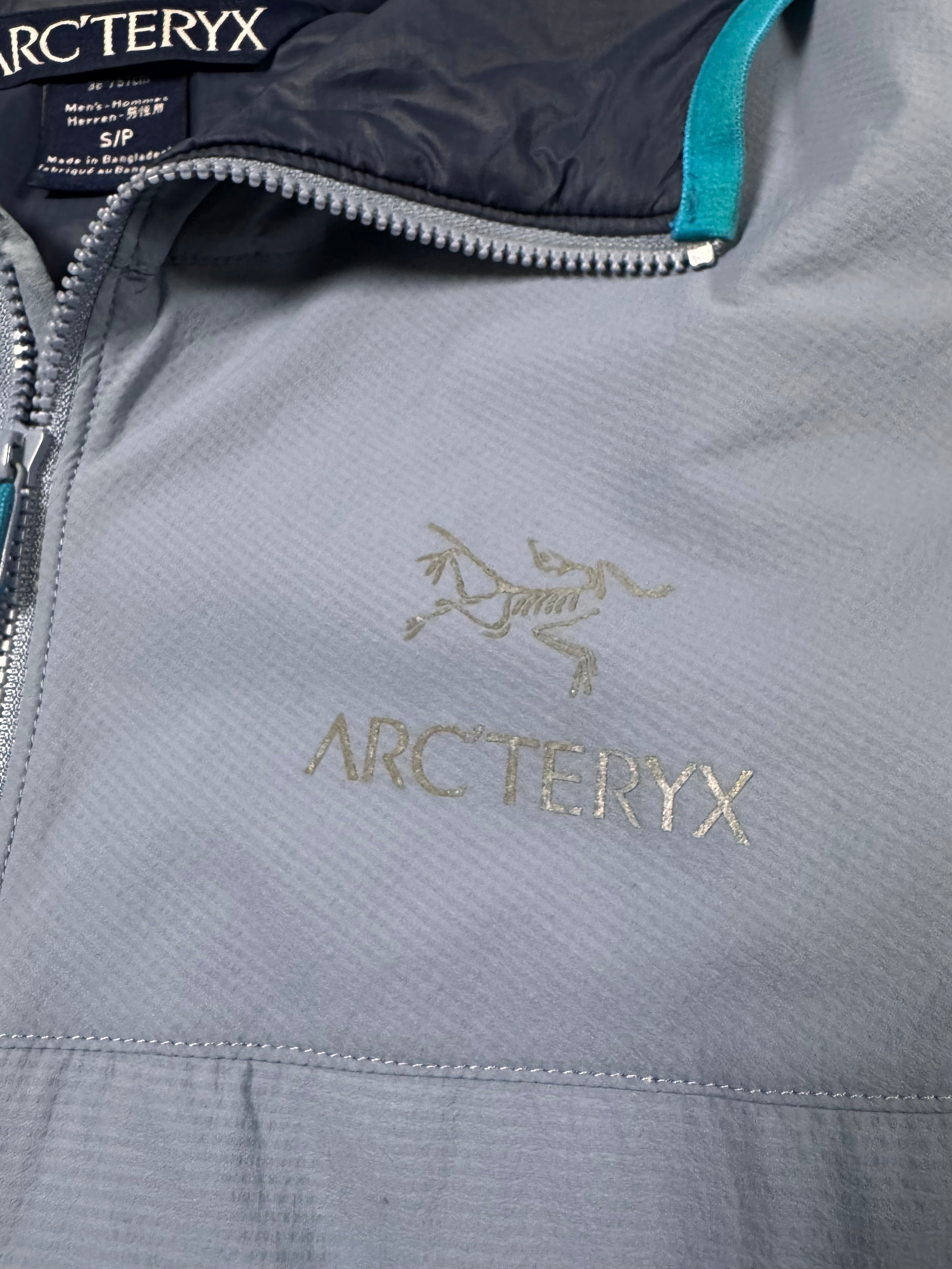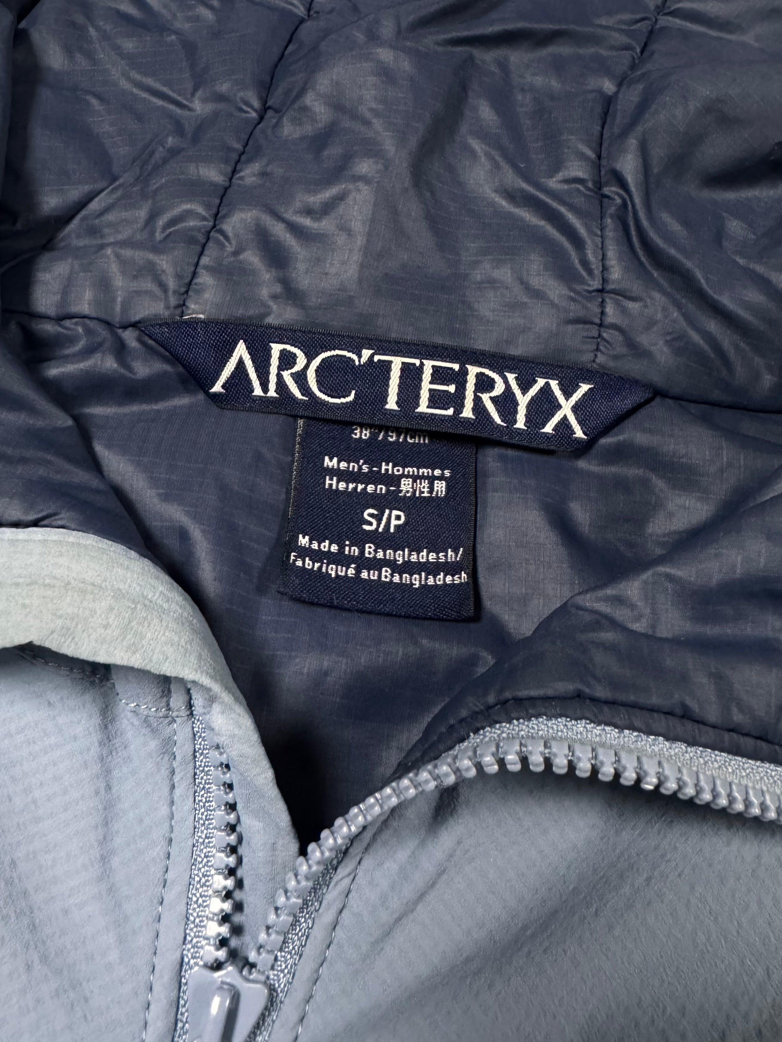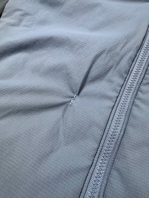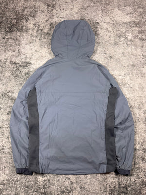 Stunning Arc’teryx jacket in the ‘Atom LT’ model released in 2013. Coming in a lovely two-tone ‘Silverstone’ color way, the hoody is made with water-resistant Tyono 20 face fabric that is breathable and durable. It also has stretch side panels to improve fit and freedom. The insulated StormHood adds warmth. The Arc’teryx fossil logo is featured on the chest. In good condition with minor flaws; maintains good quality