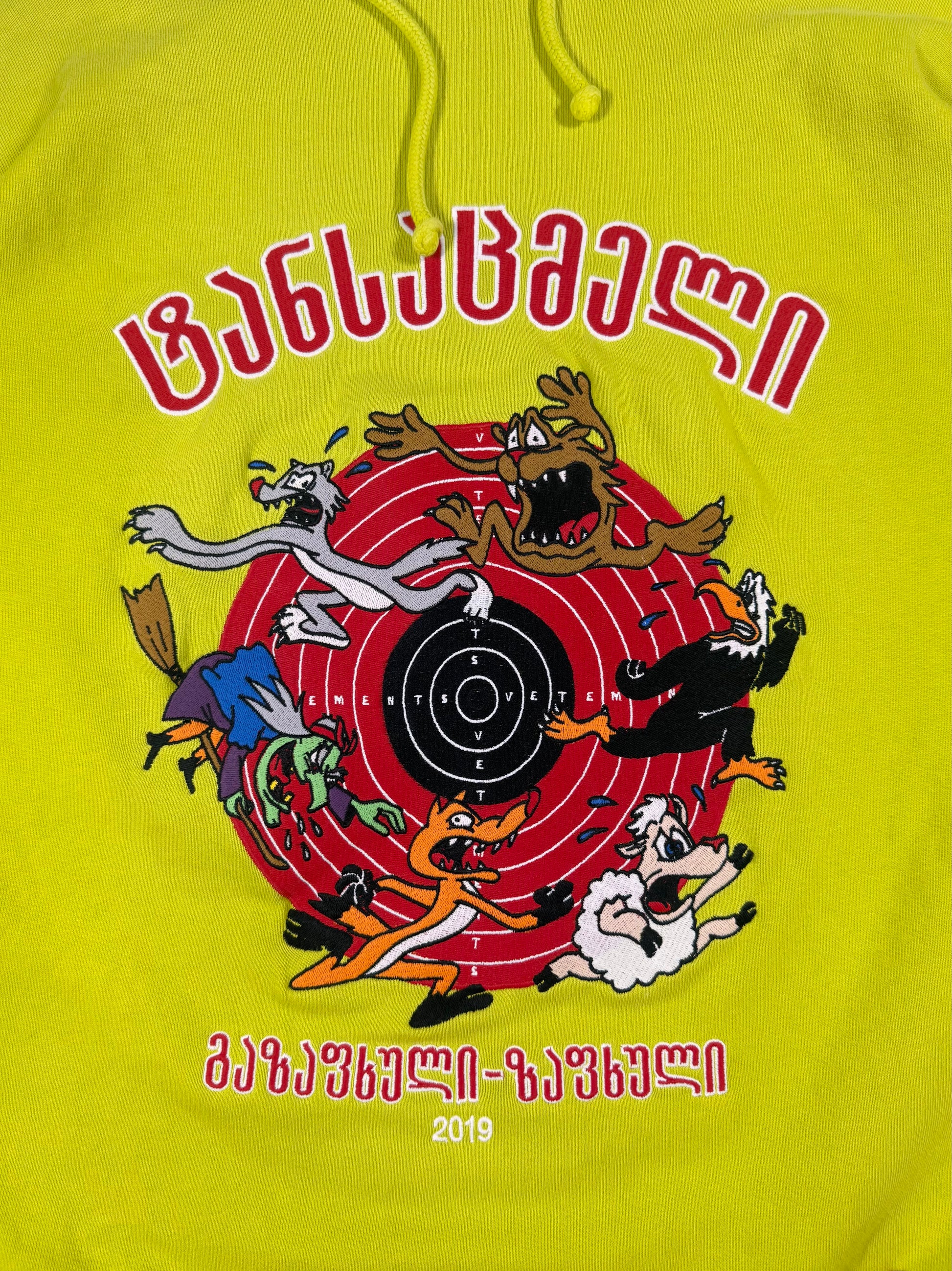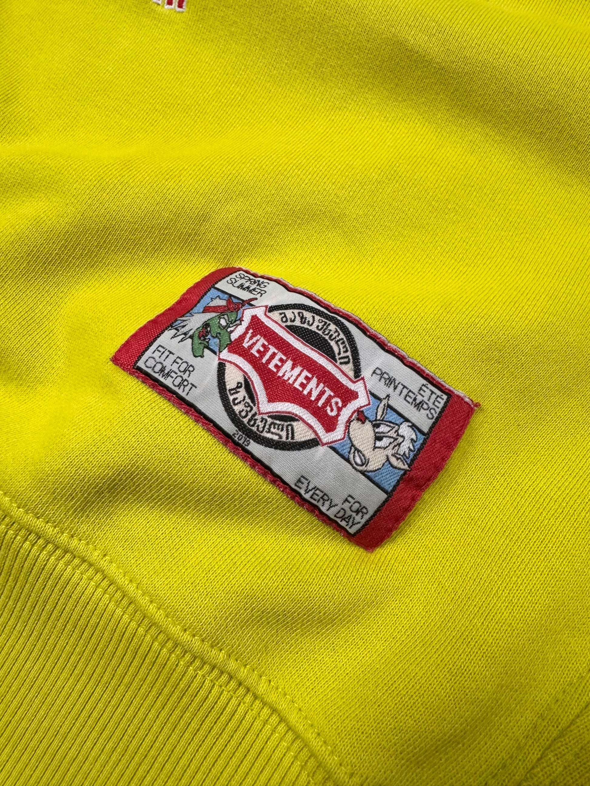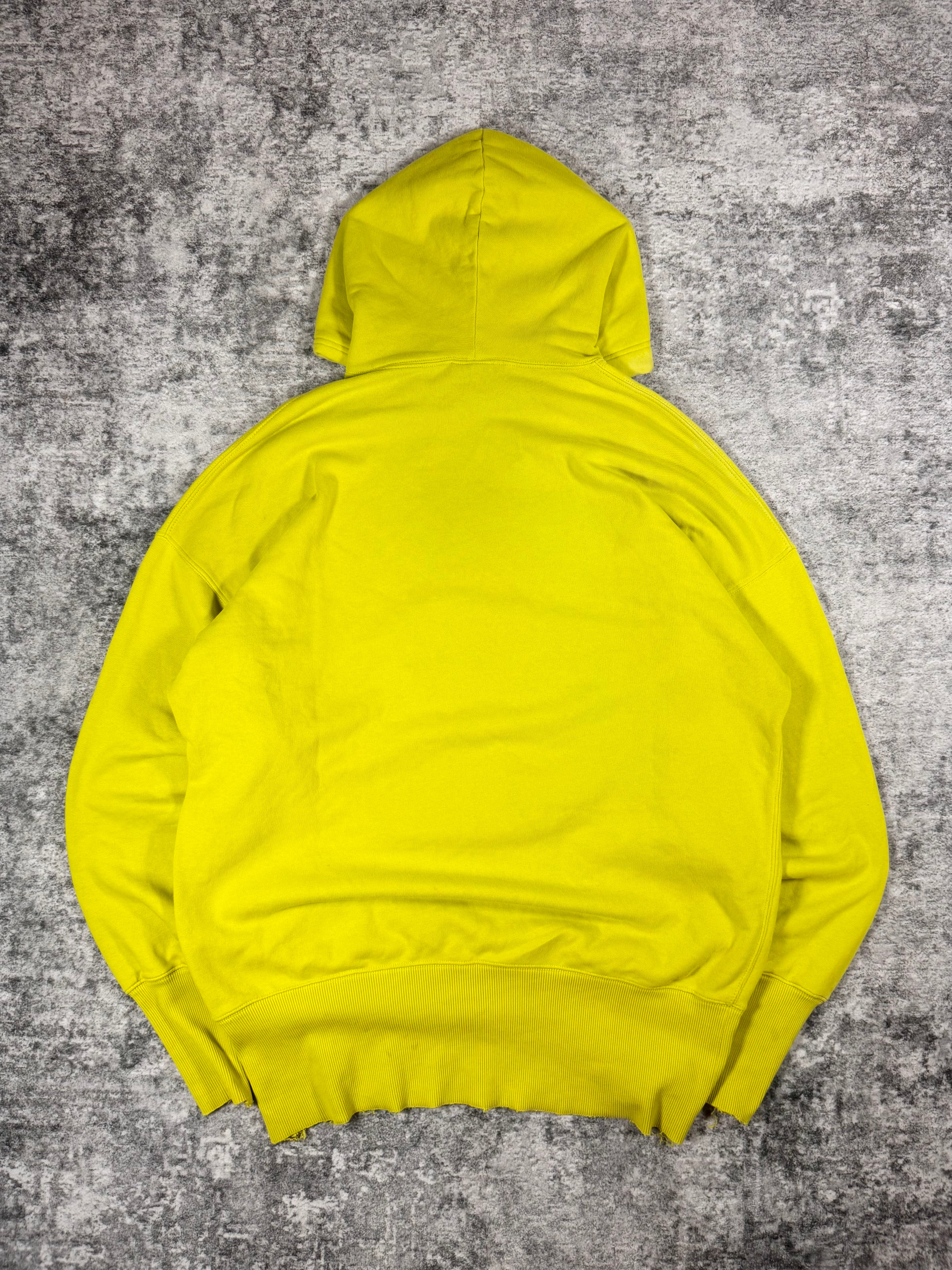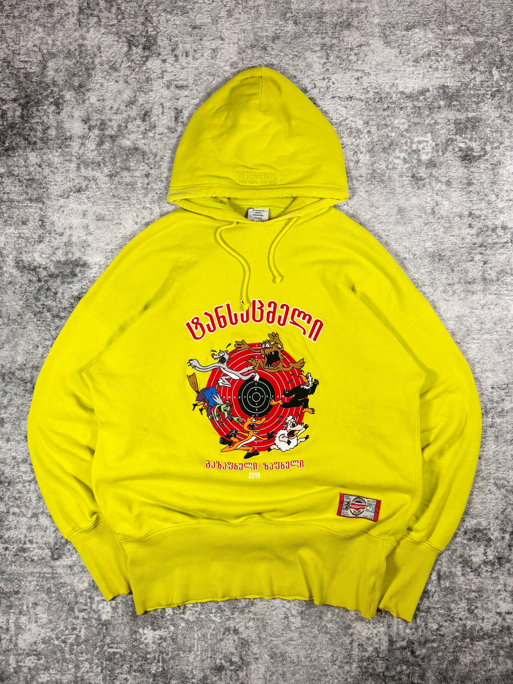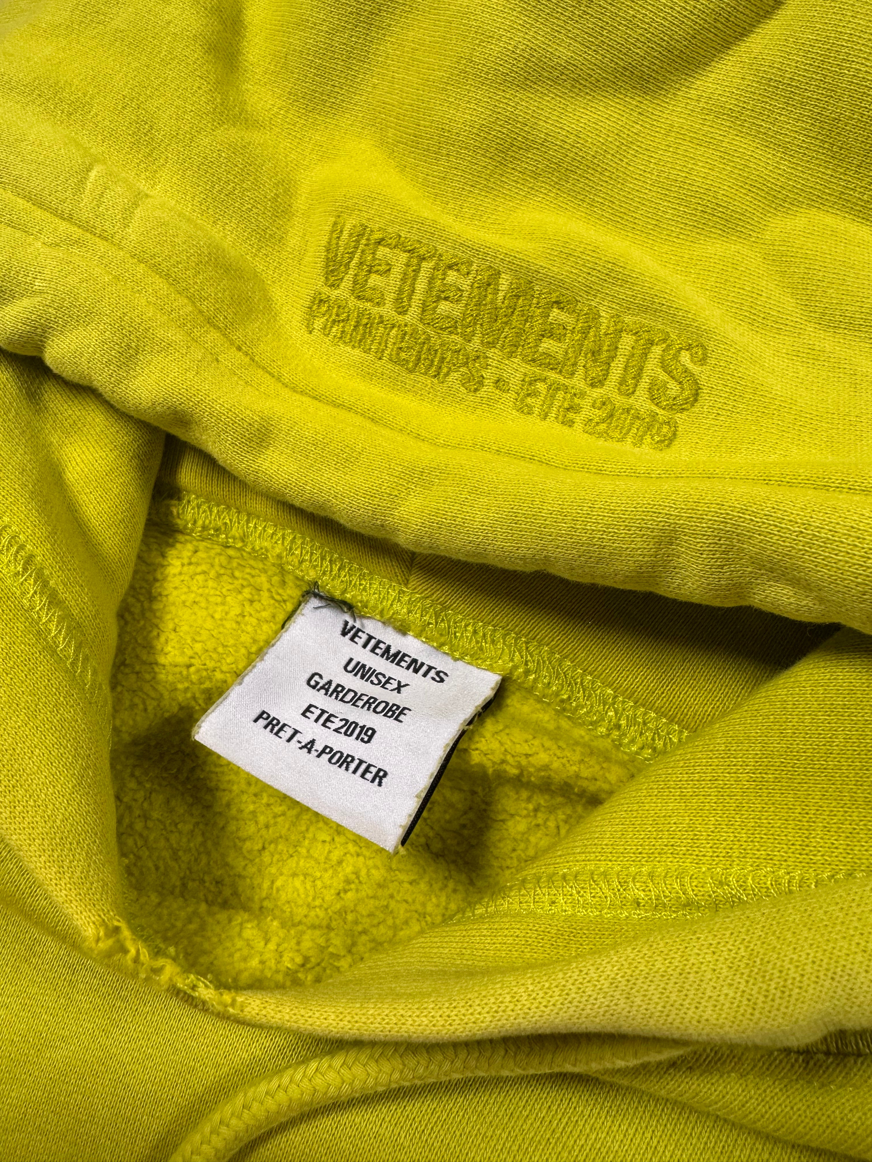 Showcased is a Vetements hoodie with an oversized silhouette released in the Spring/Summer 2019 collection. Coming in the neon green color way, the front graphic features cartoon characters running away from a witch, with different terms above and below the graphic written in a unique font. Vetements partnered with White Label AR to make this t shirt graphic come to life using the AR app (don’t think it’s available anymore on the App Store). In good condition with no major flaws, some discoloration due to aging