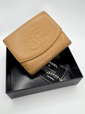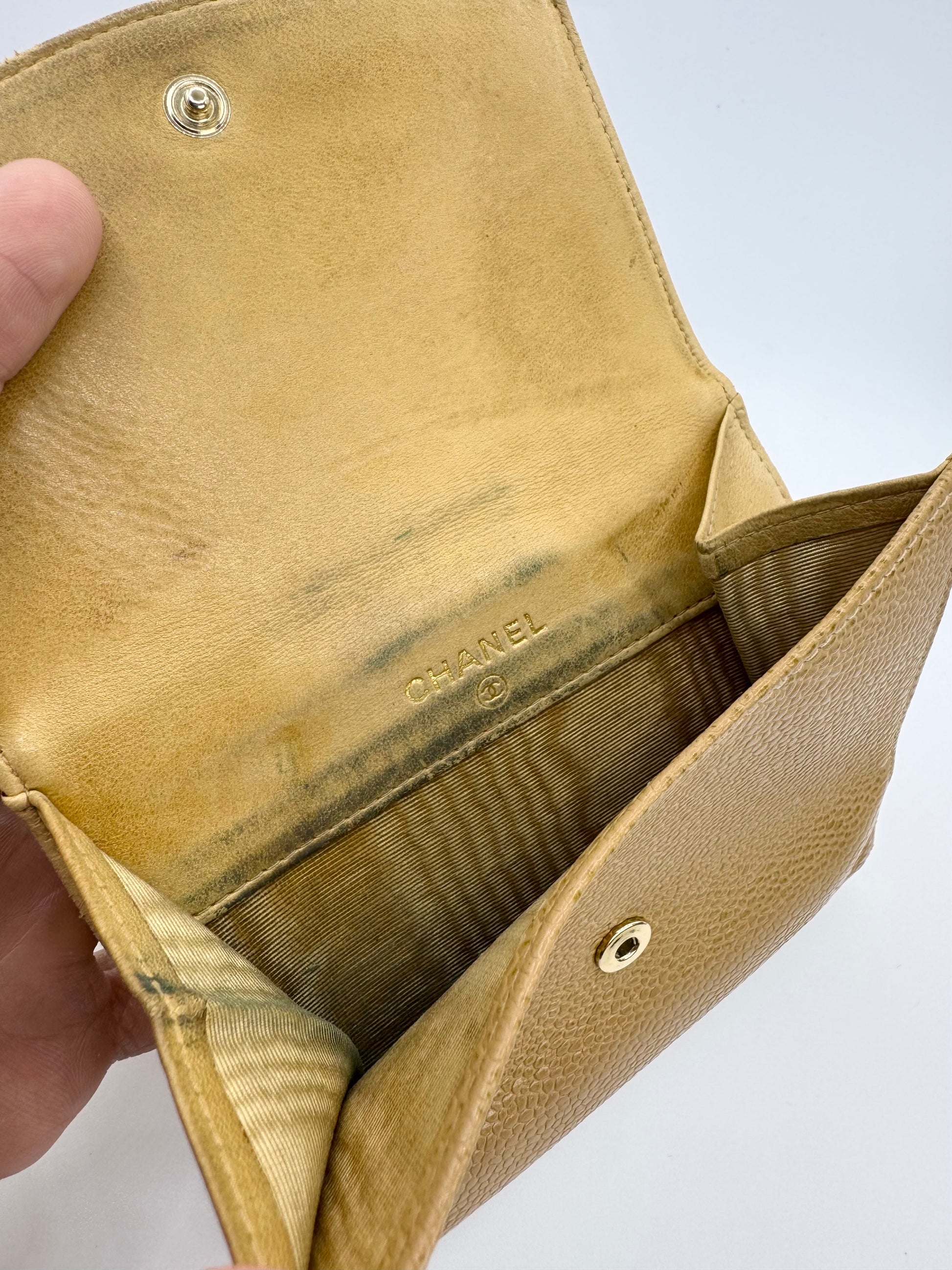 Vintage Chanel bi-fold wallet crafted from durable beige caviar leather, featuring the iconic embossed CC logo on the front flap. The interior reveals a functional multi-slot layout with a snap coin pouch and textured lining, designed for everyday organization. Comes with authentication card and original box, maintains solid condition for its age with no major damages (general aging on leather)