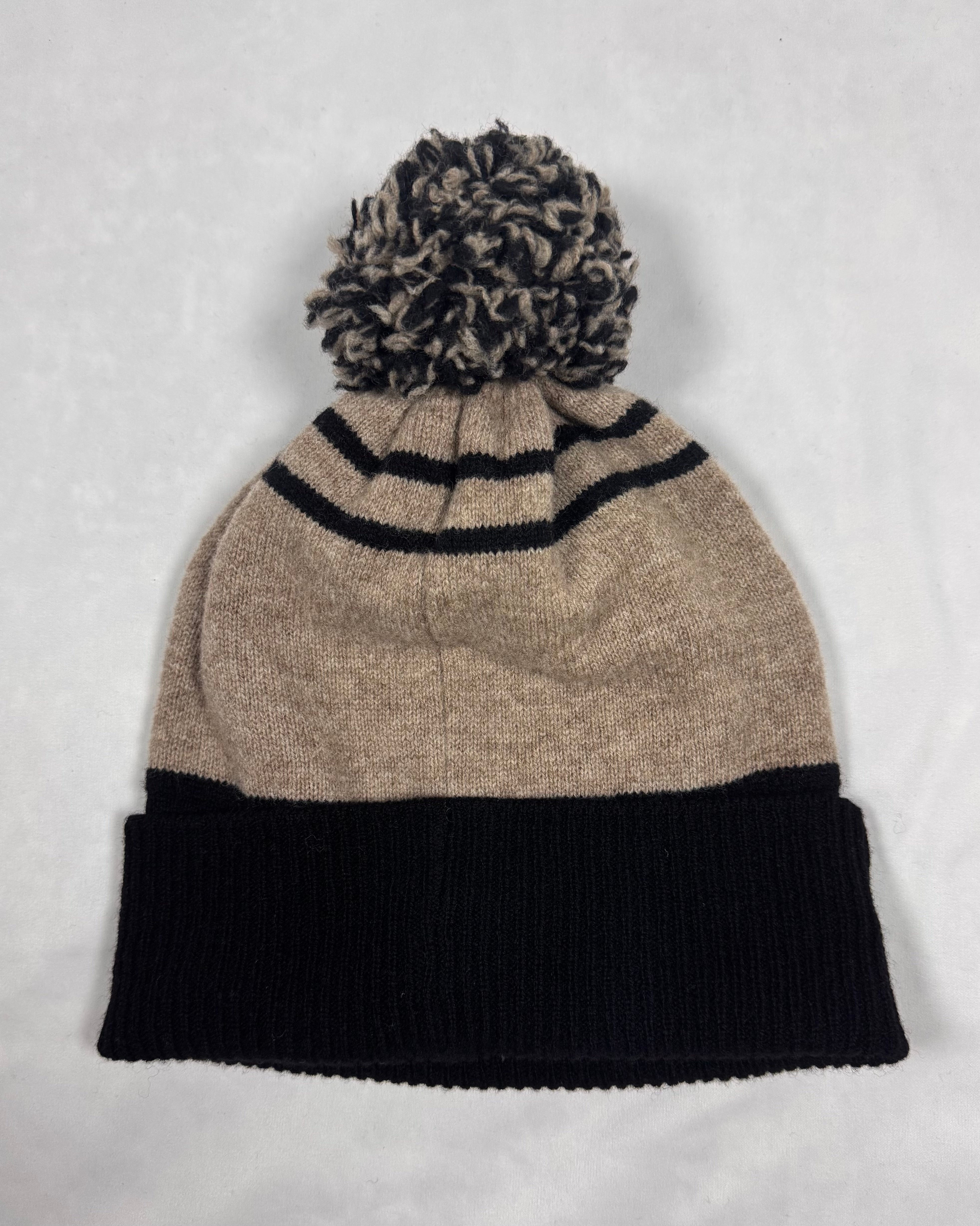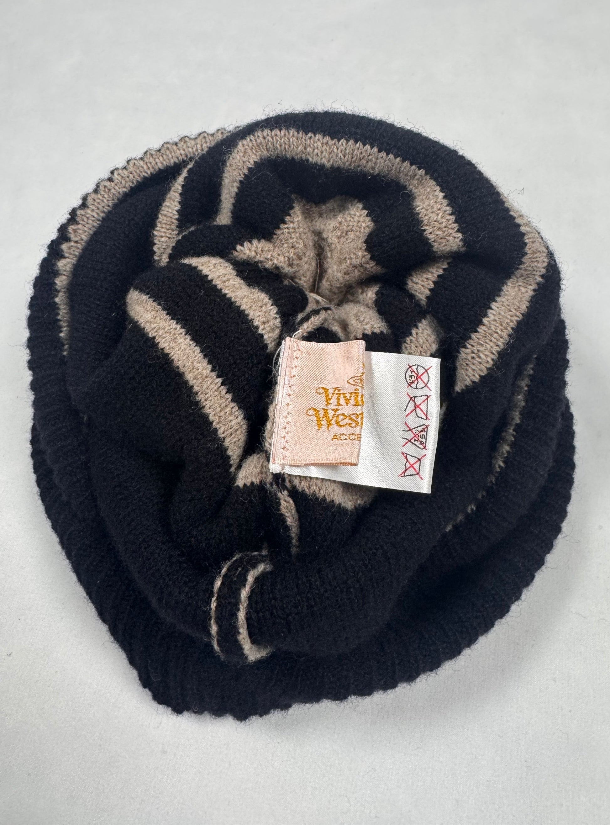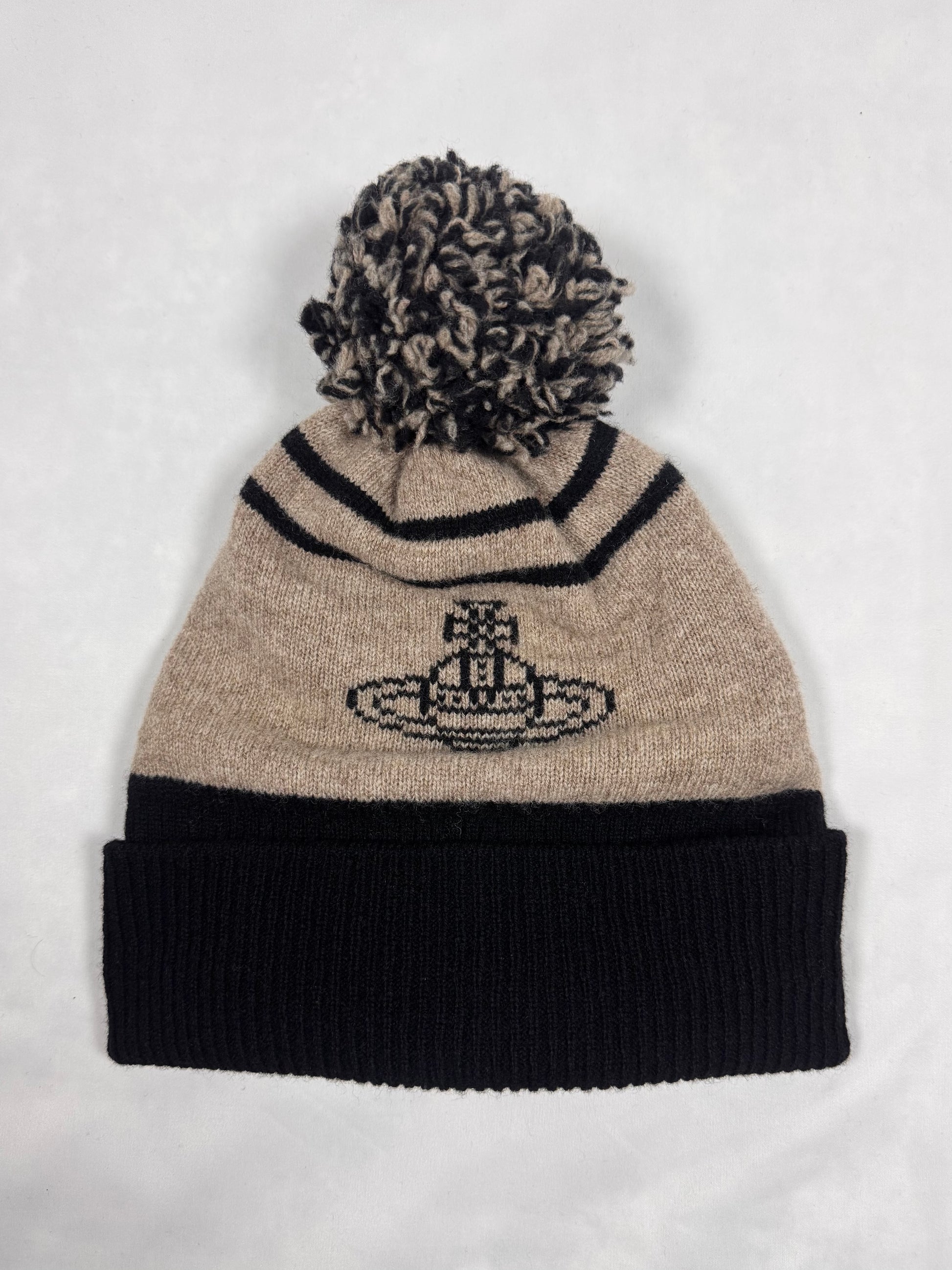 Lovely Vivienne Westwood beanie fully constructed out of wool with a pom-pom top. Part of a three-piece set, the beanie features border stripes at the top with the signature orb logo. In good condition with no major flaws or damages
