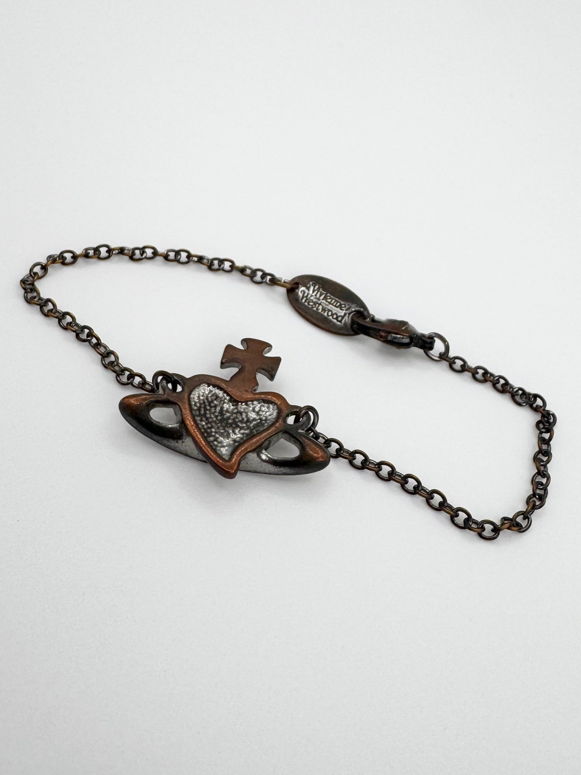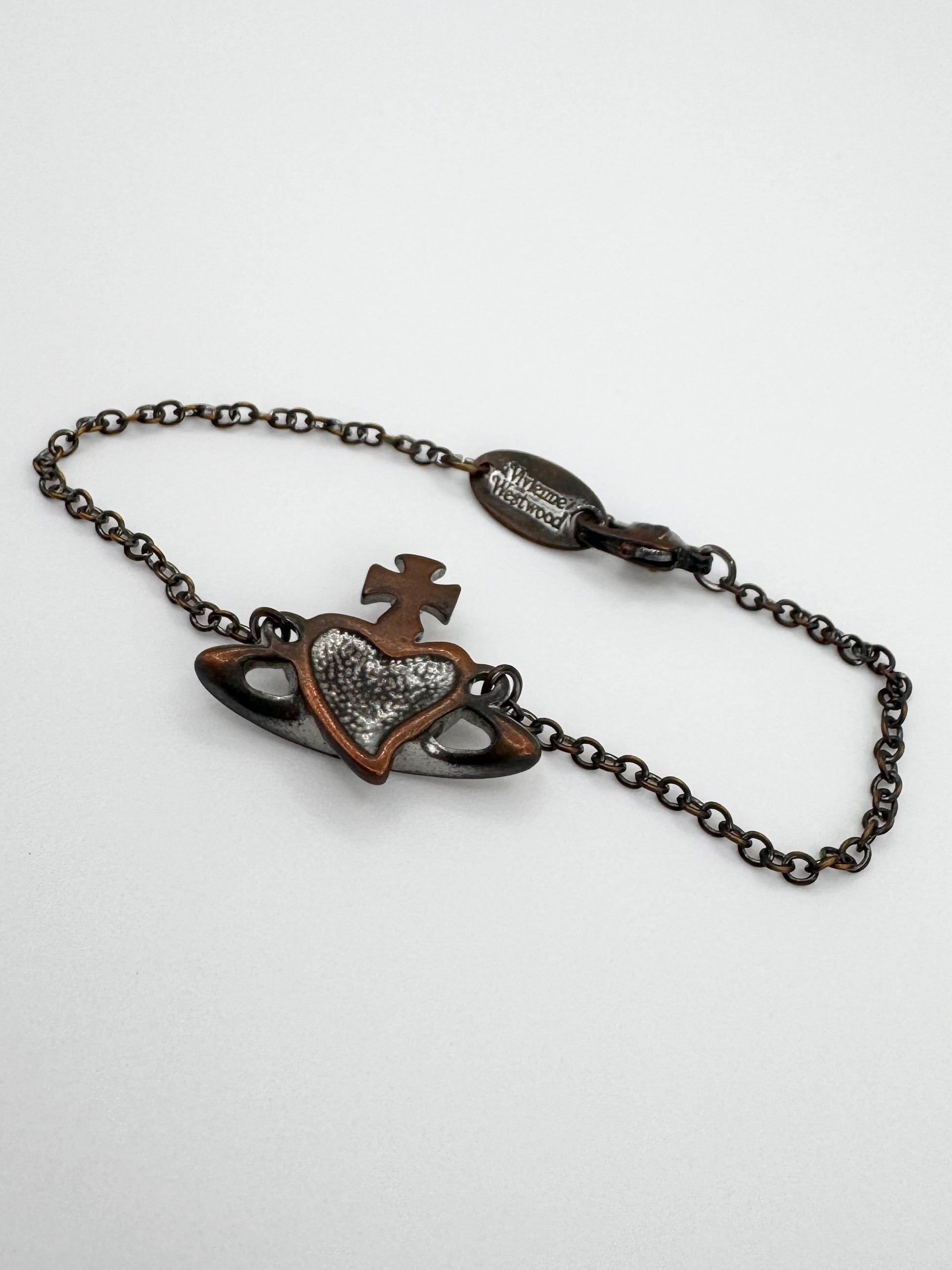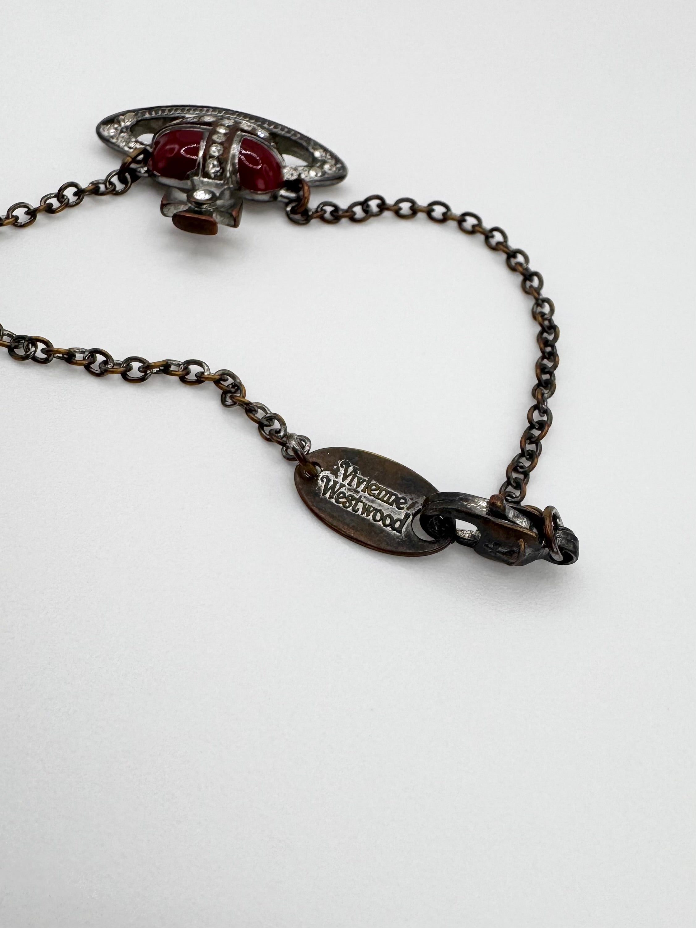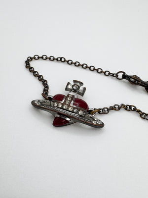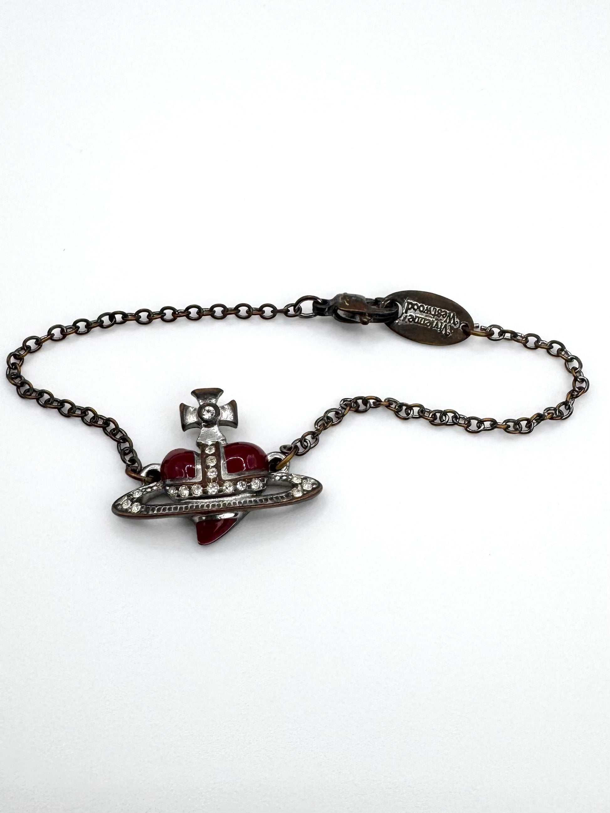 Gorgeous Vivienne Westwood bracelet featured the signature 'heart orb' pendant in red with a silver chain.Pendant is embossed with swavroski gems. In used condition with brass under-layer showing, but maintains good quality