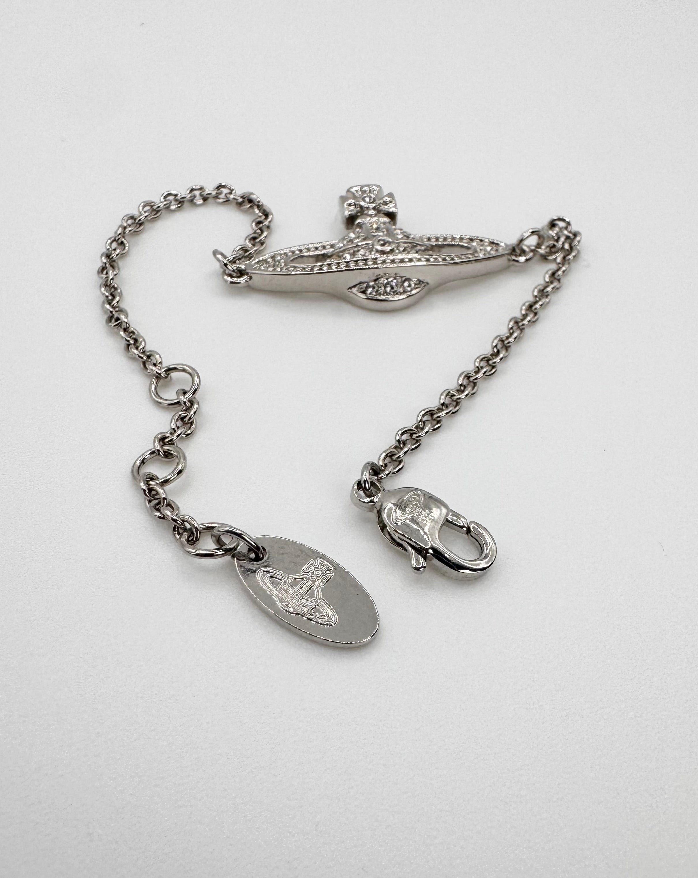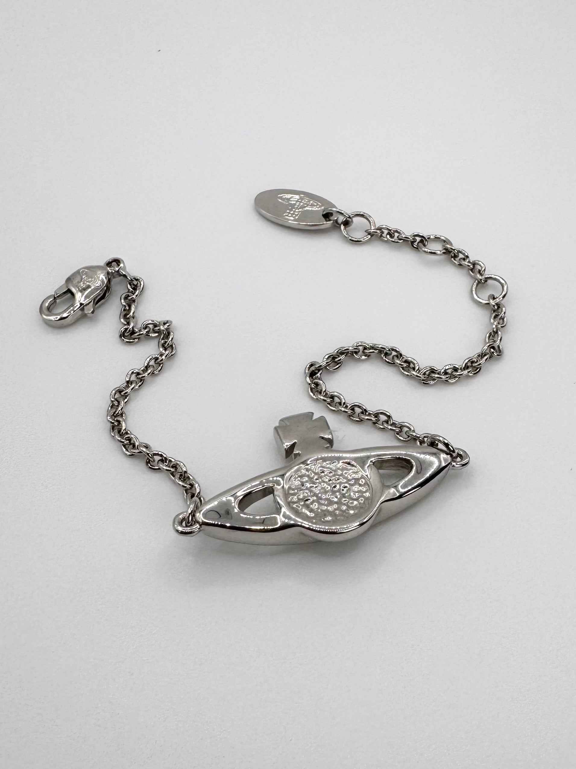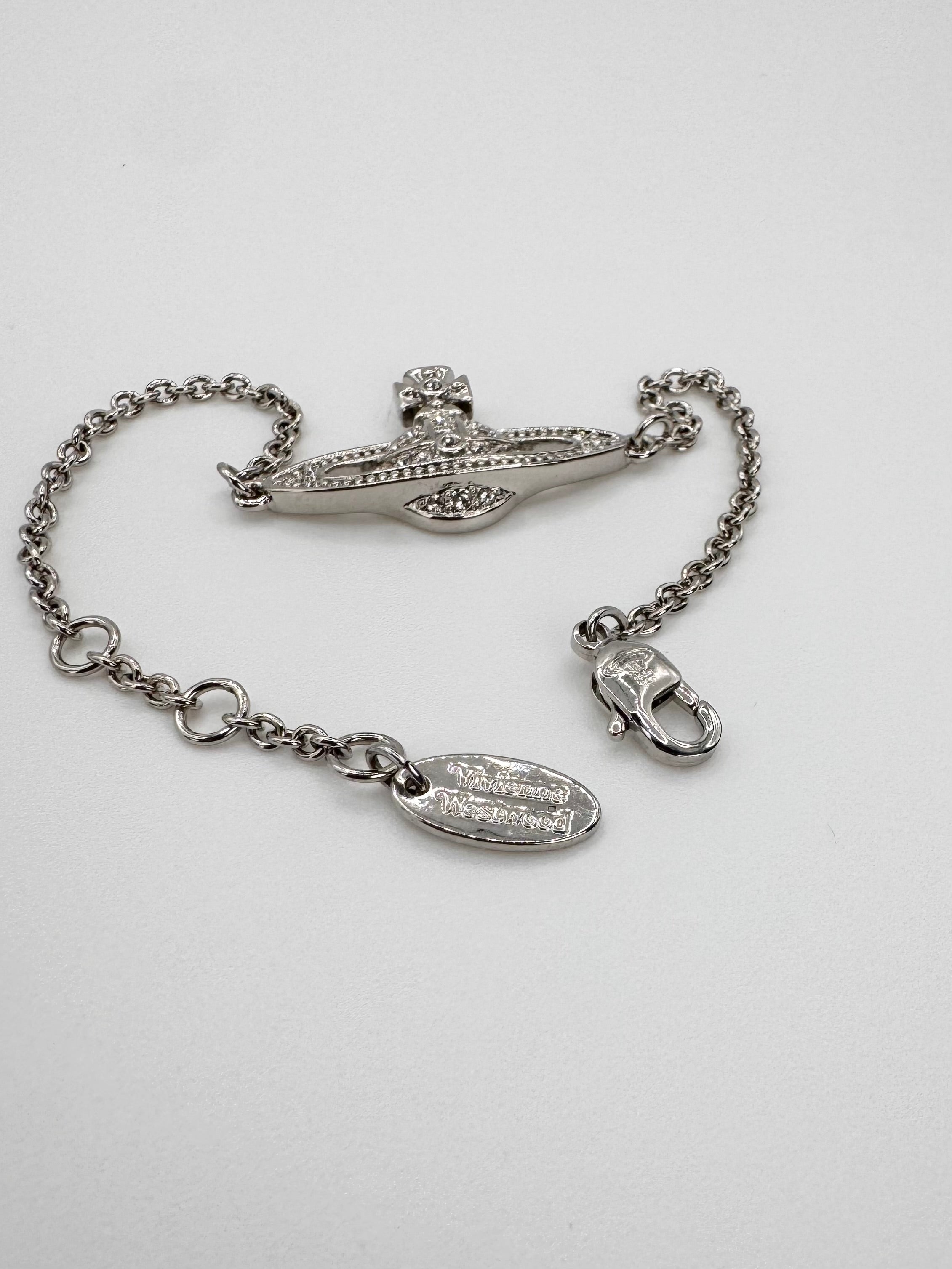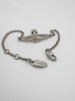 Lovely Vivienne Westwood bracelet coming in the signature silver; signature Saturn orb pendant with swavroski crystals embedded. In basically brand new condition with no flaws or damages