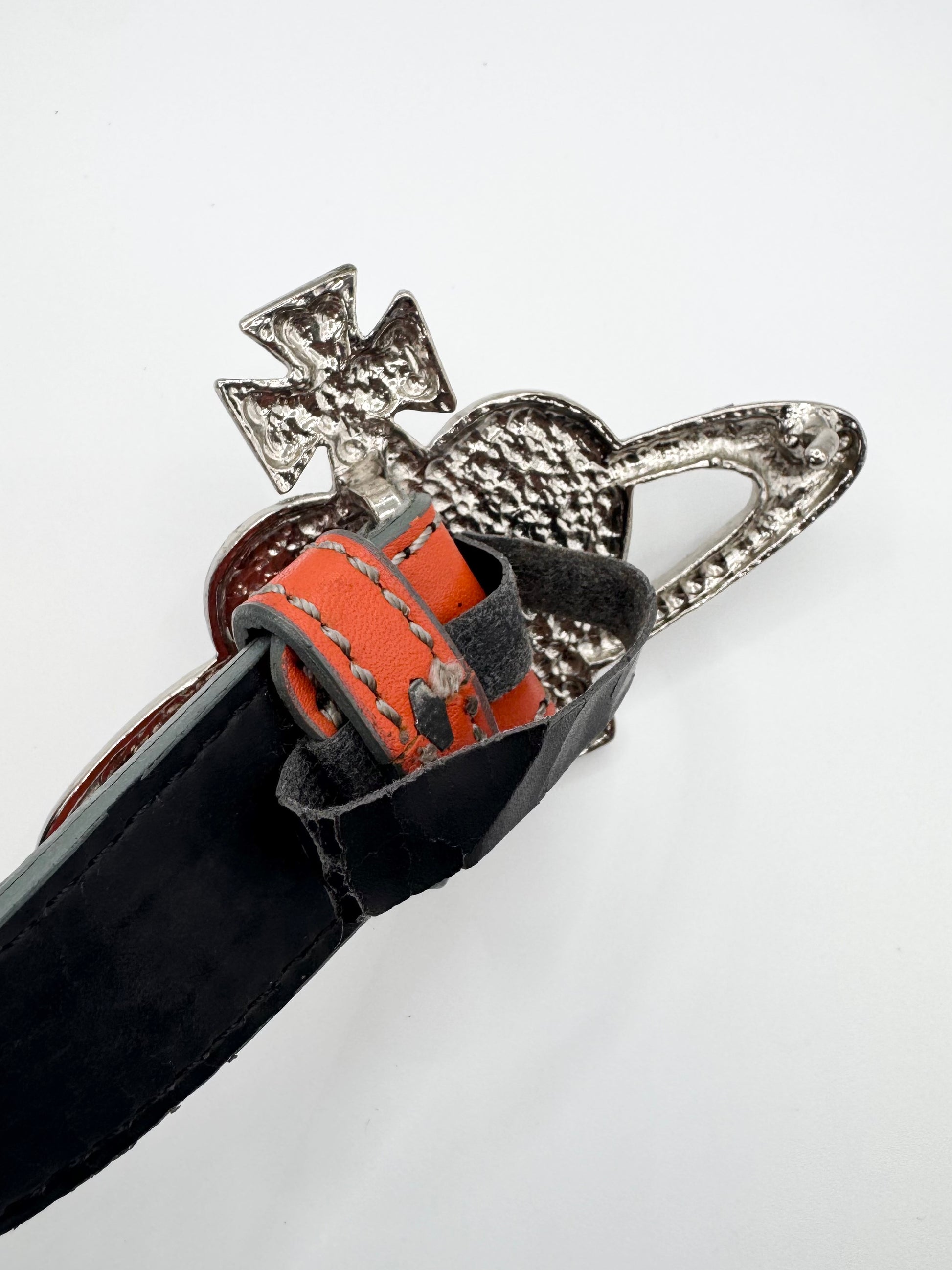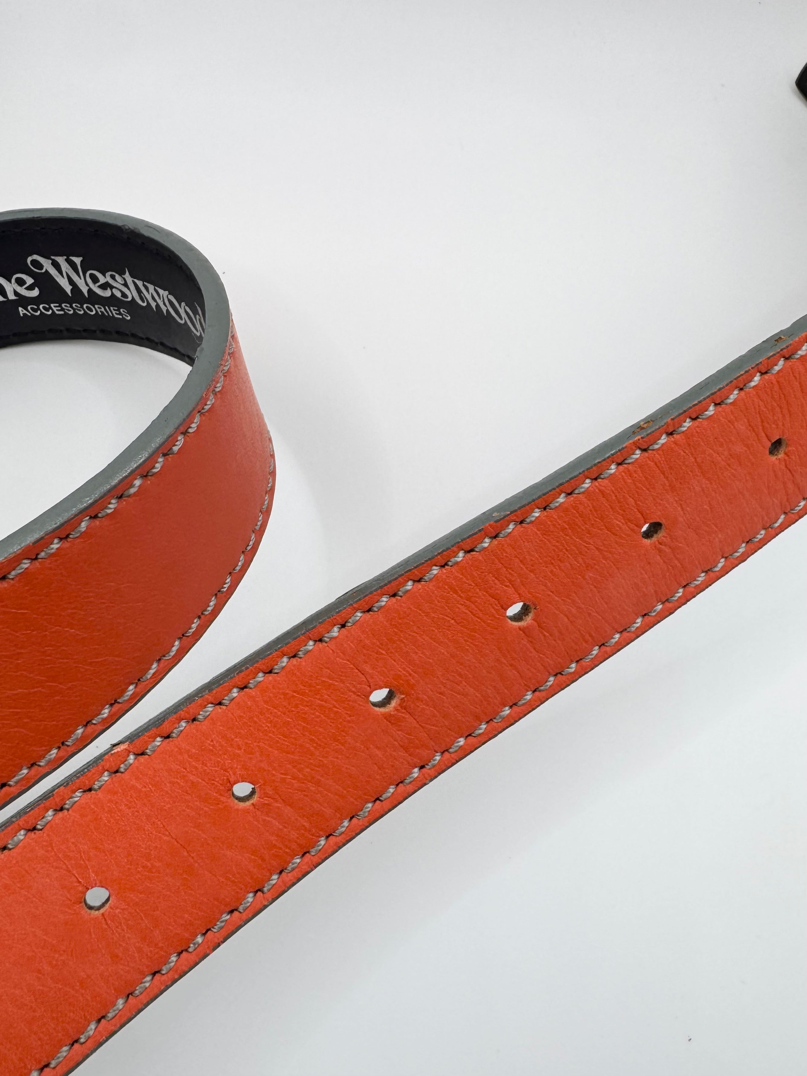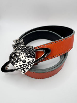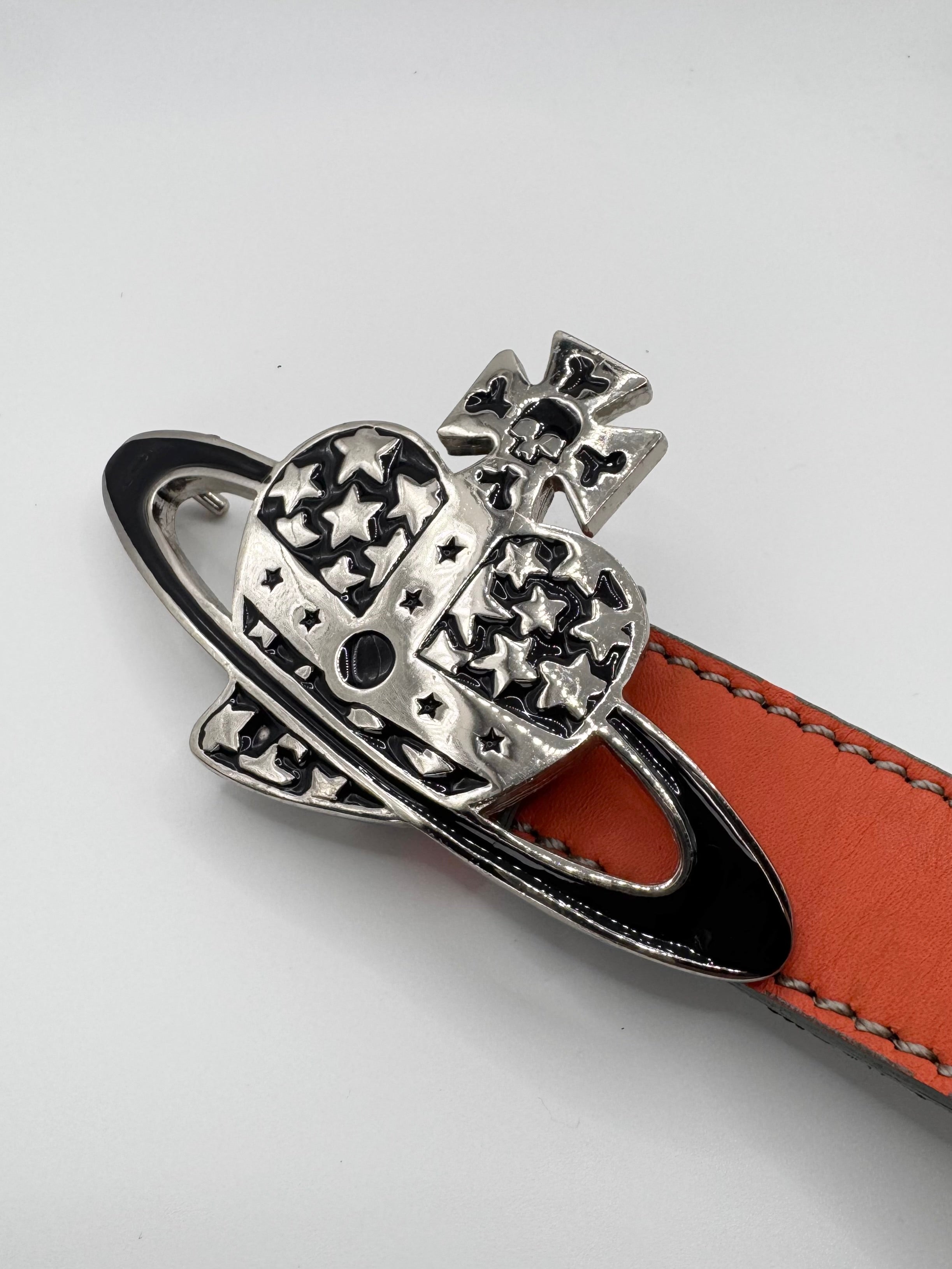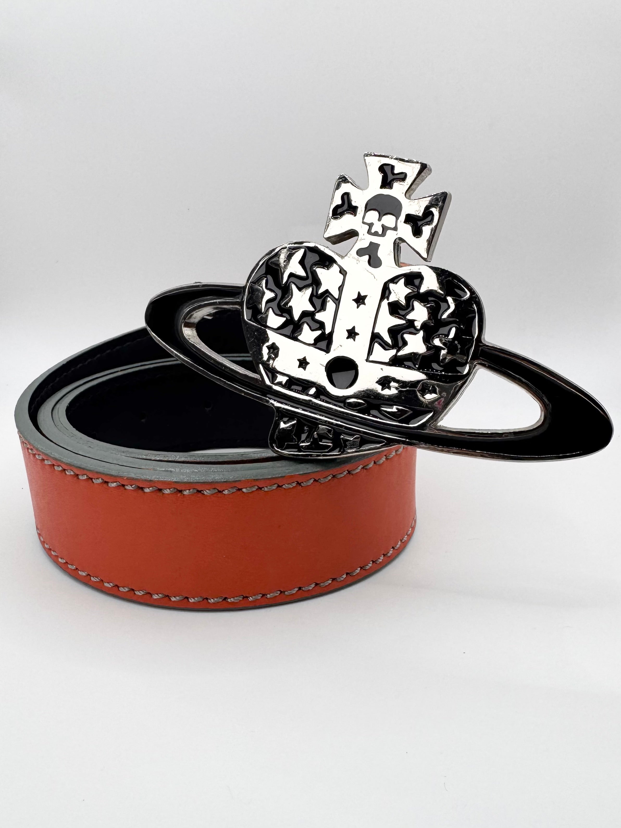 Stunning belt from the Vivienne Westwood accessories line, signature ‘heart orb’ shaped buckle with skull crown, fully flooded with stars. Orange leather belt with branding embossed in inner. In top condition with no flaws or damages (almost brand new)